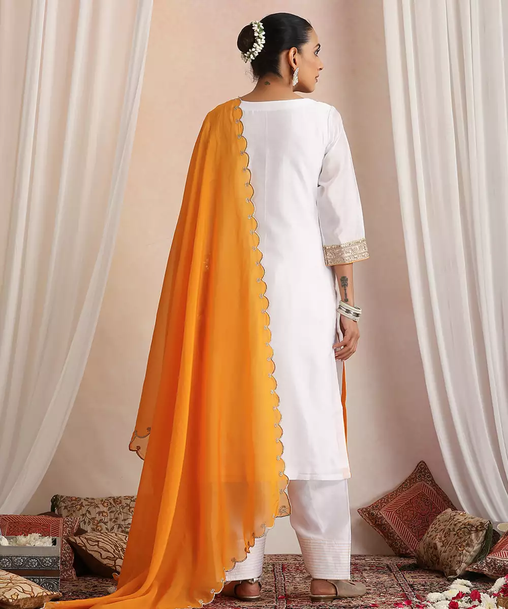 This Orange Embroidered Chanderi Kurta Set Exudes Classic Elegance With Its Subtle Sheen And Intricate Detailing. Crafted From Premium Chanderi Fabric, It Offers A Lightweight, Flowy Silhouette Perfect For Festive Occasions, Pujas, Or Daytime Celebrations. The Delicate Embroidery Enhances Its Refined And Graceful Appeal, Making It A Timeless Ethnic Staple.