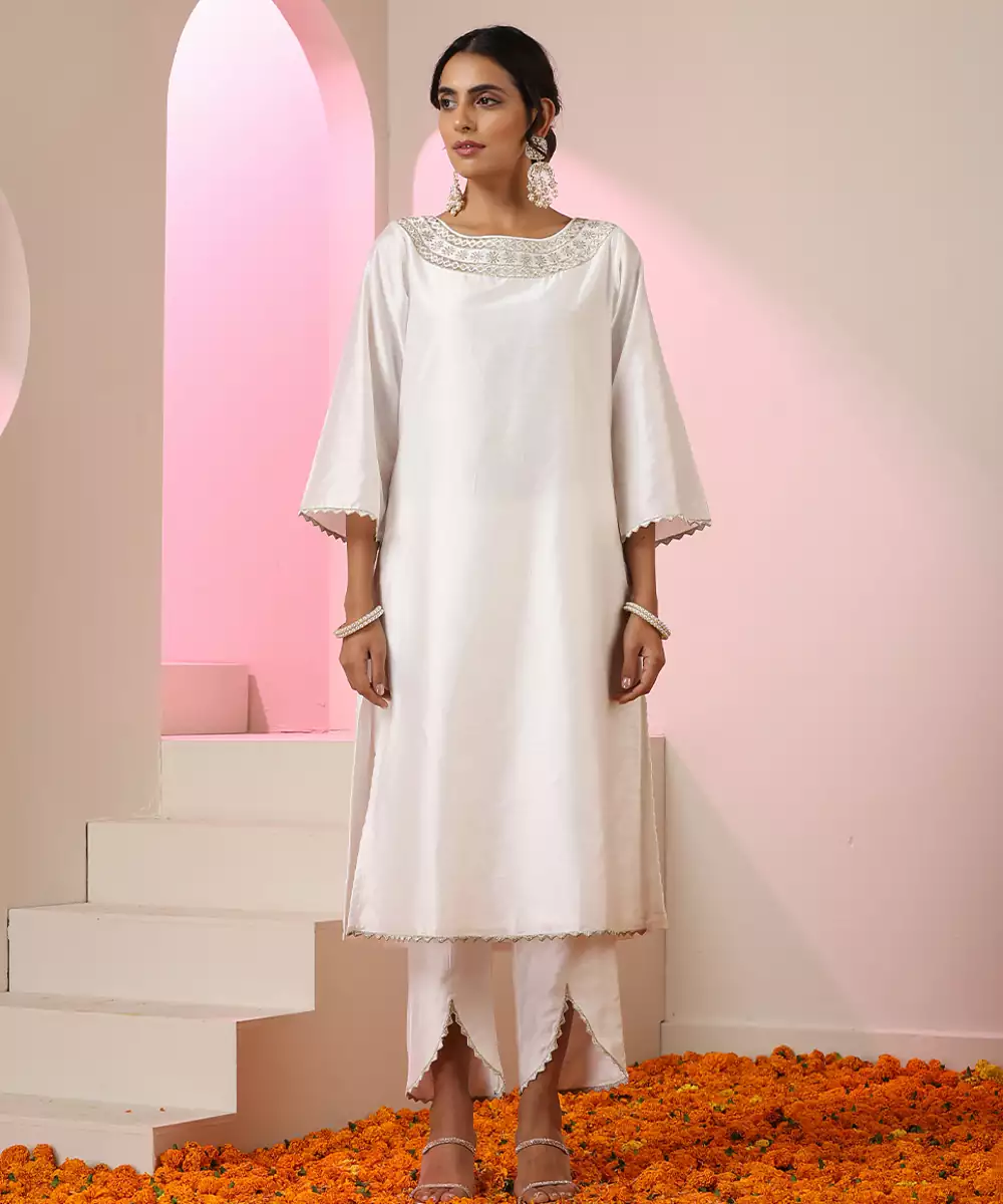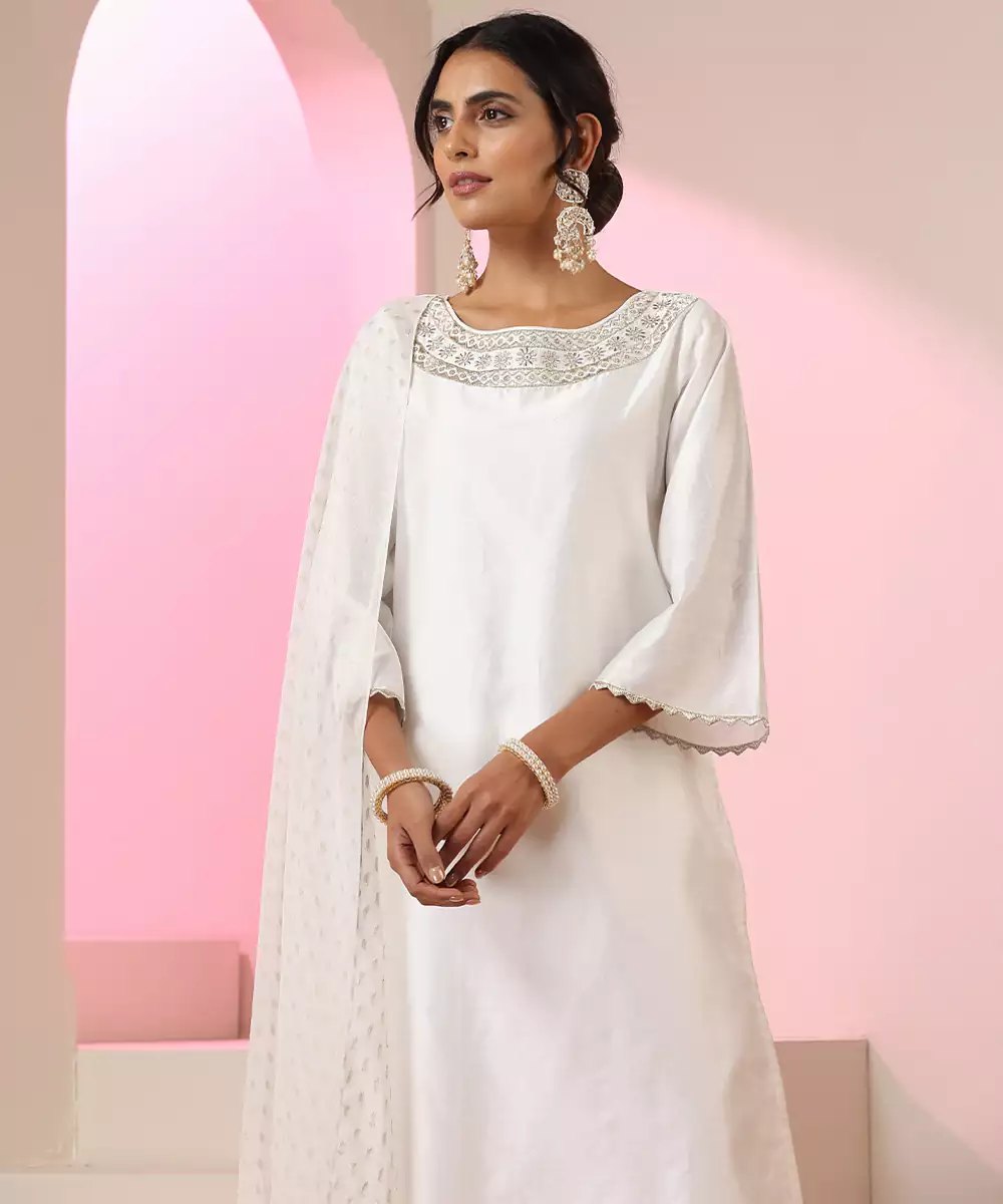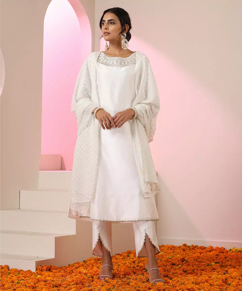 This White Plain Chanderi Kurta Set Exudes Timeless Elegance With Its Soft Sheen And Lightweight Texture. Crafted From Premium Chanderi Fabric, It Offers A Refined And Graceful Silhouette. Perfect For Festive Occasions, Daytime Events, Or Traditional Gatherings, This Set Blends Simplicity With Sophistication For An Effortlessly Stylish Look.