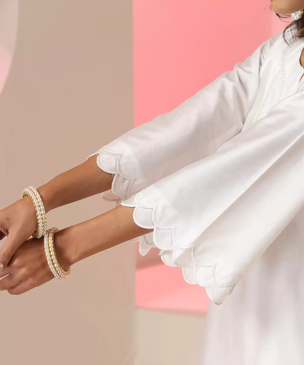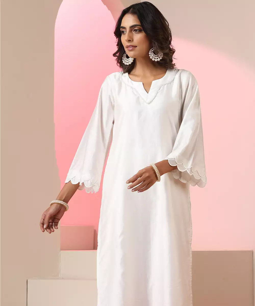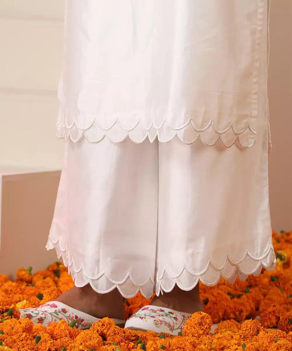 This White Plain Chanderi Kurta Set Exudes Timeless Elegance With Its Soft Sheen And Lightweight Texture. Crafted From Premium Chanderi Fabric, It Offers A Refined And Graceful Silhouette. Perfect For Festive Occasions, Daytime Events, Or Traditional Gatherings, This Set Blends Simplicity With Sophistication For An Effortlessly Stylish Look.