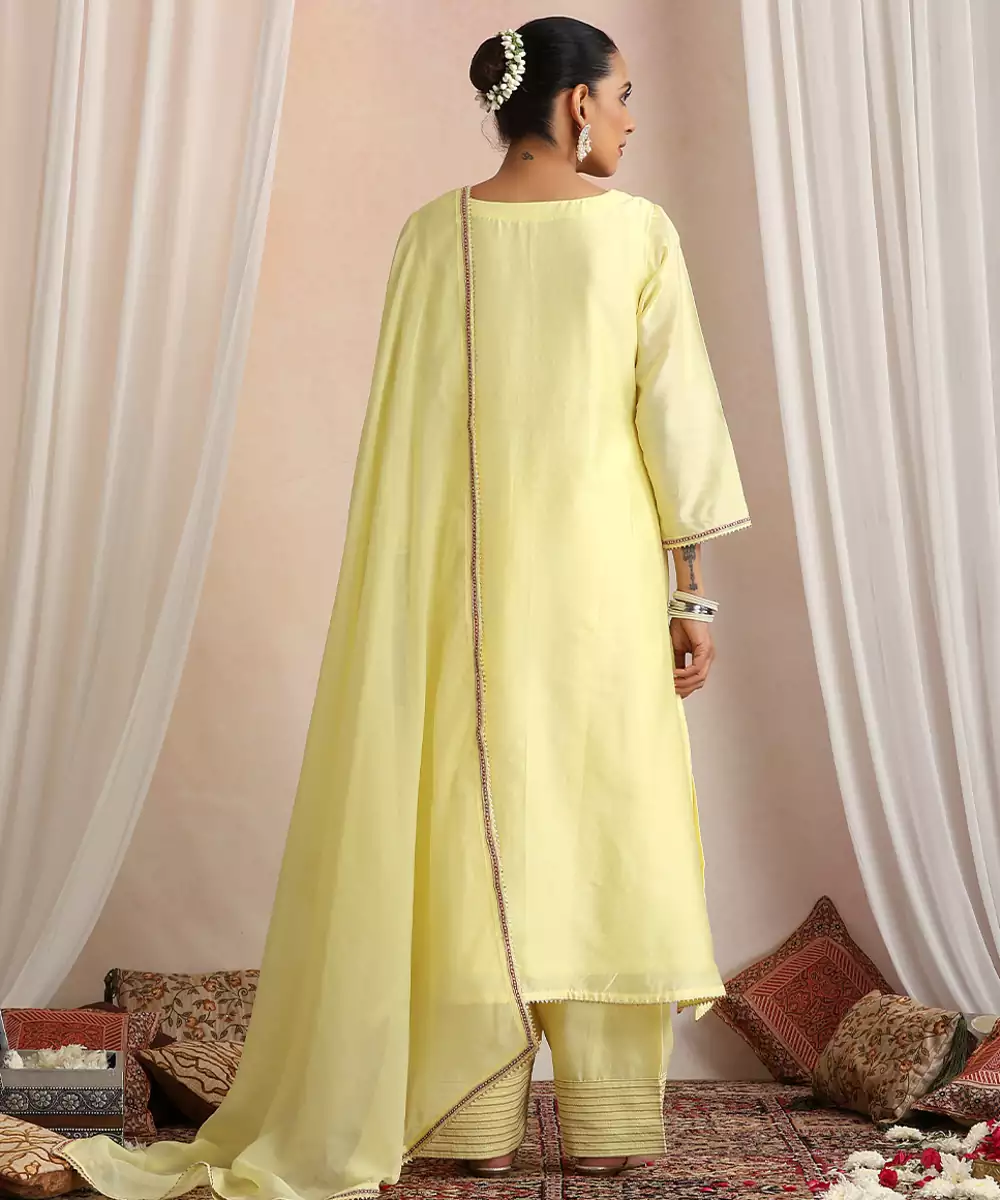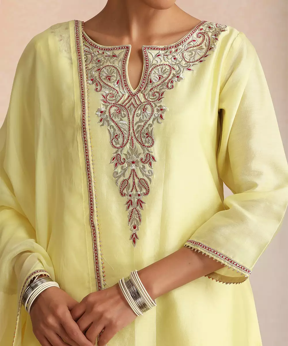 This Yellow Embroidered Chanderi Kurta Set Exudes Classic Elegance With Its Subtle Sheen And Intricate Detailing. Crafted From Premium Chanderi Fabric, It Offers A Lightweight, Flowy Silhouette Perfect For Festive Occasions, Pujas, Or Daytime Celebrations. The Delicate Embroidery Enhances Its Refined And Graceful Appeal, Making It A Timeless Ethnic Staple.