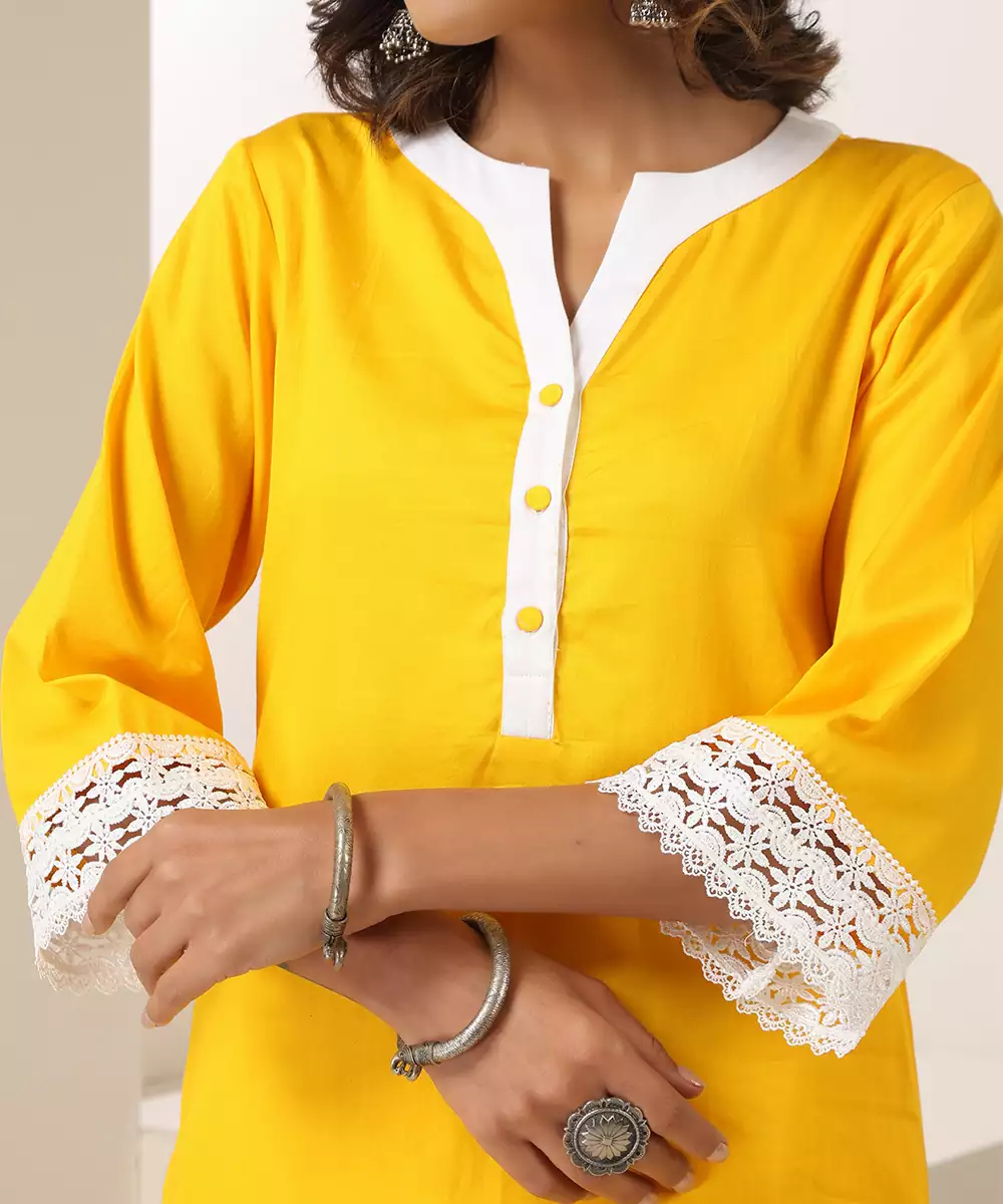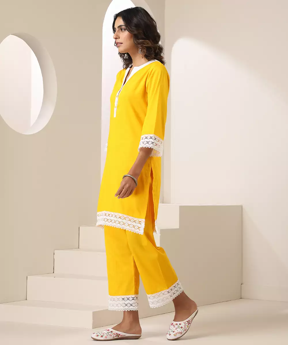 This Yellow Plain Cotton Kurta Set Offers A Blend Of Simplicity And Everyday Elegance. Made From Soft, Breathable Cotton, It Ensures All Day Comfort. The Minimal Design And Vibrant Red Color Create A Refined Look Suitable For Casual Outings, Festive Events, Or Family Gatherings, Making It A Versatile Wardrobe Essential.