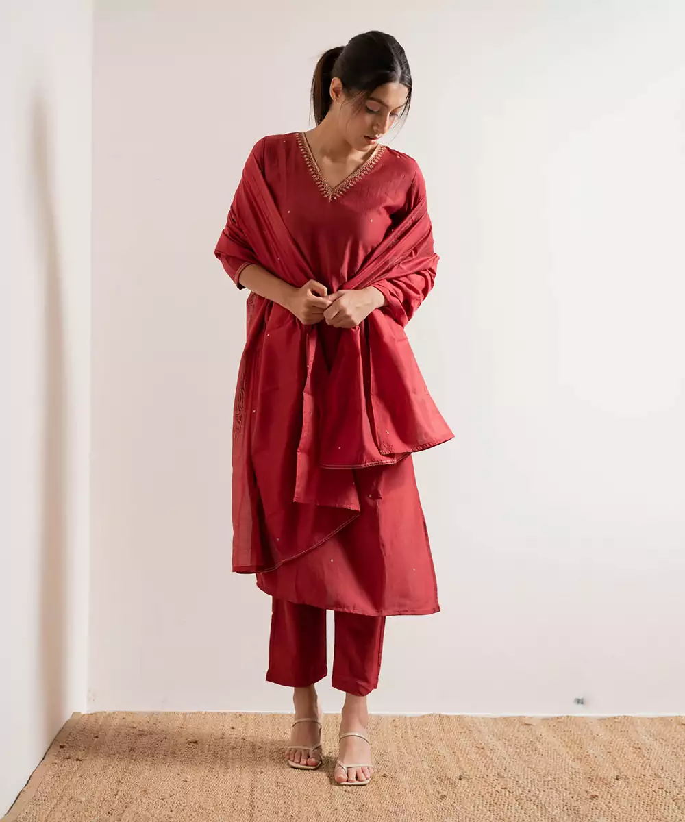 Tomato Red Gul, Zardozi Hand Work Straight Fit Suit Set.