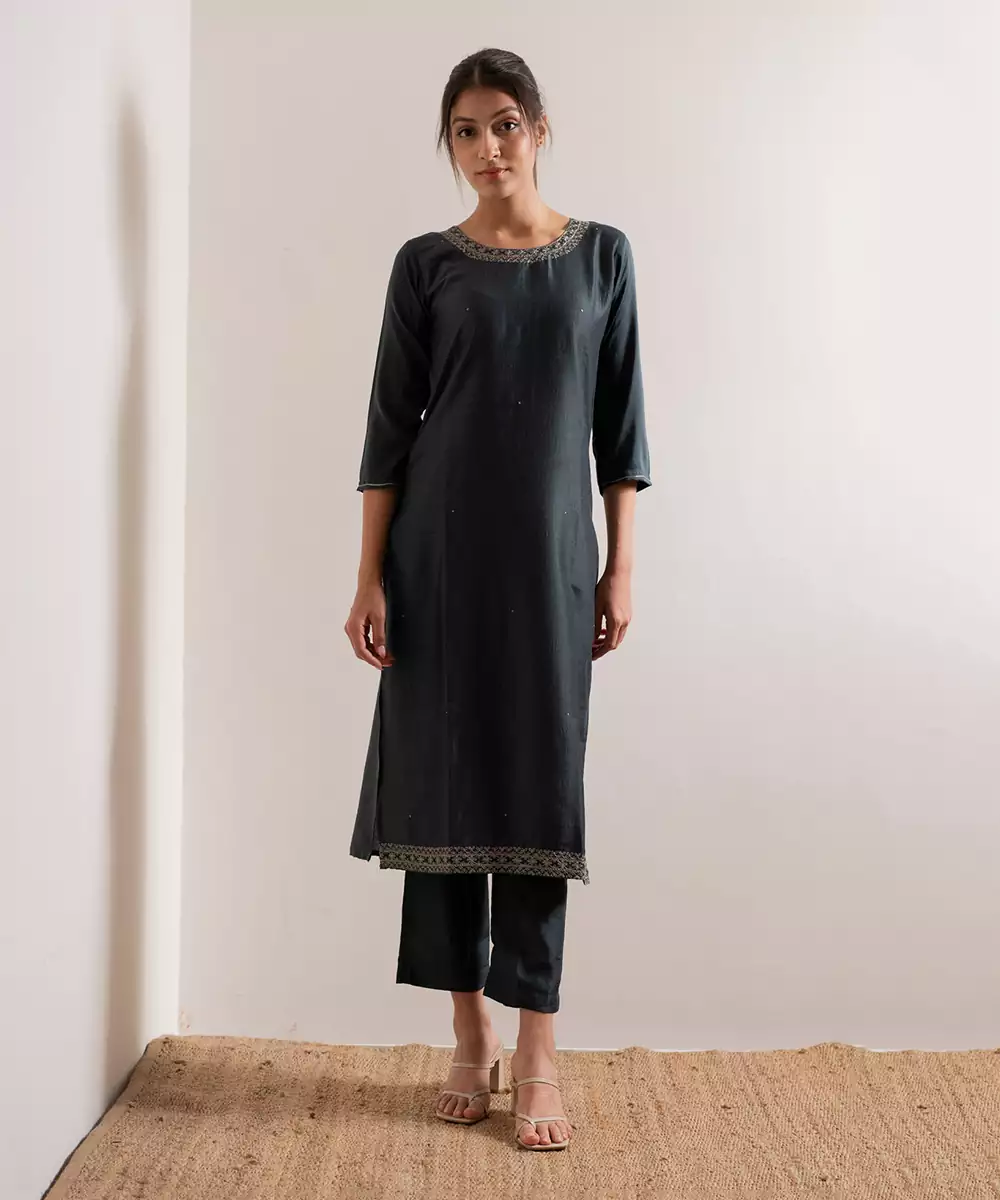Olive Green Embroidered Jute Jacket With Kurta & Pant