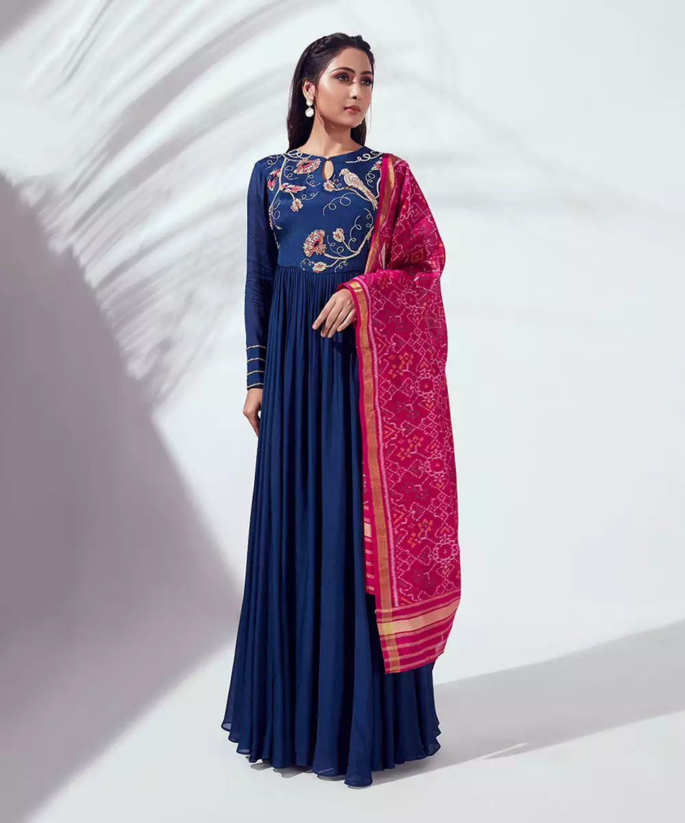 Blue Flared Anarkali Set With Crew Neckline And Full Sleeve. Yoke With Hand Embroidery In Zardosi. Patola Dupatta In Pink (Design May Vary According To The Availability.Color Will Remain The Same) Back Opening With Hooks And Zipper Opening. Padded. Fully Lined. Flare Pleated At The Waist.