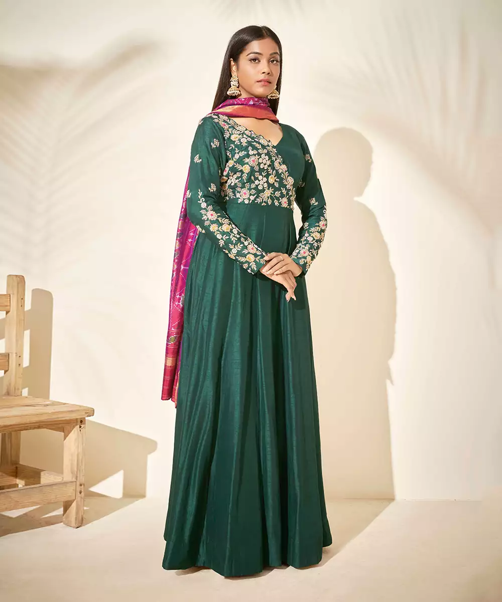 Handcrafted In Zardosi. V Neck Anarkali With Elegantly Embroidered Yoke And Sleeve With Contrasting Thread Work Details. Padded Fully Lined. Back Cut Out With Hook And Zipper Opening. Patola Dupatta ( Similar Patola Dupatta Will The Provided).