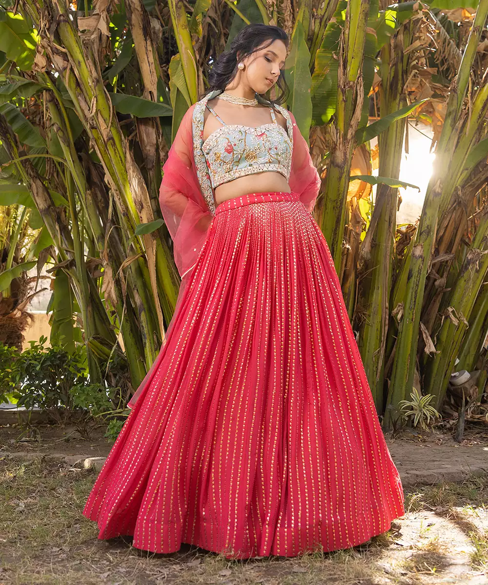 Elegantly Hand Embroidered Blouse With Intricate Details. Skirt Pleated At The Waist With Drawstring Closing. Dupatta With Buti And Border. Blouse Opening At The Back With Hook And Drawstring Opening. Padded