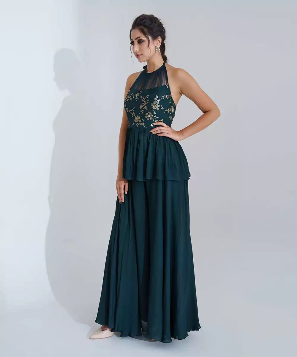Floral Embroidered Peplum Set With Pleating Details Over The Neckline.
