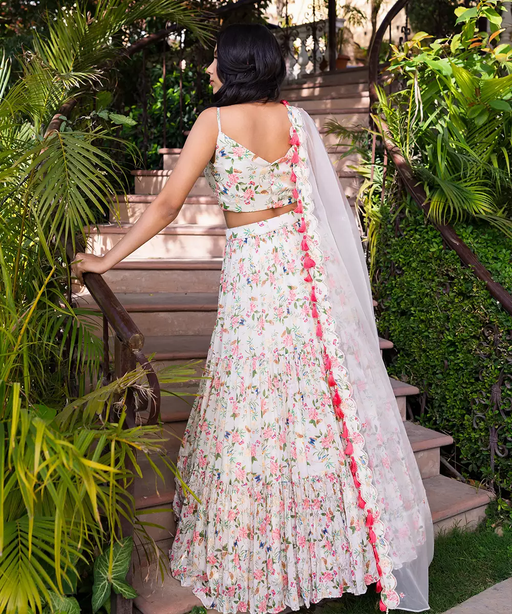 A Beautifully Embroidered Blouse Paired With 3 Tier Flared Lehenga. The Skirt Is Fully Flared With Embriodery On The Last Panel. This Set Is Paired With Organza Dupaata Having Embroidery On One Side Cut Work Details And Tassels. Padded. Fully Lined. Dupatta With Tassels. Blouse Back Hook Opening