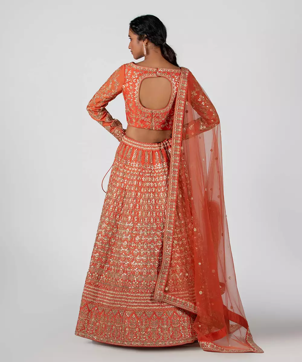 Rust Orange Bridal Lehenga In Gota Work With Stunning Mix Of Floral And Geometric Motifs. This Bridal Lehenga Set Is A Unique Hand Embroidered Ensemble. Padded
