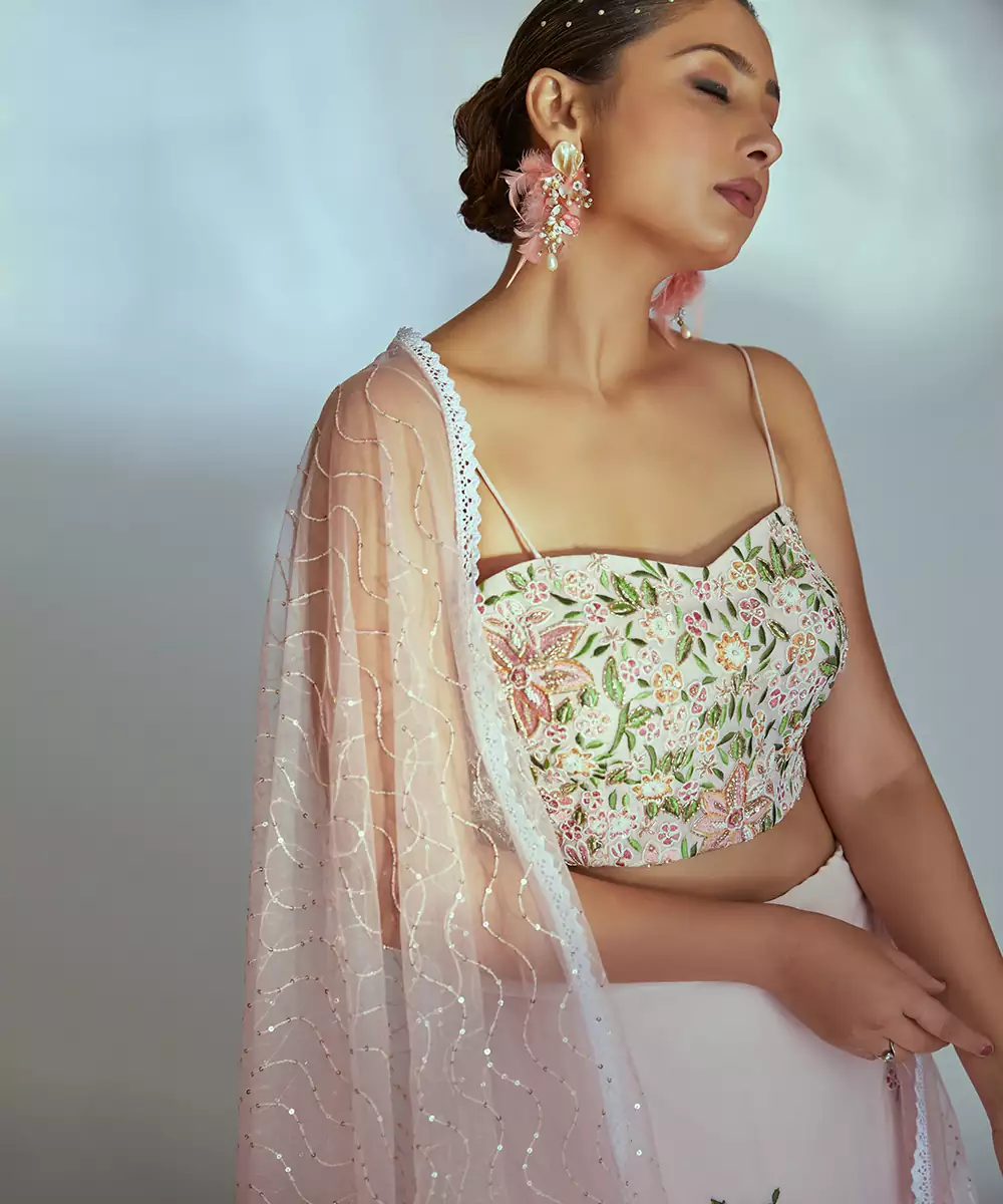 Thread And Hand Embroidered Bustier With Elegant Details. Paired With Thread Embroidered Skirt Tied With Drawstring. Net Embroidered Dupatta With Thin Taping Border. Padded