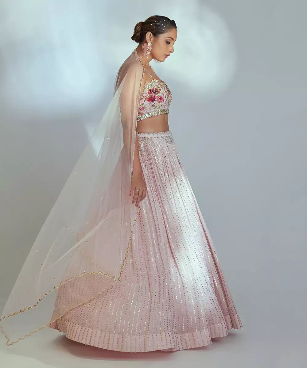 Hand Embroidered Bustier With Elegant Details. Paired With Thread Embroidered Skirt Tied With Drawstring. Ruffle Dupatta In Ombre