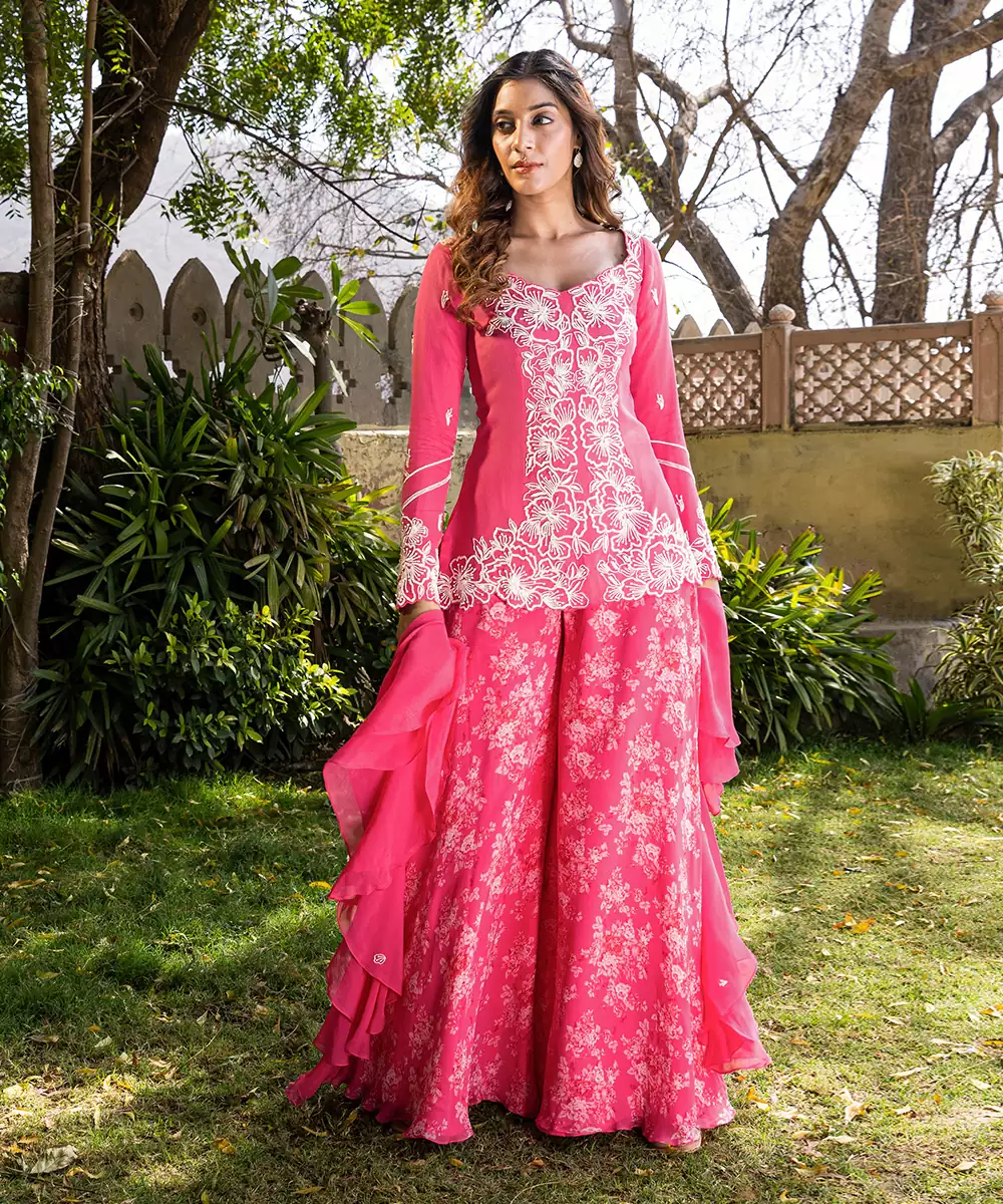 A Beautiful Short Kurta With Flare Pants. This Flawless Three Piece Set In Crafted With Inricate Handwork Details. Ruffle Dupatta Padded Fully Lined Back Hook And Zipper Opening.