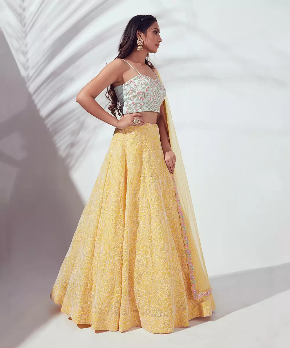 Hand Embroidered Bustier With Elegant Details. Paired With Thread Embroidered Skirt Tied With Drawstring. Dupatta With Borders On Two Sides. Padded