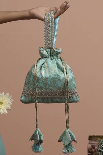 Cream And Gold Buti Silk Potli Bag Colour: Beige Material: Silk Components : 1 Potli Bag