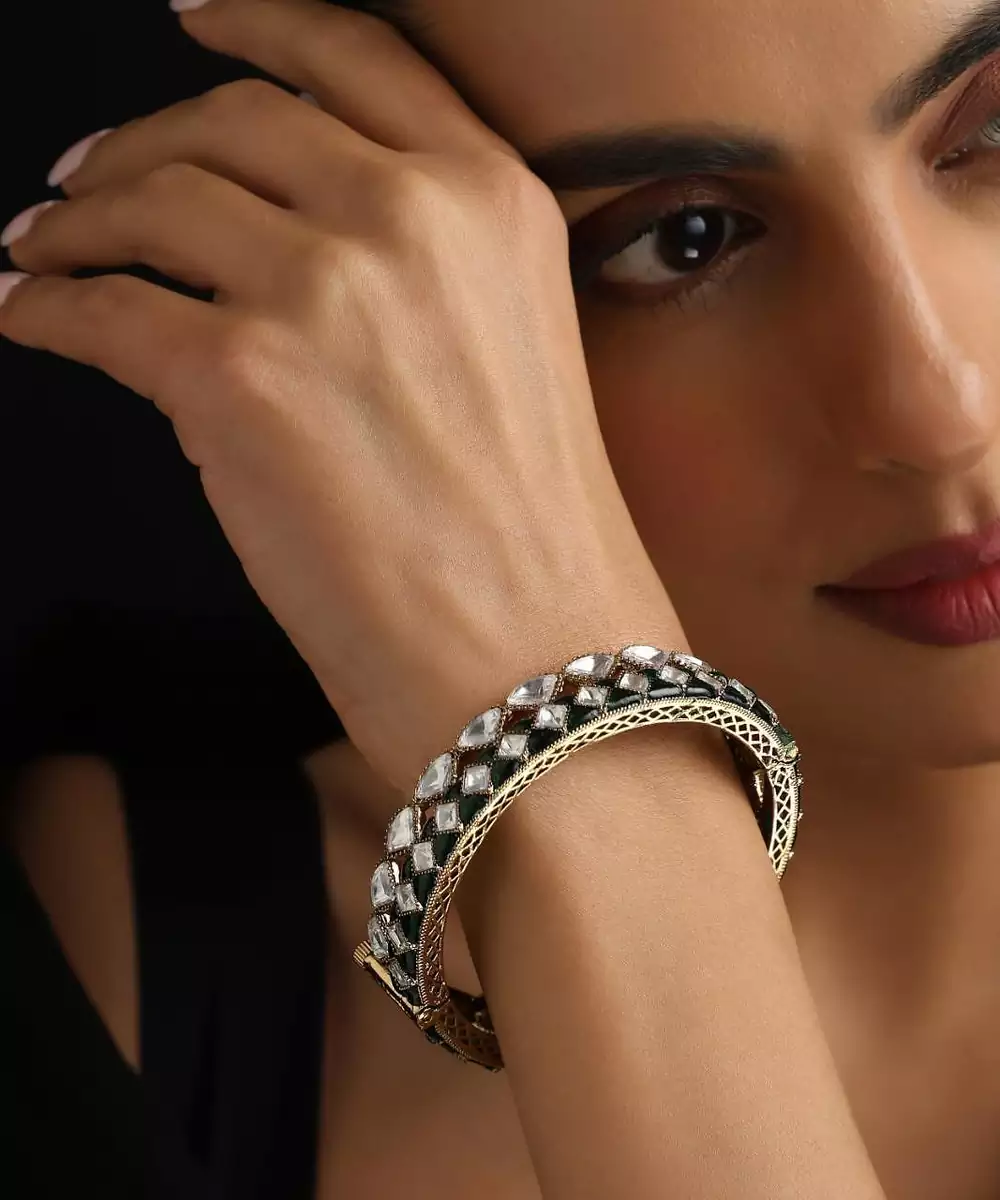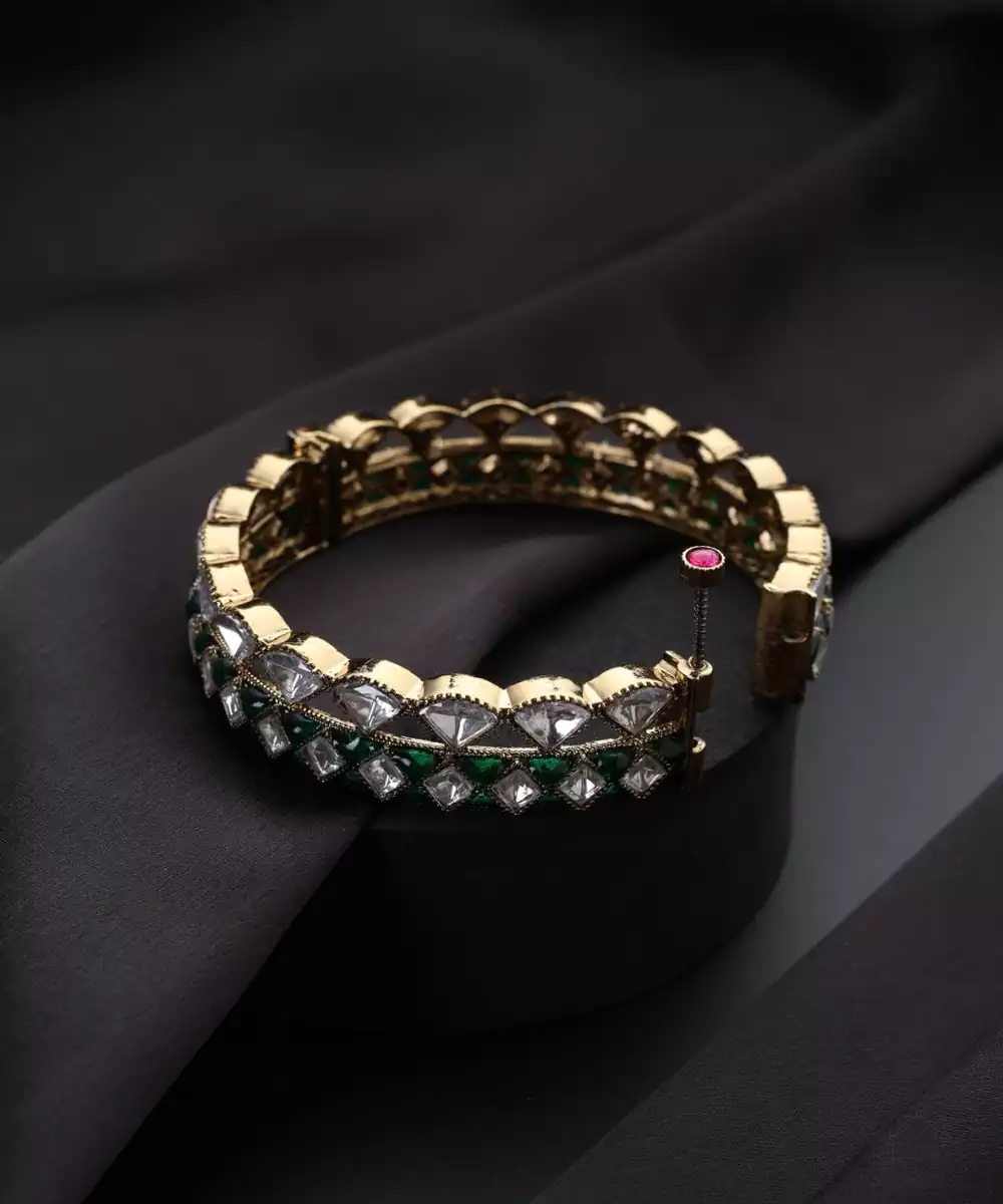 These Gold Plated Green Stone Polki Bracelets Are A Perfect Blend Of Elegance And Tradition. Adorned With Intricate Polki Work And Striking Green Stones, They Exude A Regal Charm. The Rich Gold Plating Adds A Luxurious Finish, Making Them Ideal For Weddings, Festive Occasions, And Special Celebrations, Complementing Both Ethnic And Contemporary Outfits.