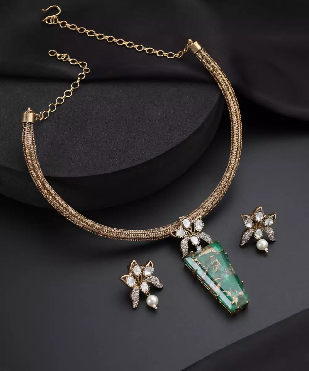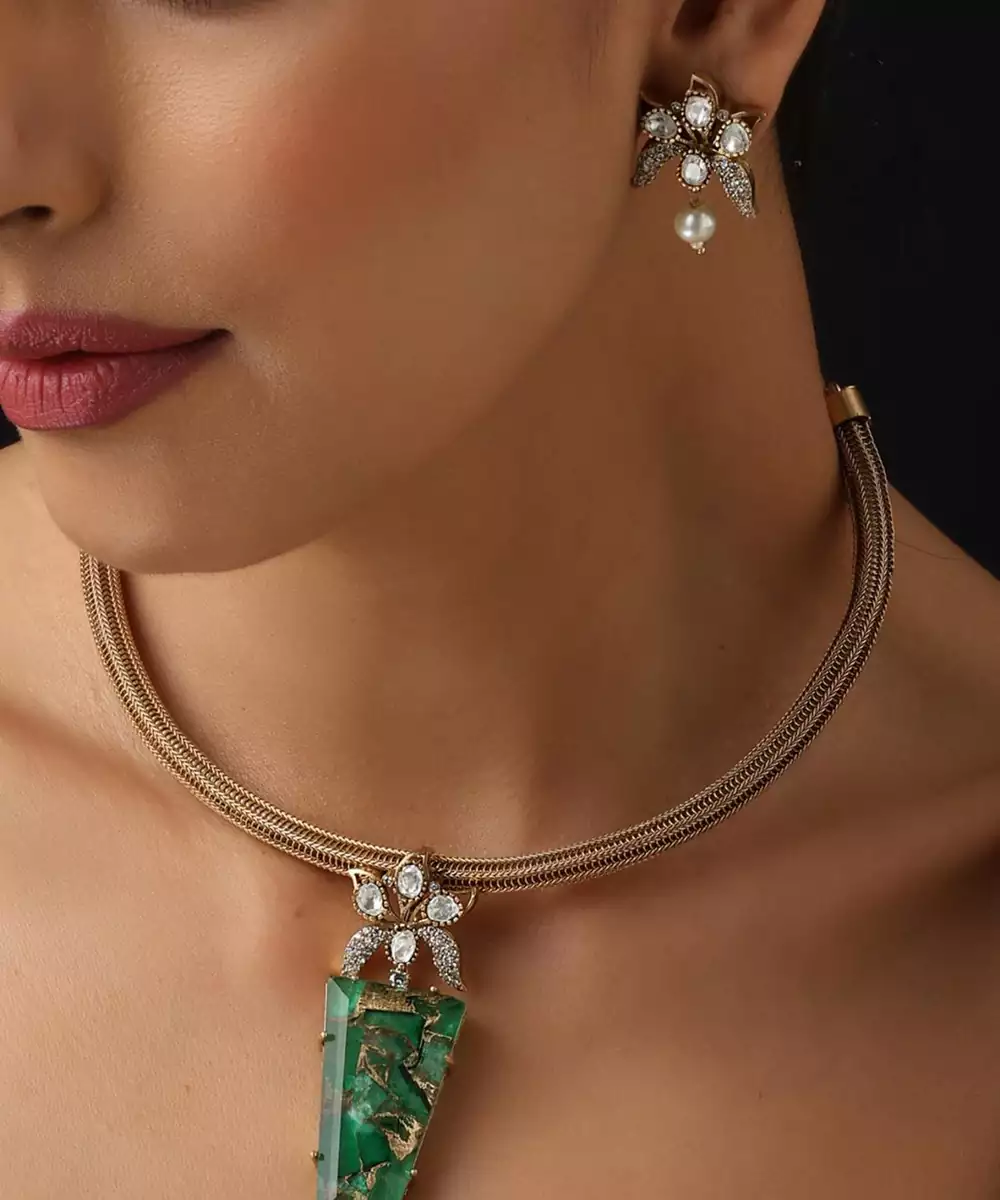 This Gold Plated Green Stone Polki Necklace Exudes Regal Elegance And Timeless Beauty. Featuring Intricate Polki Work Highlighted With Striking Green Stones, It Is Finished With Luxurious Gold Plating For A Rich Appeal. Perfect For Weddings, Festive Occasions, And Special Celebrations, It Pairs Beautifully With Both Traditional And Fusion Outfits.