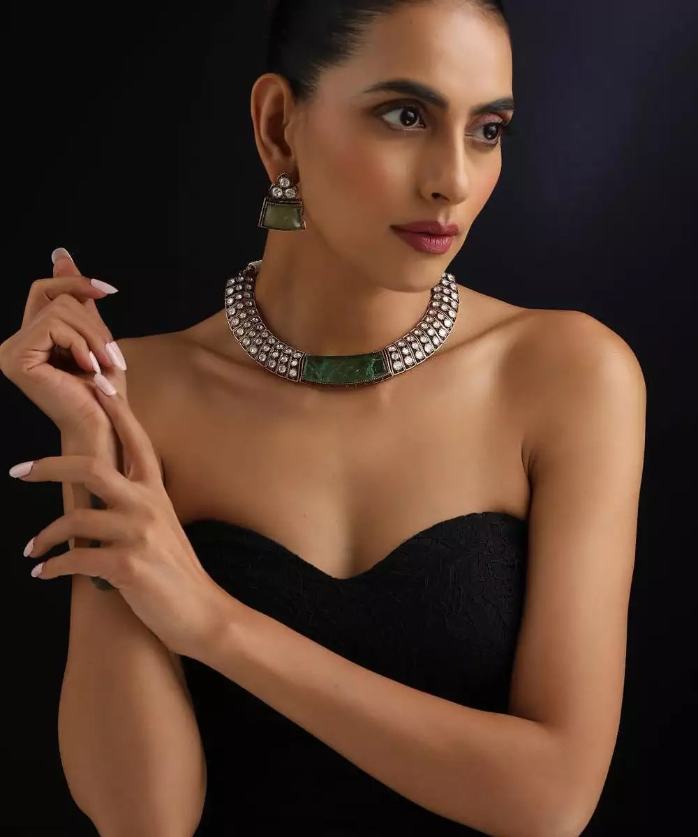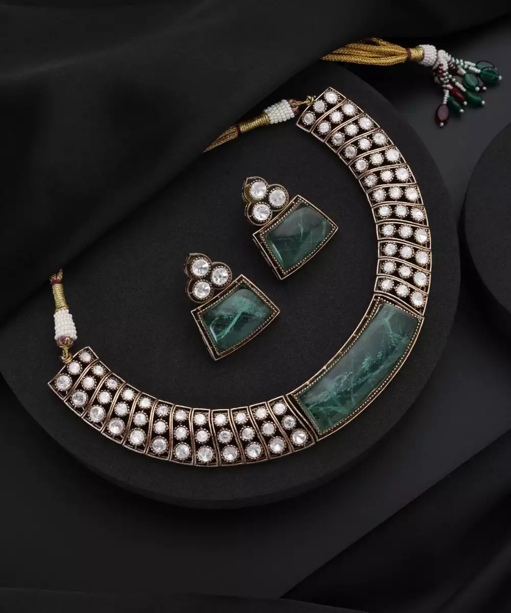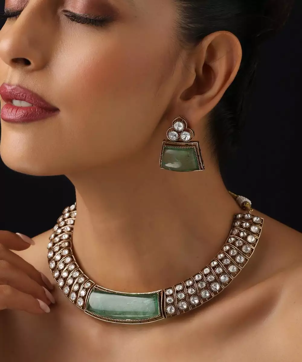 This Gold Plated Green Stone Polki Necklace Exudes Regal Elegance And Timeless Beauty. Featuring Intricate Polki Work Highlighted With Striking Green Stones, It Is Finished With Luxurious Gold Plating For A Rich Appeal. Perfect For Weddings, Festive Occasions, And Special Celebrations, It Pairs Beautifully With Both Traditional And Fusion Outfits.