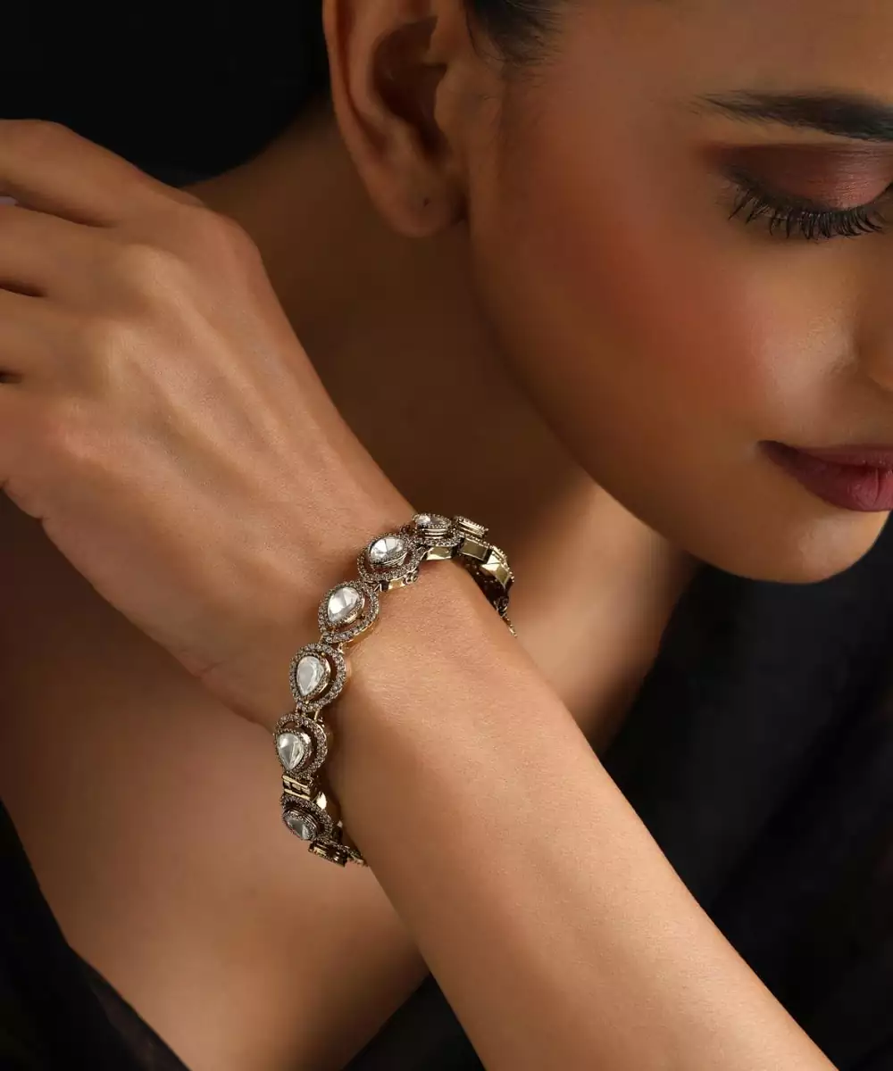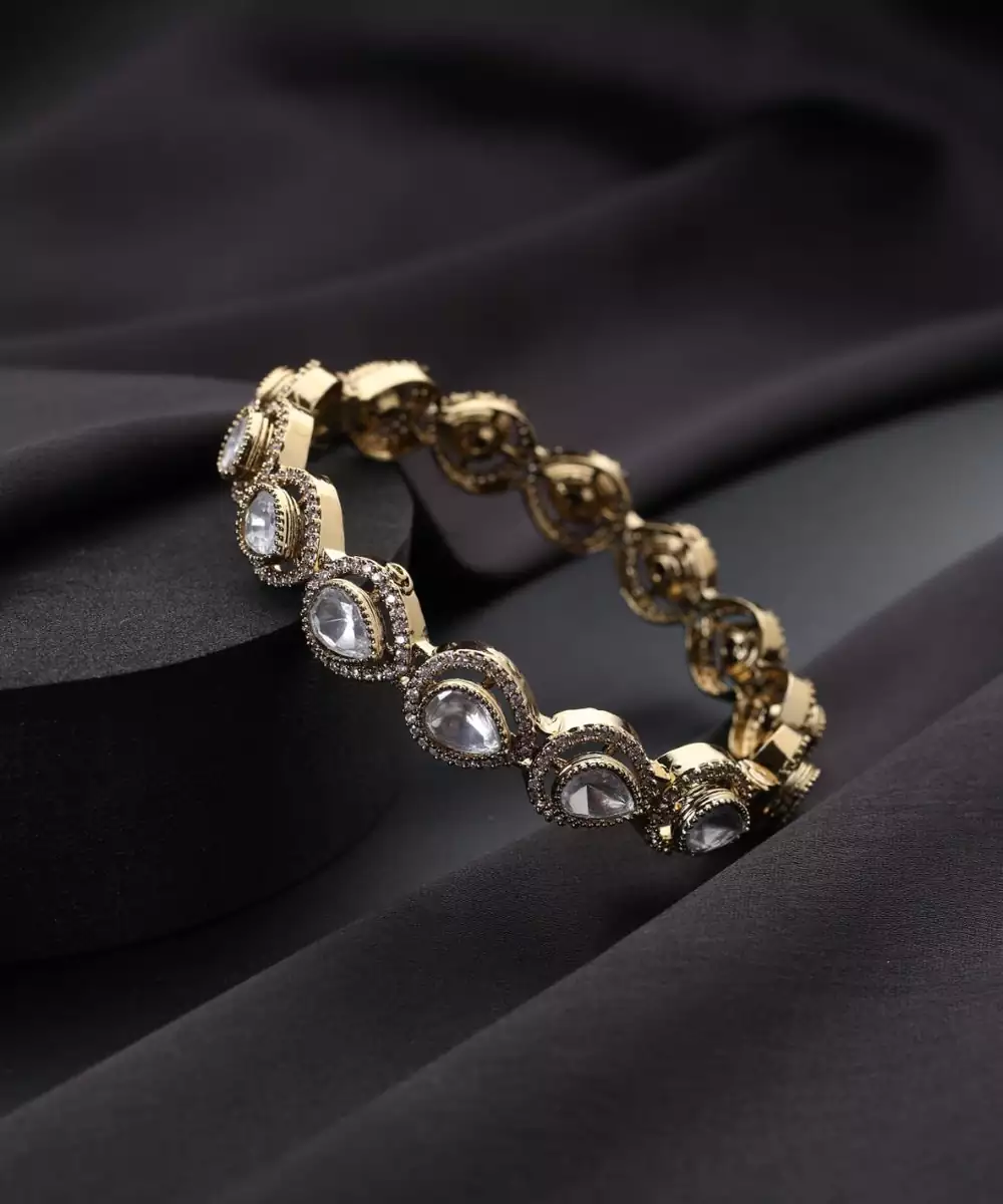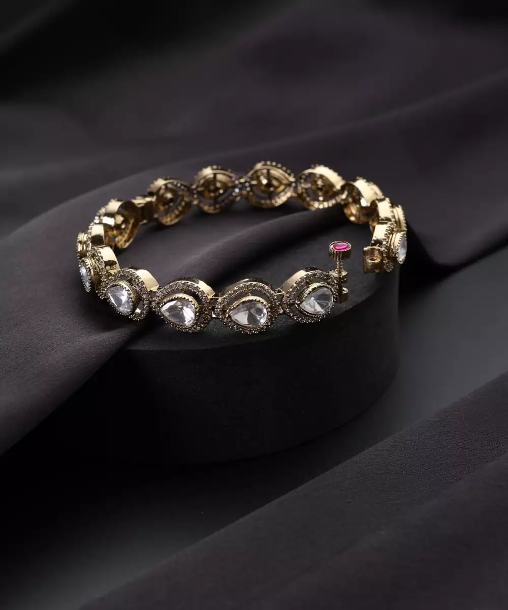 These Gold Plated Polki Bracelets Are A Perfect Blend Of Elegance And Tradition. Adorned With Intricate Polki Work, They Showcase Timeless Craftsmanship And Regal Charm. The Luxurious Gold Plating Adds Sophistication, Making Them Ideal For Weddings, Festive Occasions, And Celebrations, Effortlessly Complementing Both Ethnic And Fusion Outfits.