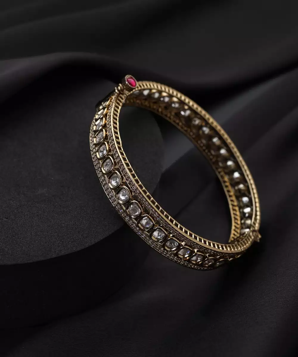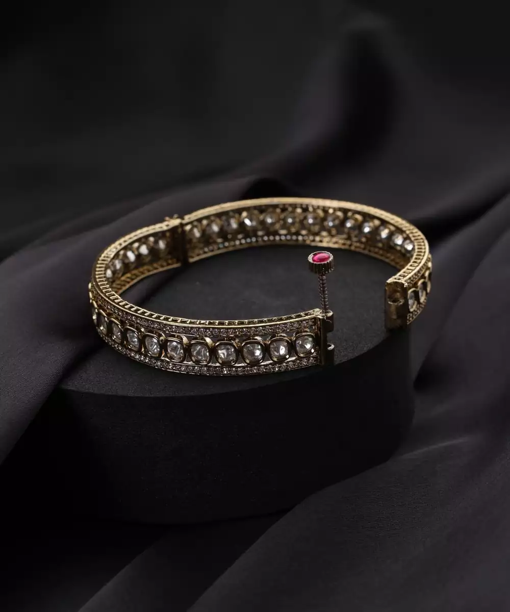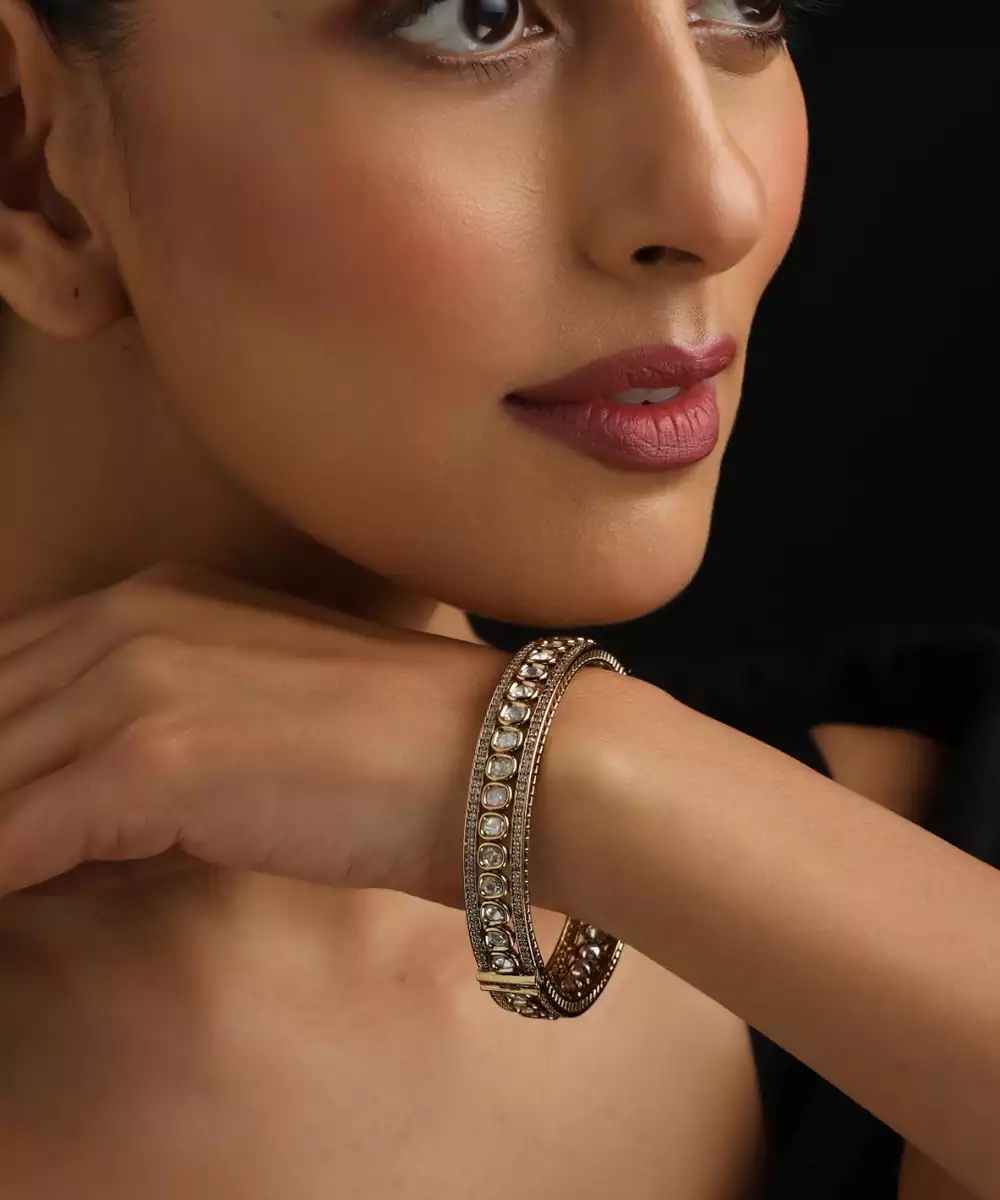 These Gold Plated Polki Bracelets Are A Perfect Blend Of Elegance And Tradition. Adorned With Intricate Polki Work, They Showcase Timeless Craftsmanship And Regal Charm. The Luxurious Gold Plating Adds Sophistication, Making Them Ideal For Weddings, Festive Occasions, And Celebrations, Effortlessly Complementing Both Ethnic And Fusion Outfits.