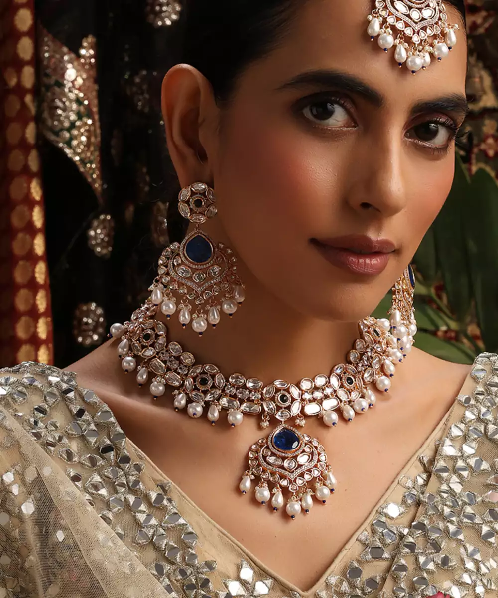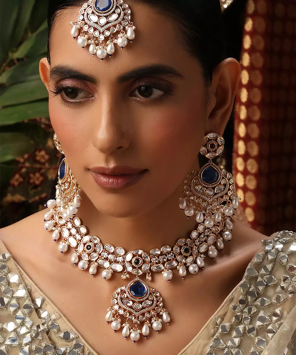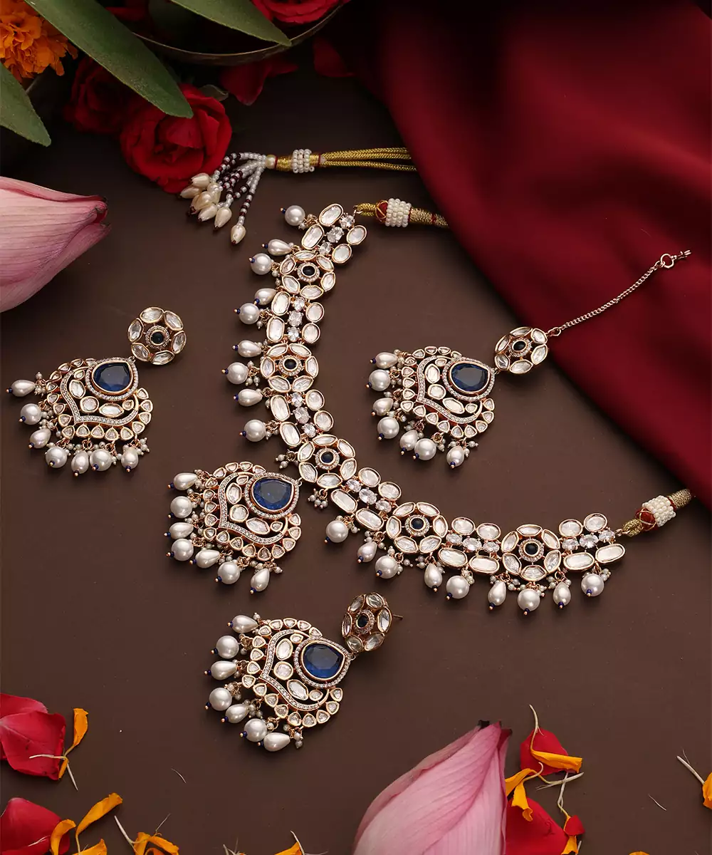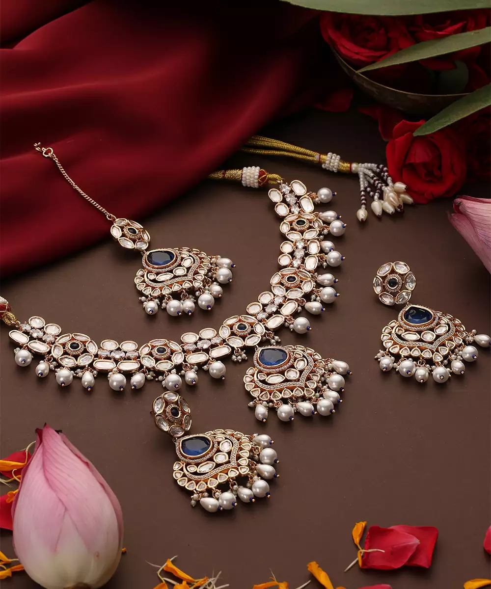 This Rose Gold Plated Kundan Necklace Set Is Adorned With Captivating Blue Stones, Exuding Refined Elegance And Regal Charm. Featuring Intricate Craftsmanship, It Blends Traditional Artistry With A Modern Touch. Perfect For Weddings And Festive Occasions, It Beautifully Enhances Ethnic Ensembles With Graceful Sophistication.