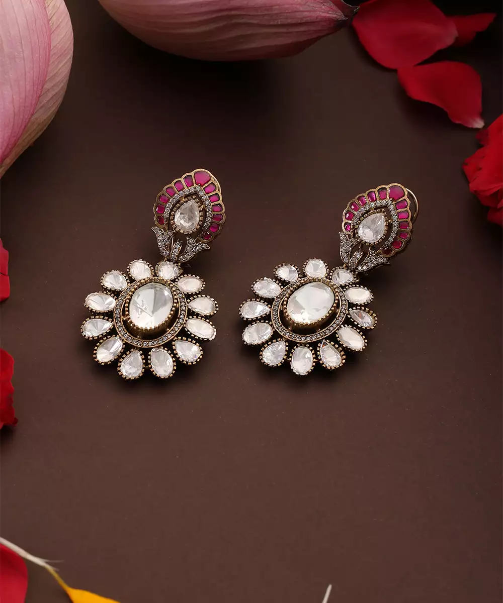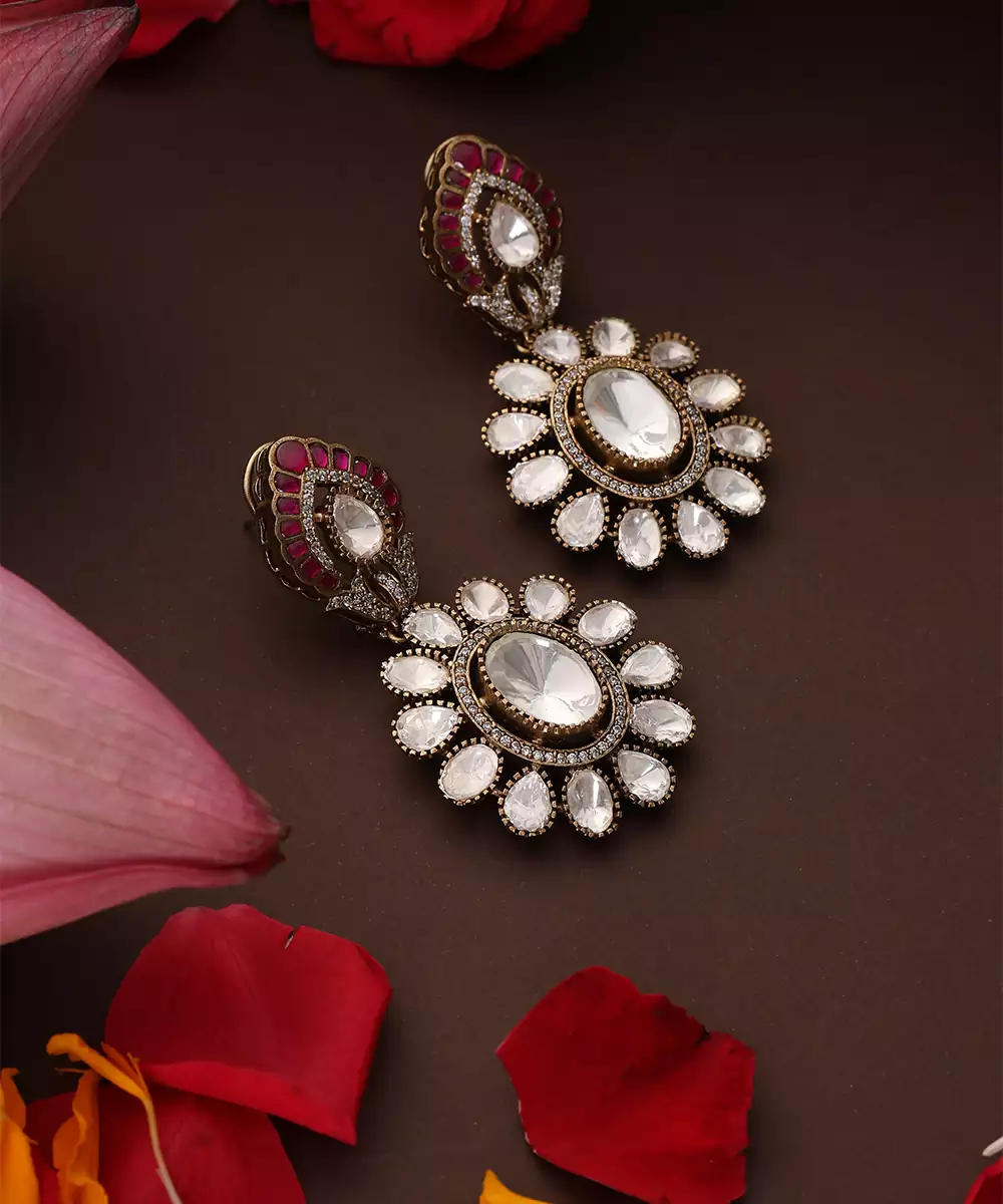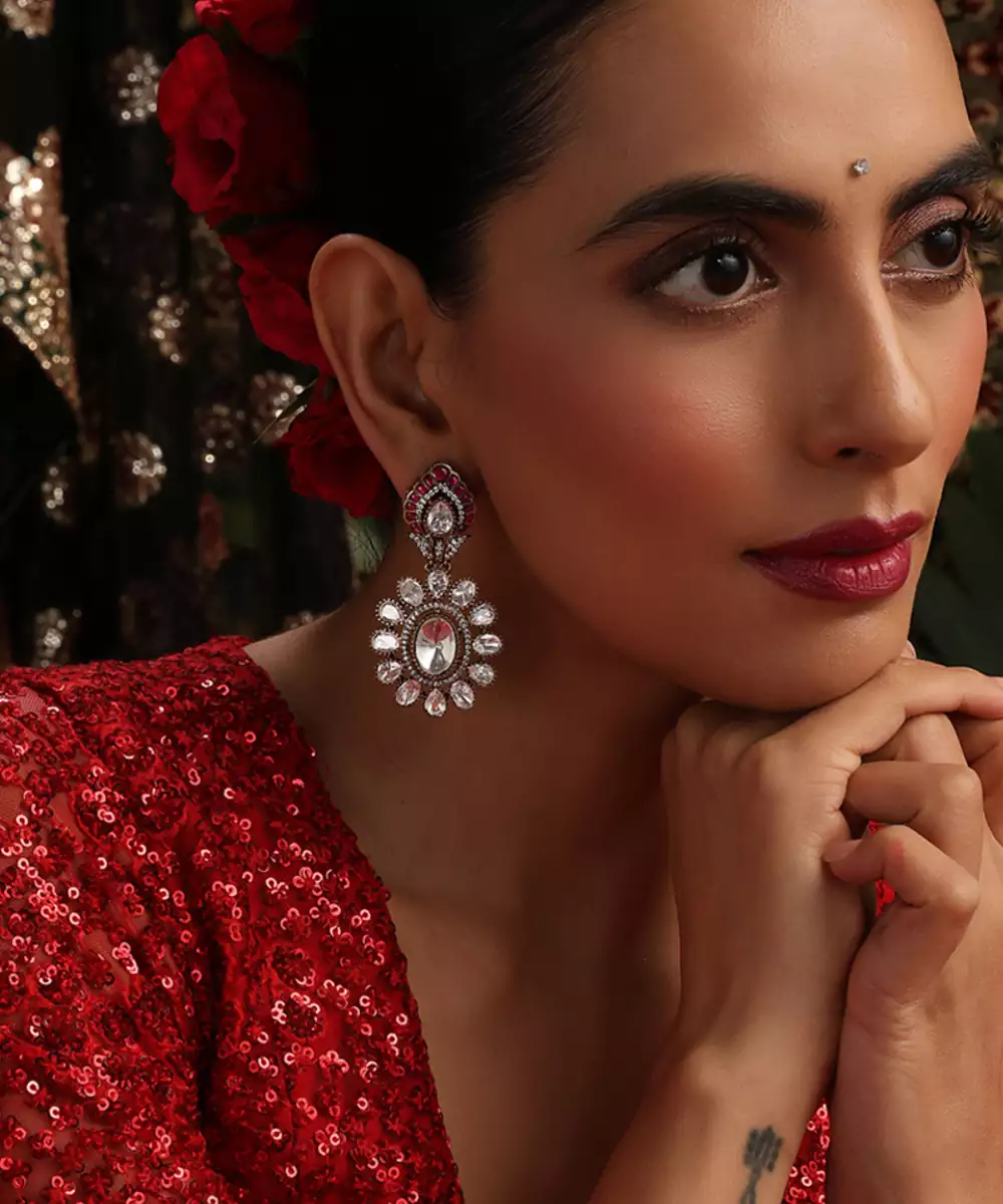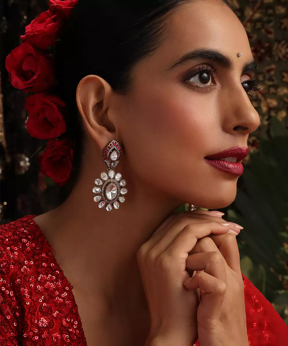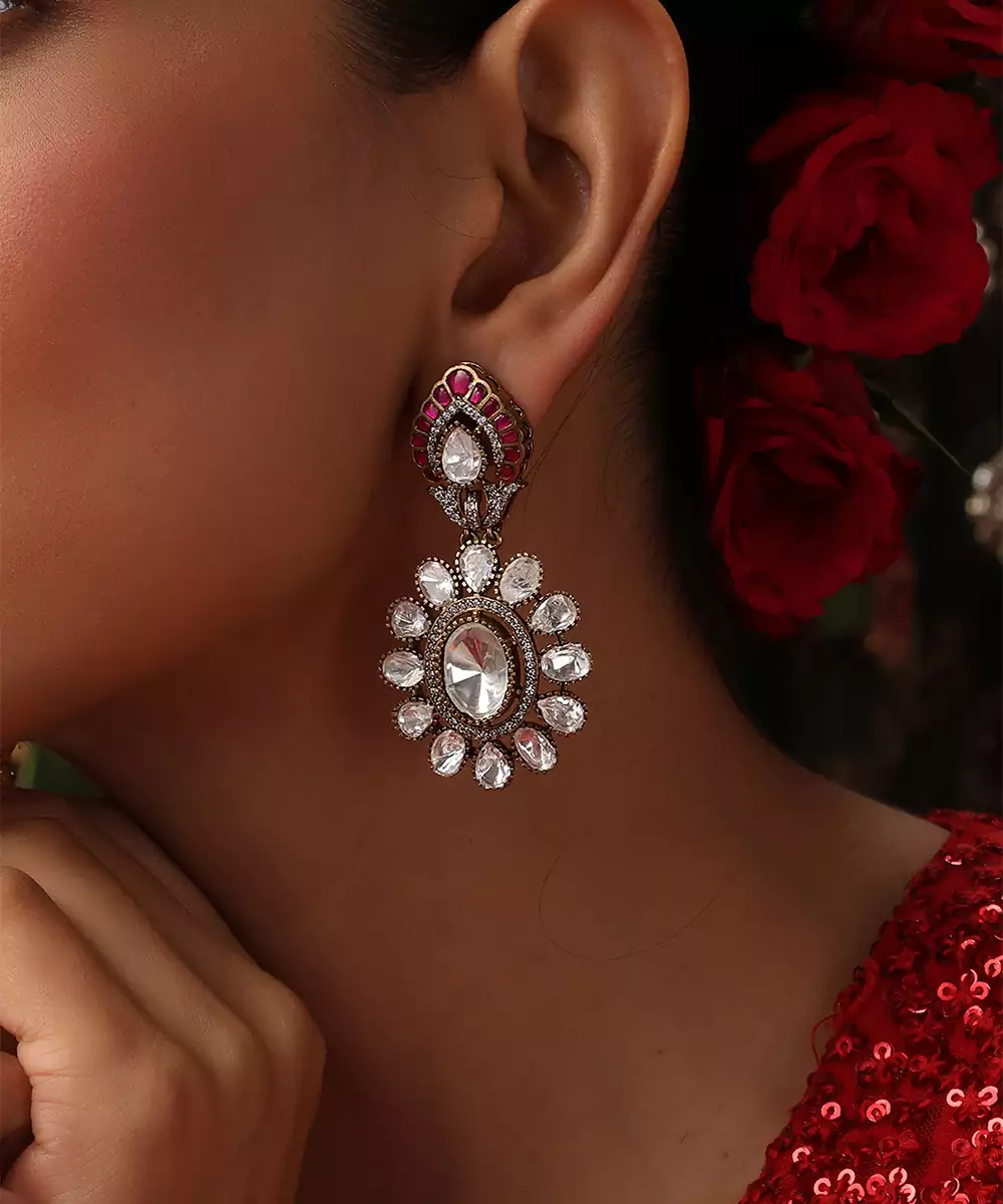 These Rose Gold Plated Kundan Dangler Earrings Are Adorned With Striking Red Stones, Exuding Timeless Elegance And Festive Charm. Featuring Intricate Craftsmanship, They Sway Gracefully To Enhance Traditional And Bridal Looks. Perfect For Weddings And Special Occasions, They Add A Sophisticated, Statement Touch To Ethnic Ensembles.