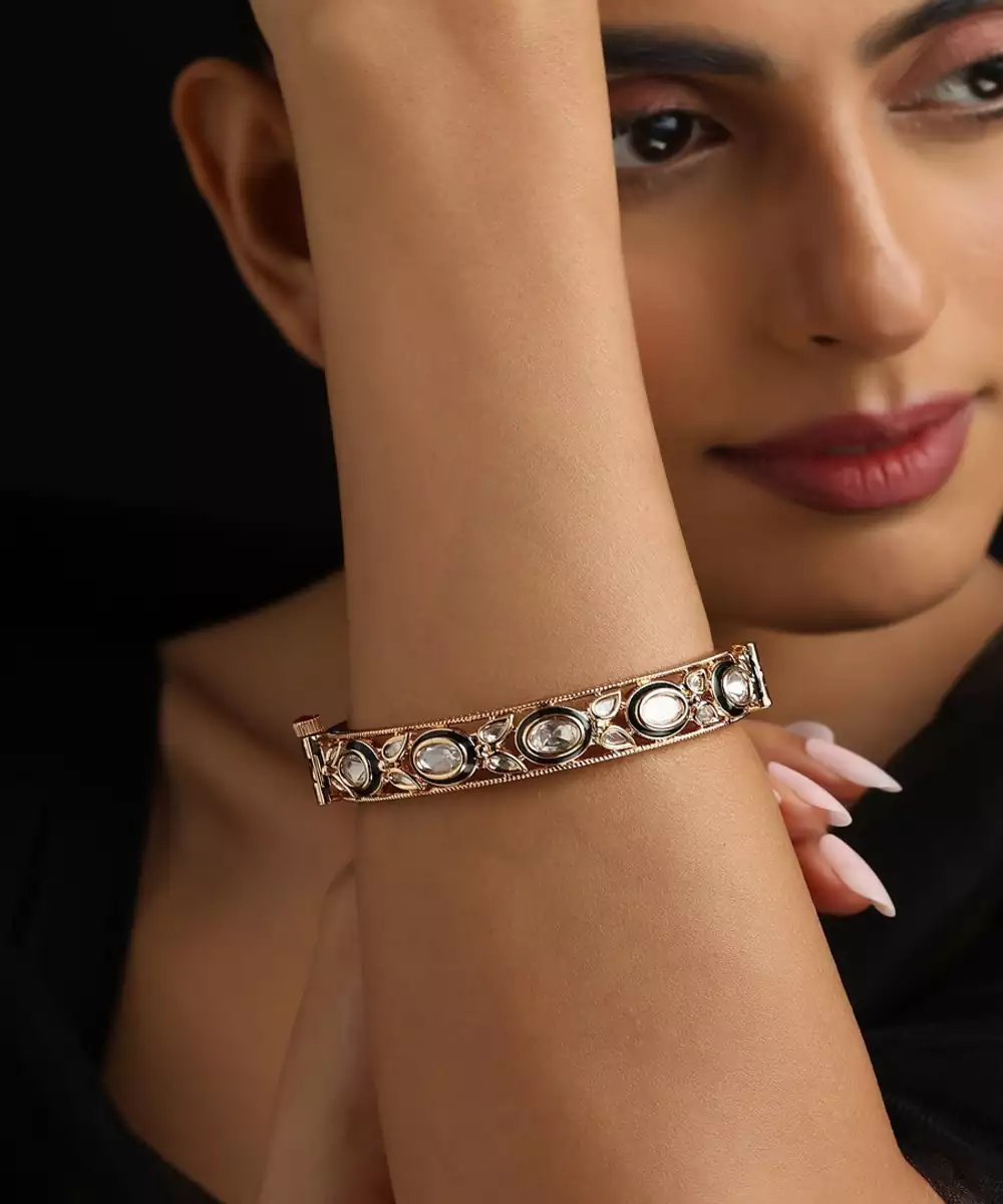 Elevate Your Style With This Rose Gold Plated Polki Bangle. The Modern, Blush Hue Of Rose Gold Beautifully Complements The Rustic Charm Of Traditional Polki Stones. This Elegant Piece Blends Contemporary Fashion With Classic Indian Craftsmanship, Making It A Versatile Accessory For Both Festive Events And Everyday Sophistication