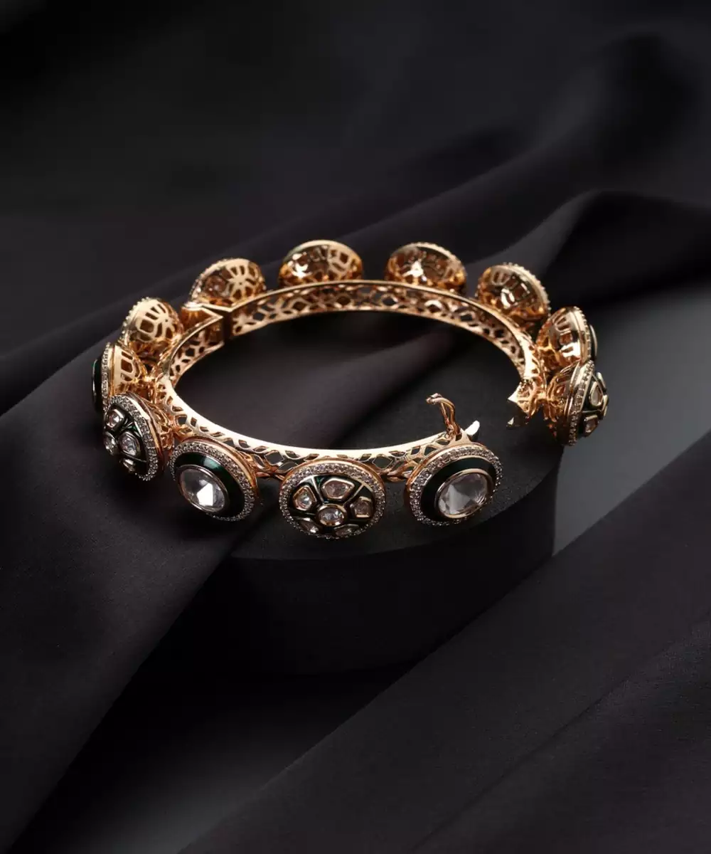 Elevate Your Style With This Rose Gold Plated Polki Bangle. The Modern, Blush Hue Of Rose Gold Beautifully Complements The Rustic Charm Of Traditional Polki Stones. This Elegant Piece Blends Contemporary Fashion With Classic Indian Craftsmanship, Making It A Versatile Accessory For Both Festive Events And Everyday Sophistication