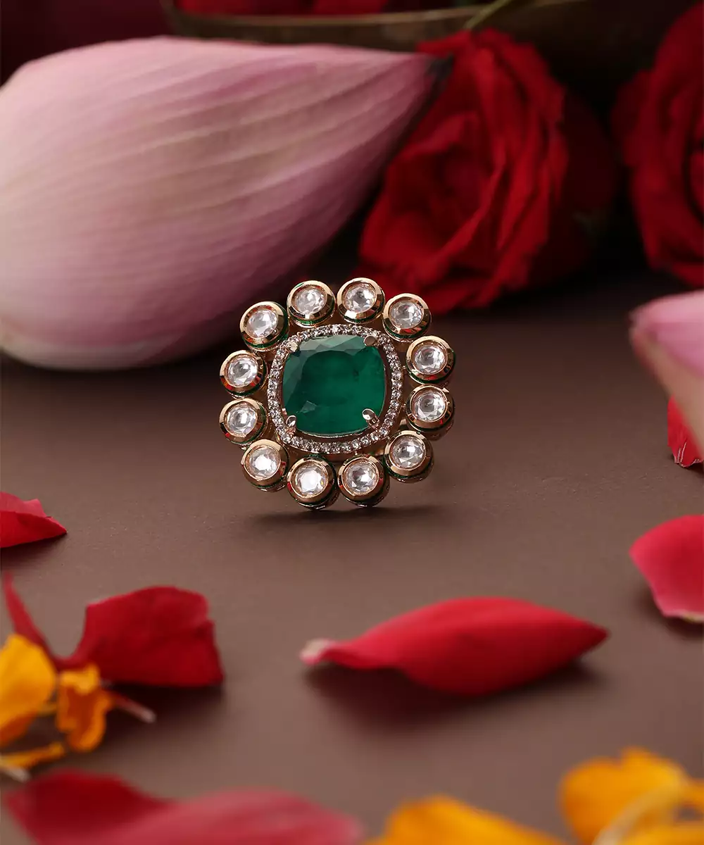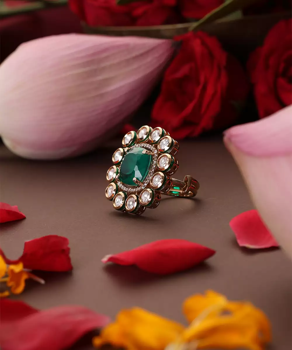 This Gold Plated Kundan Ring Is Beautifully Adorned With A Vibrant Green Stone, Reflecting Timeless Elegance And Regal Charm. Crafted With Intricate Detailing, It Adds A Graceful Touch To Traditional And Festive Looks. Perfect For Weddings And Special Occasions, It Offers Refined Sophistication And Classic Appeal.