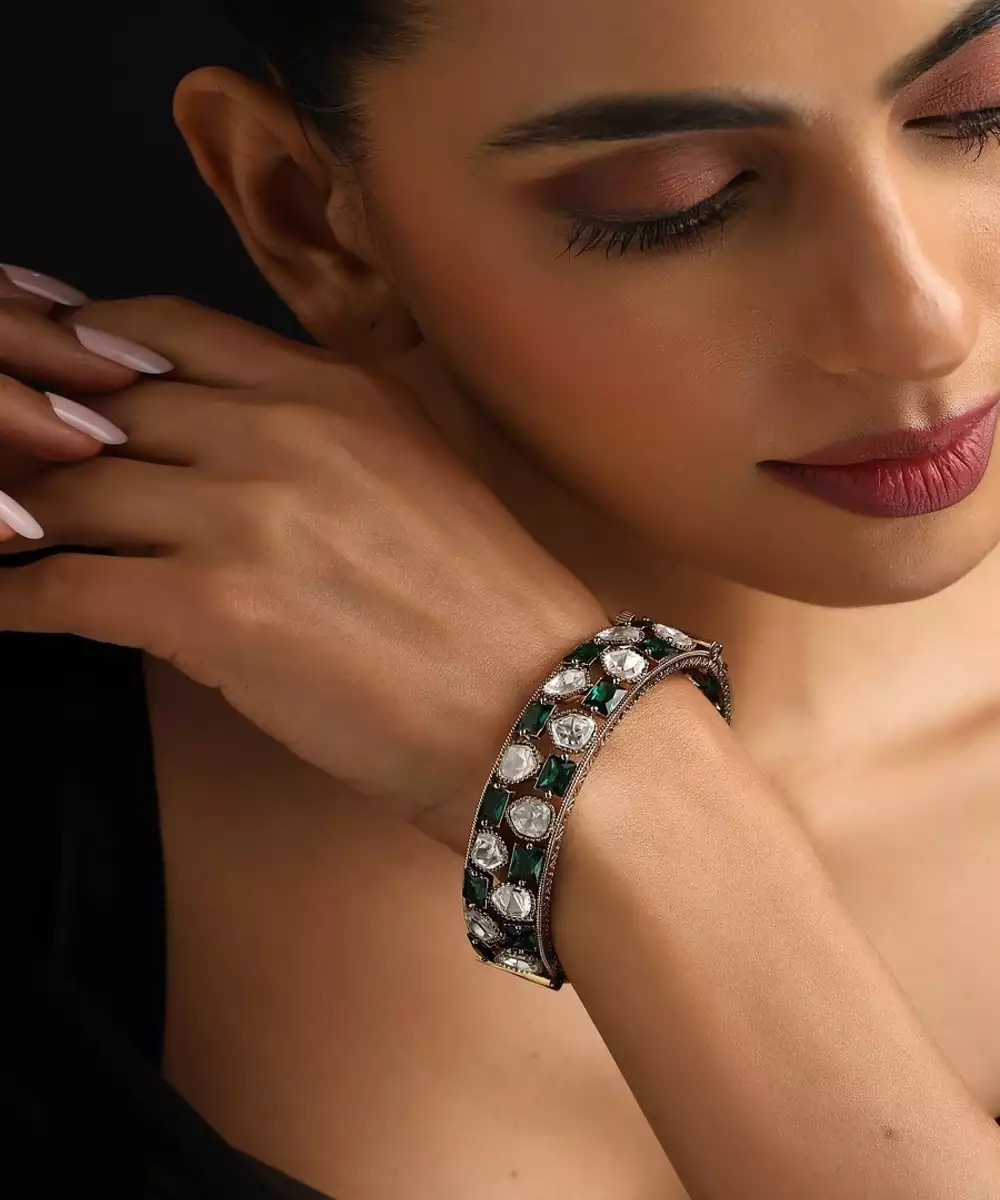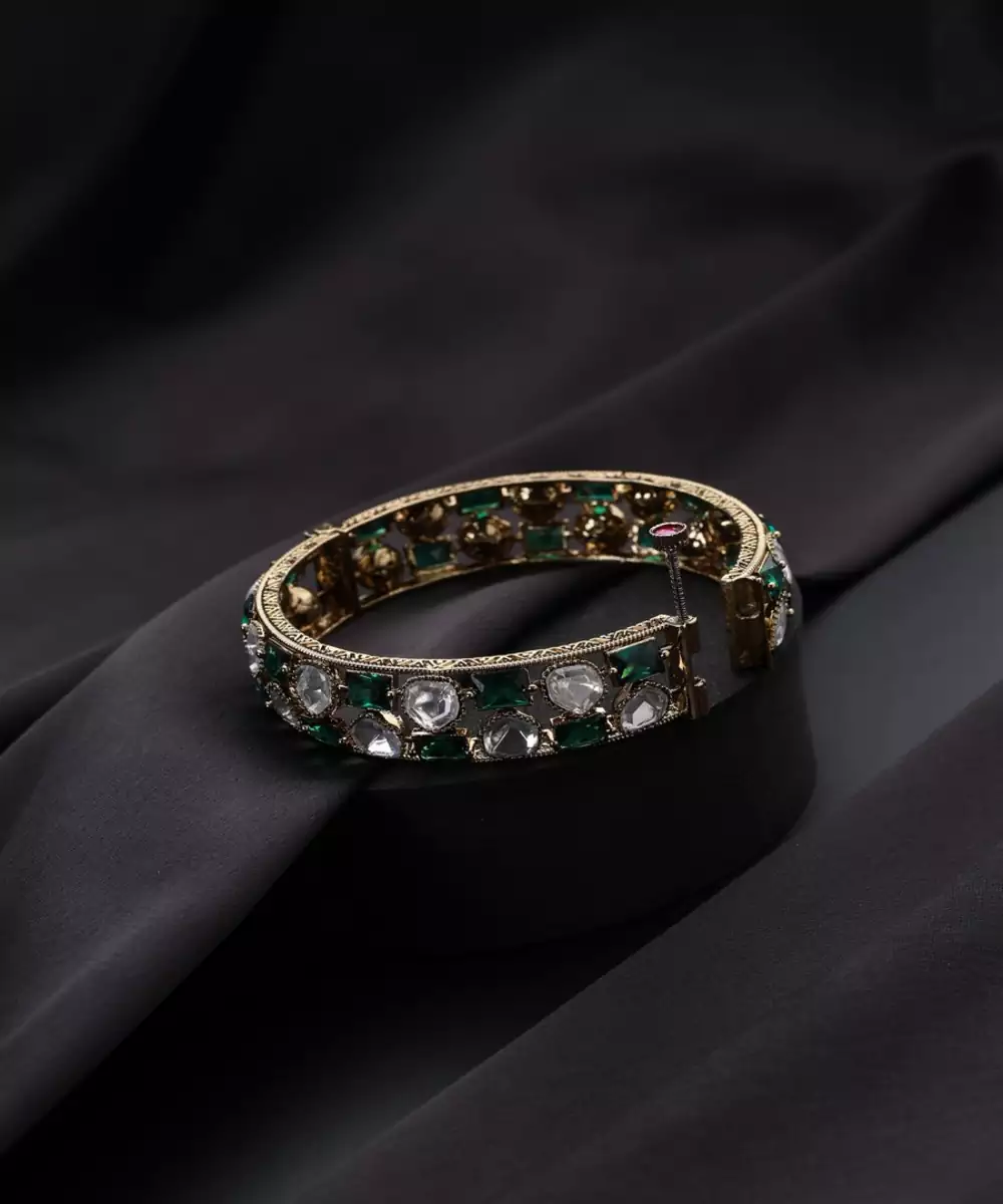 Gold Plated Kundan Green Stones Bangle