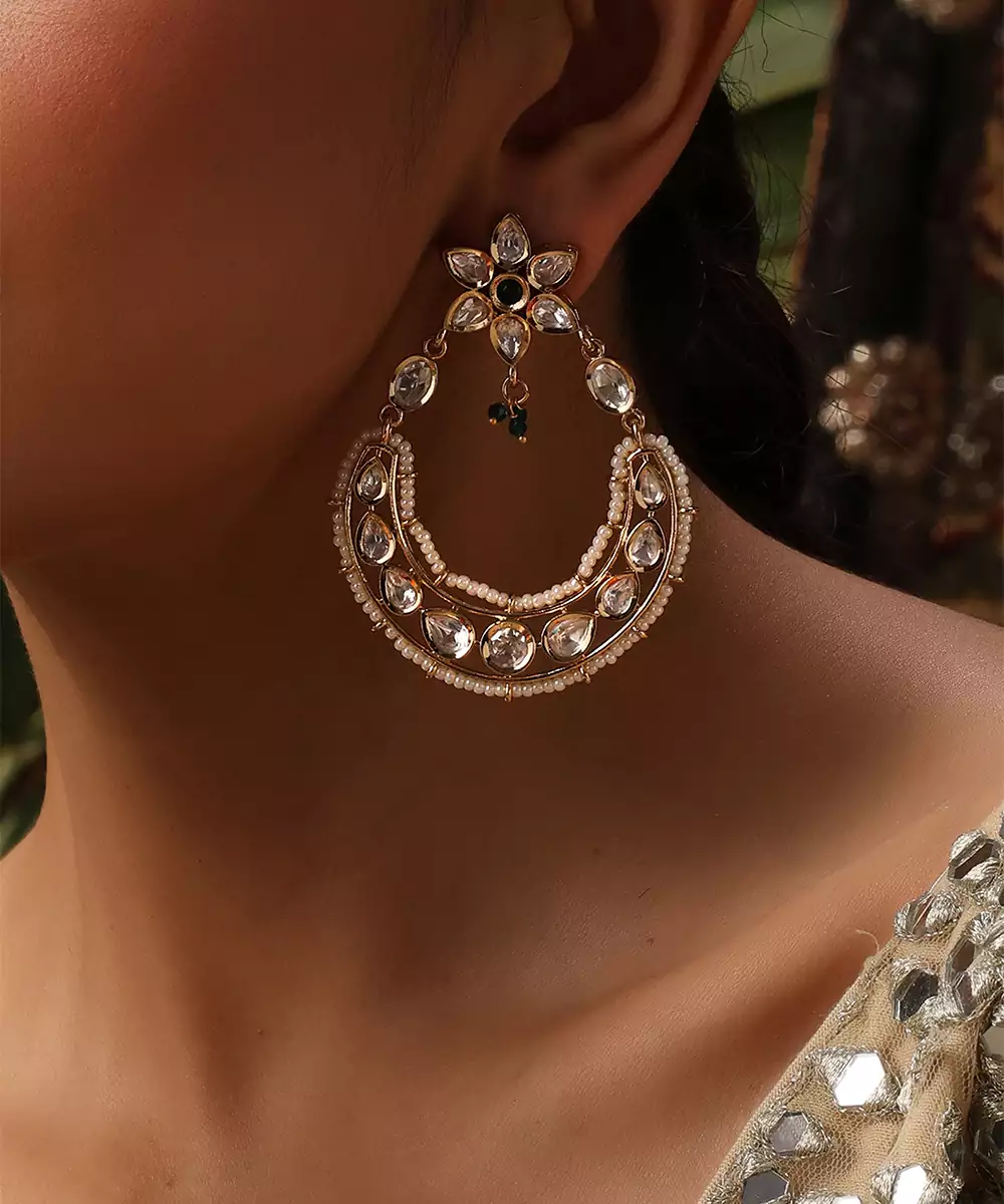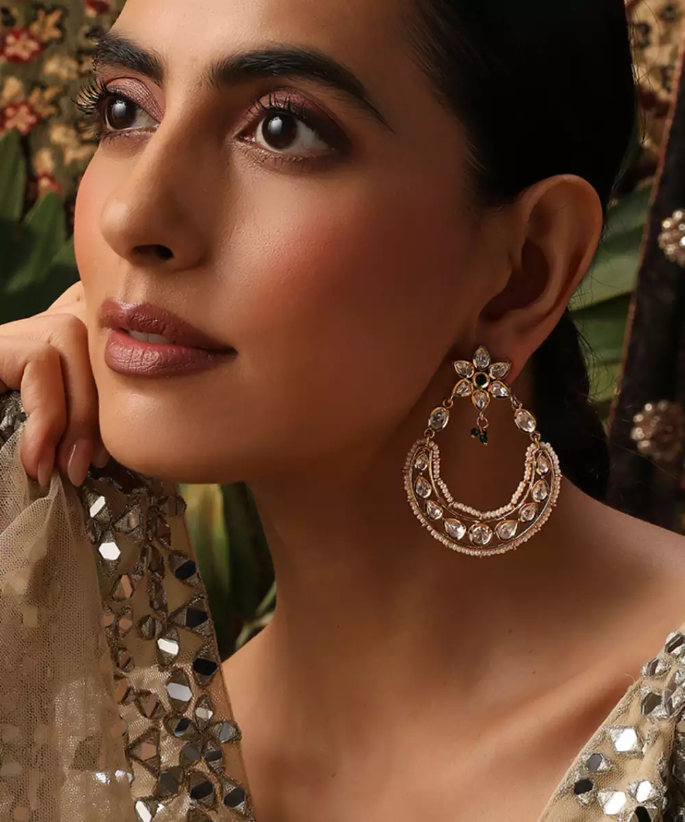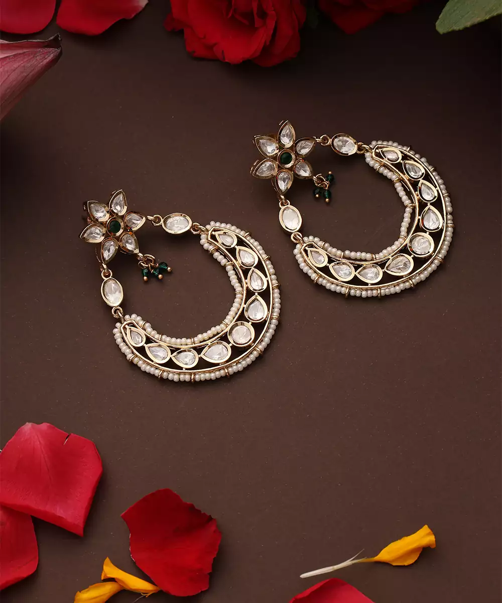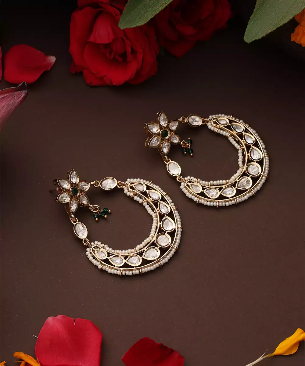 These Gold Plated Kundan Chandbali Earrings Are Adorned With Vibrant Green Stones, Exuding Timeless Elegance And Traditional Charm. Featuring Intricate Craftsmanship, They Beautifully Frame The Face And Enhance Festive And Bridal Looks. Perfect For Weddings And Special Occasions, They Add A Graceful, Statement Touch To Ethnic Ensembles.