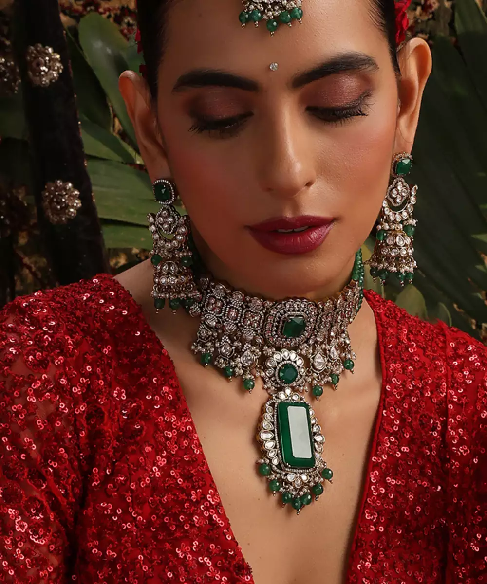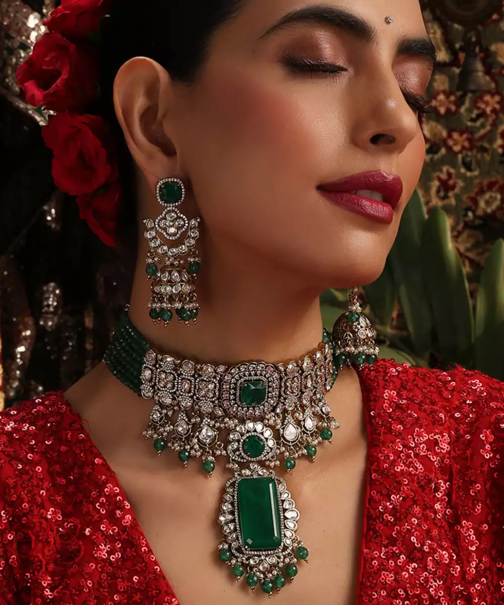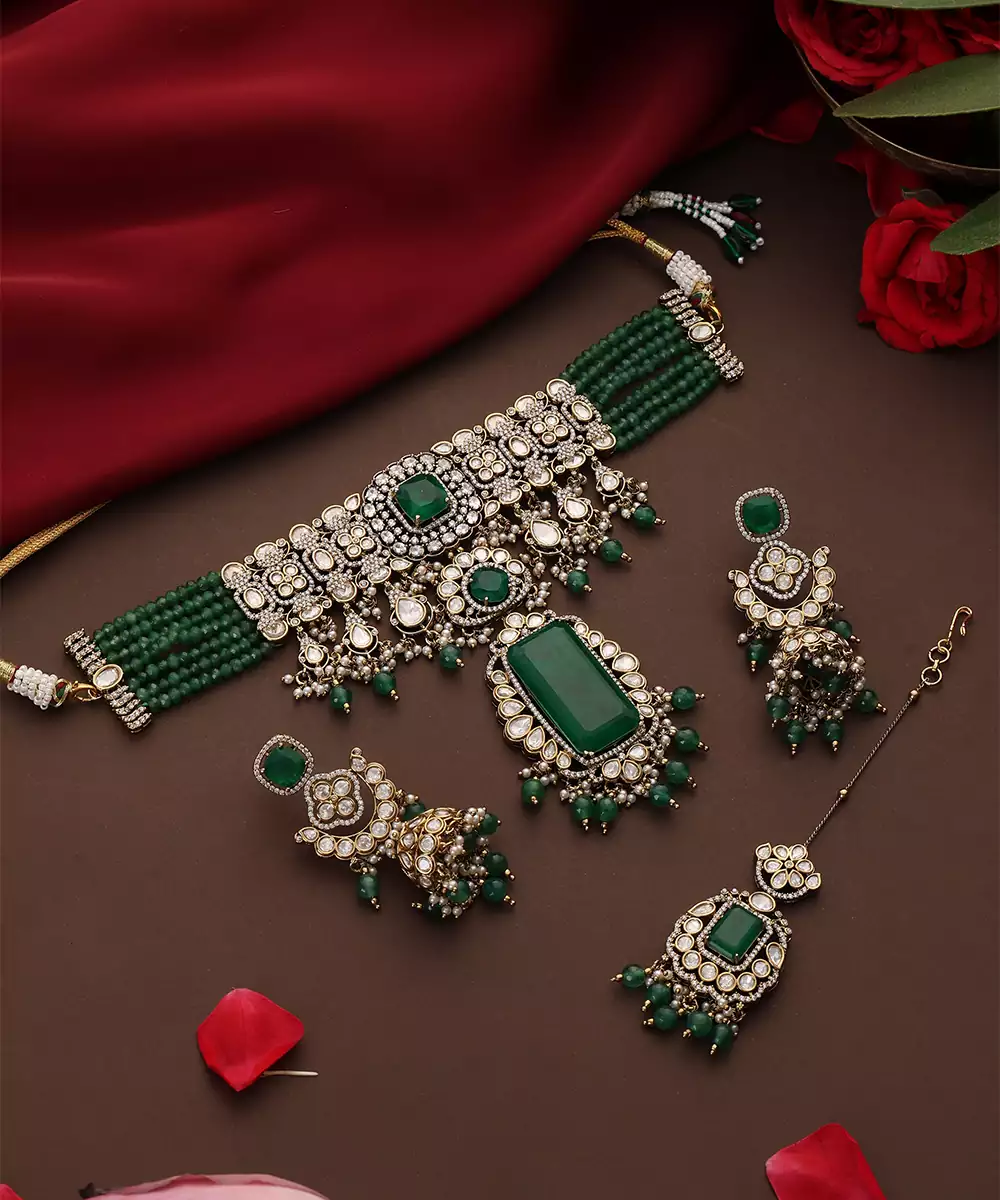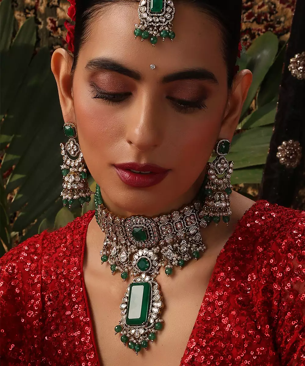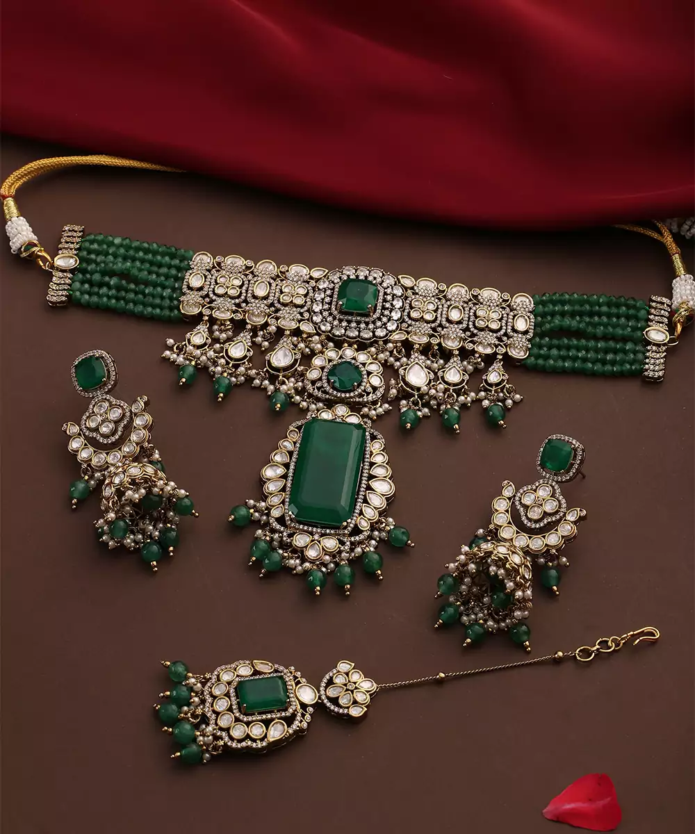 This Gold Plated Kundan Choker Necklace Set Is Adorned With Vibrant Green Stones, Exuding Timeless Elegance And Regal Charm. Featuring Intricate Craftsmanship, It Beautifully Enhances Traditional And Festive Attire. Perfect For Weddings And Special Occasions, It Adds A Graceful, Statement Touch To Ethnic Ensembles.