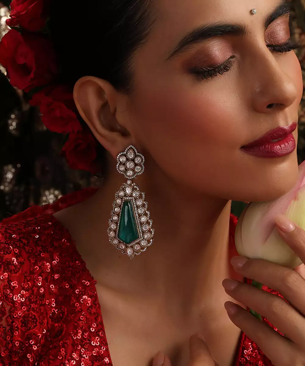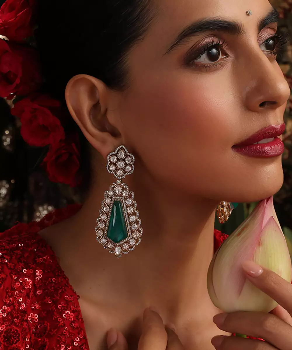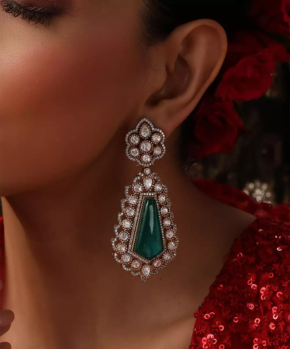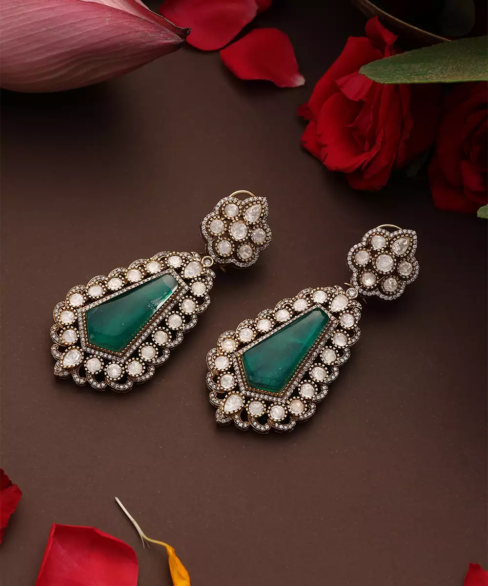 These Gold Plated Kundan Dangler Earrings Are Adorned With Vibrant Green Stones, Reflecting Timeless Elegance And Regal Charm. Crafted With Intricate Detailing, They Sway Gracefully To Enhance Traditional And Festive Looks. Perfect For Weddings And Special Occasions, They Add Refined Sophistication And Statement Appeal.
