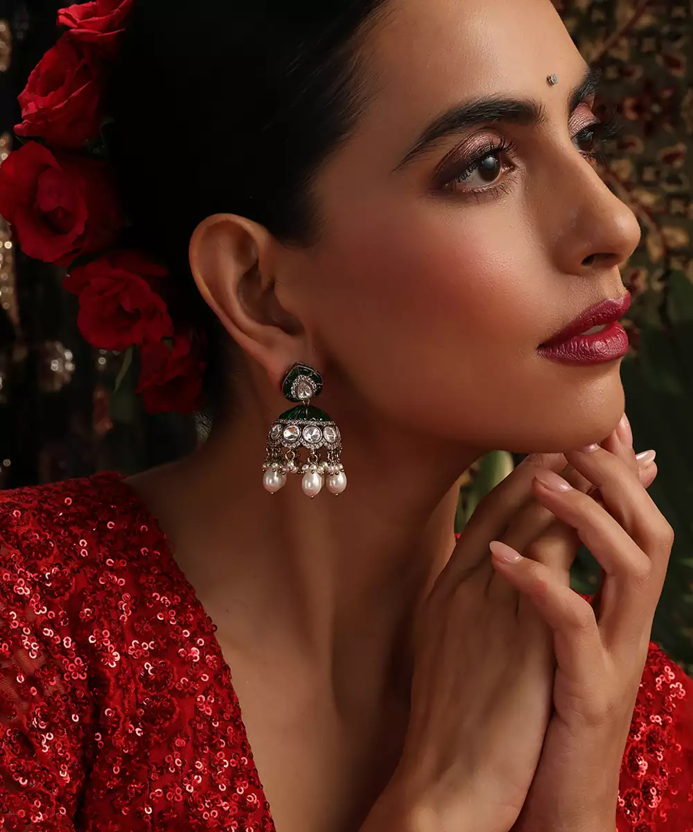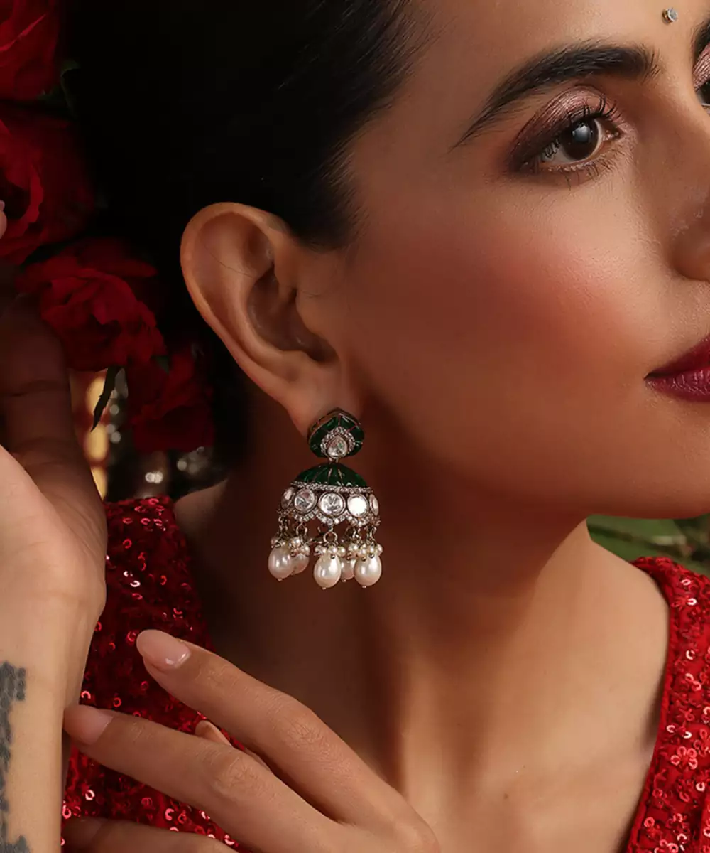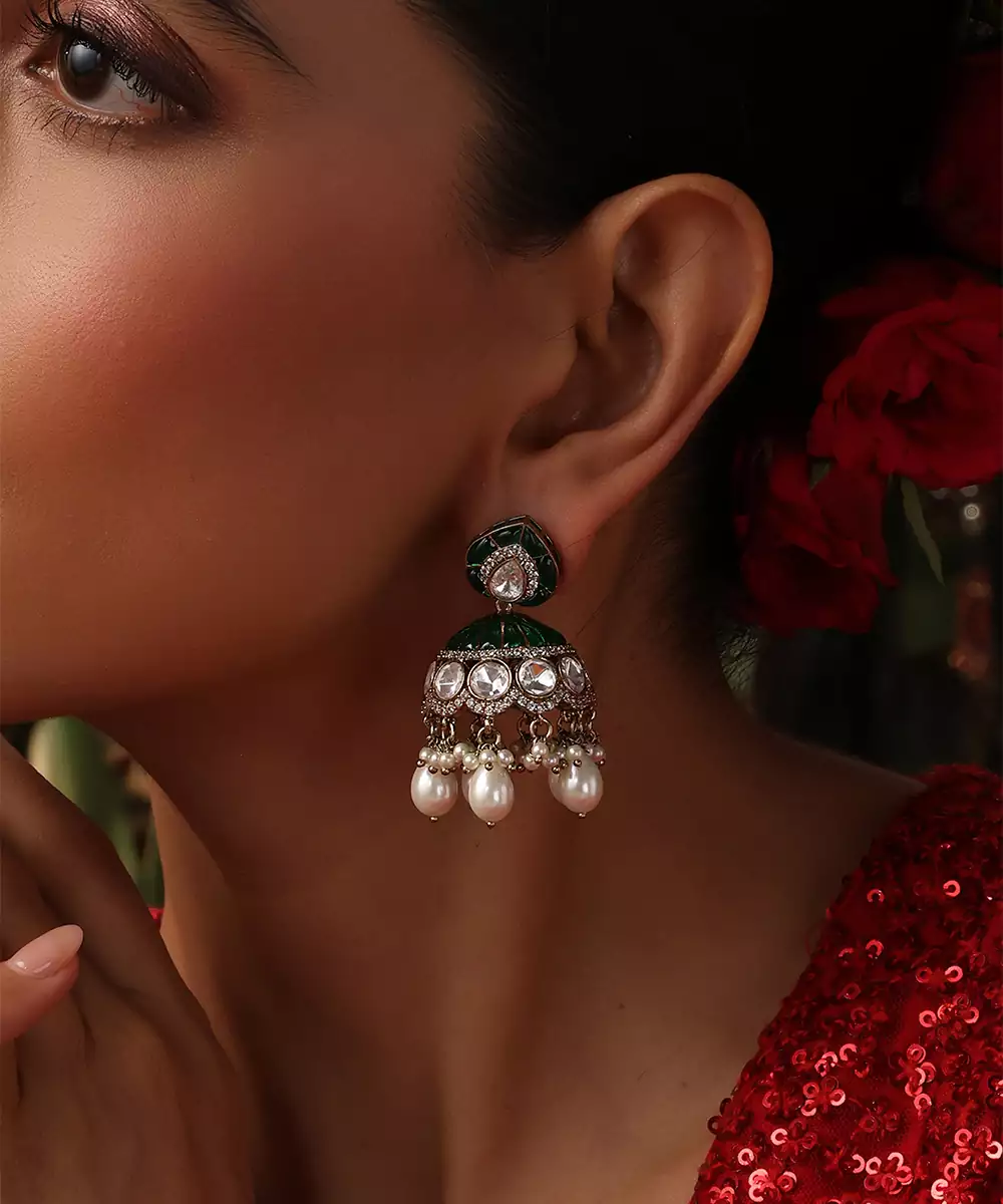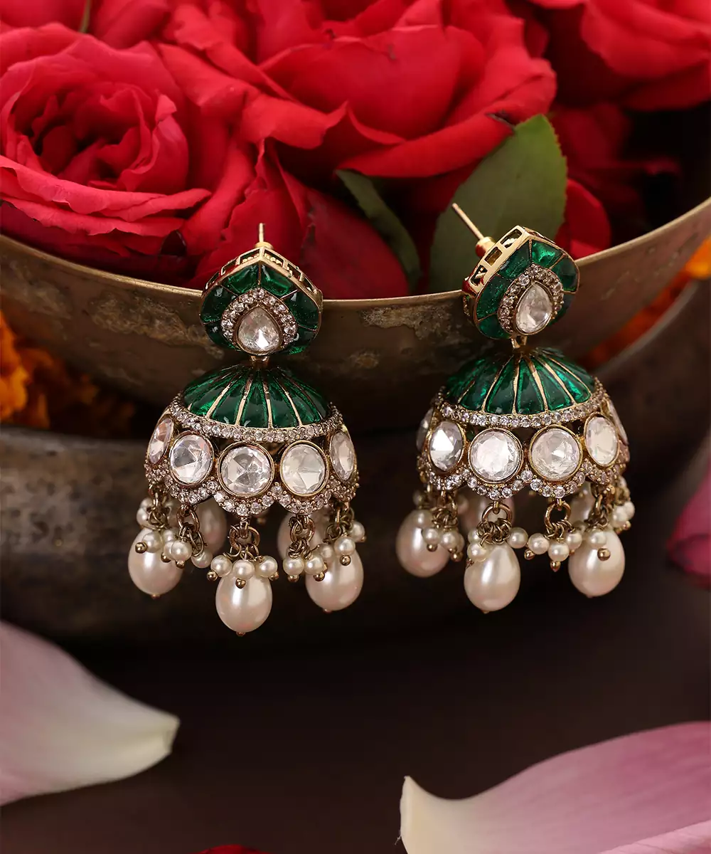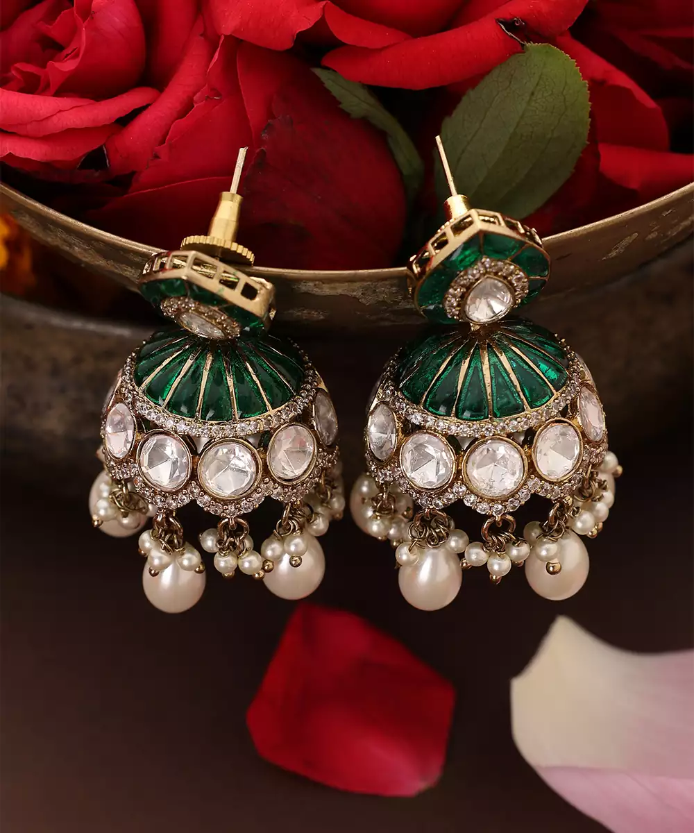 These Gold Plated Kundan Jhumkas Are Adorned With Vibrant Green Stones, Radiating Timeless Elegance And Traditional Charm. Featuring Intricate Craftsmanship, They Beautifully Enhance Festive And Bridal Looks. Perfect For Weddings And Special Occasions, They Add A Graceful, Statement Touch To Ethnic Ensembles.