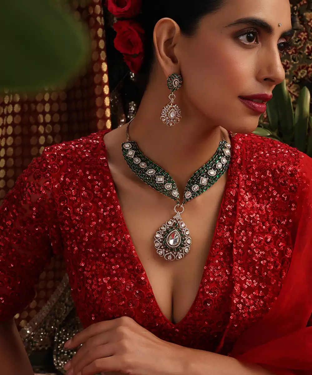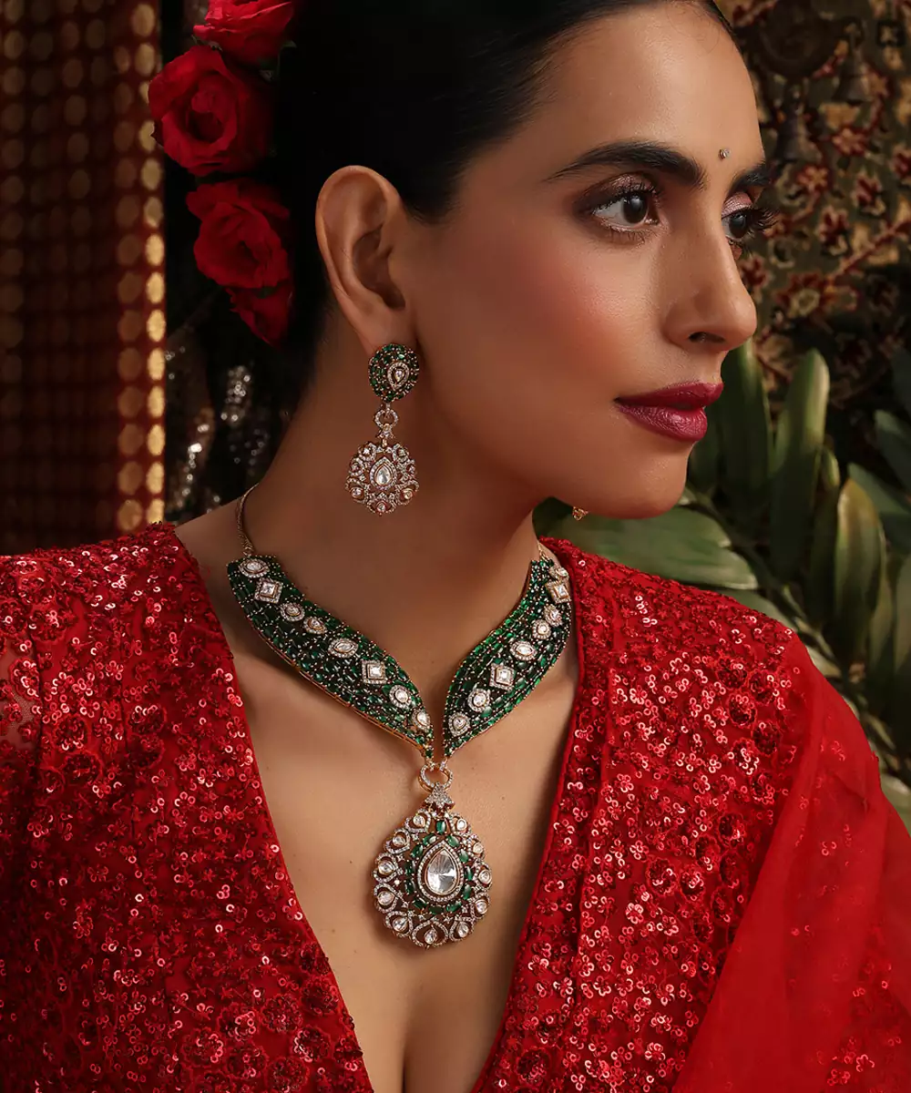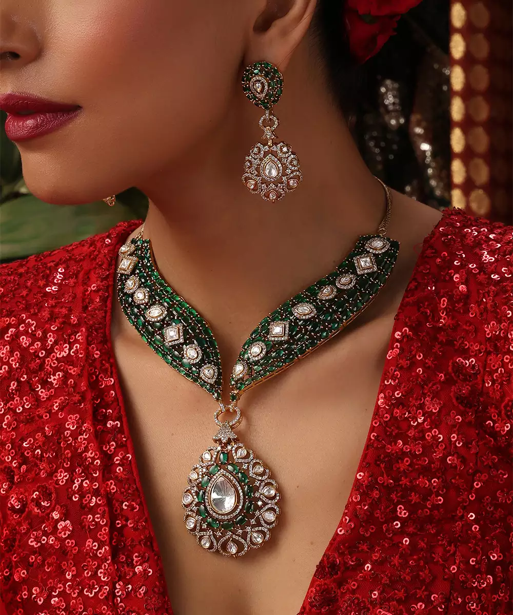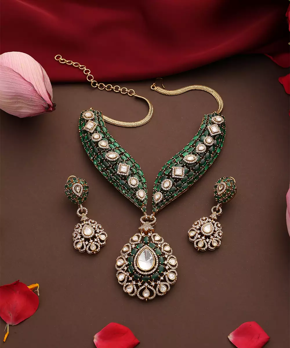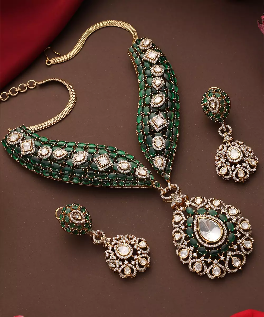 This Gold Plated Kundan Necklace Set Is Adorned With Vibrant Green Stones, Radiating Timeless Elegance And Traditional Charm. Featuring Intricate Kundan Craftsmanship, It Beautifully Enhances Festive And Bridal Attire. Perfect For Weddings And Special Occasions, It Adds A Graceful, Statement Touch To Ethnic Ensembles.