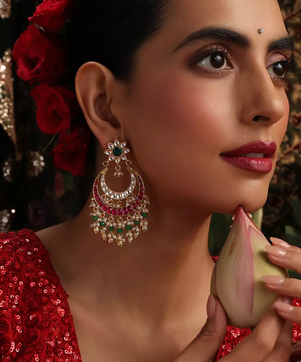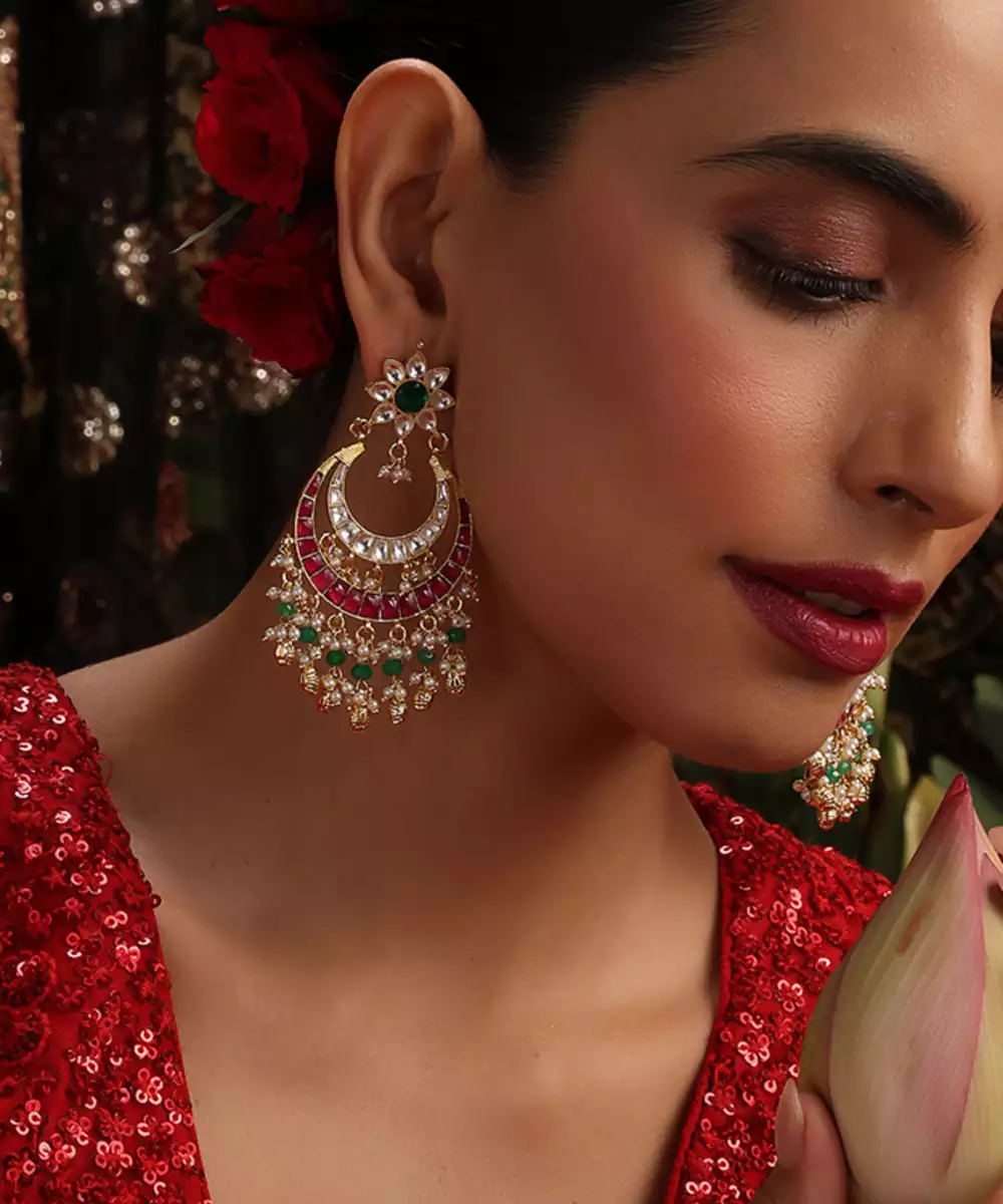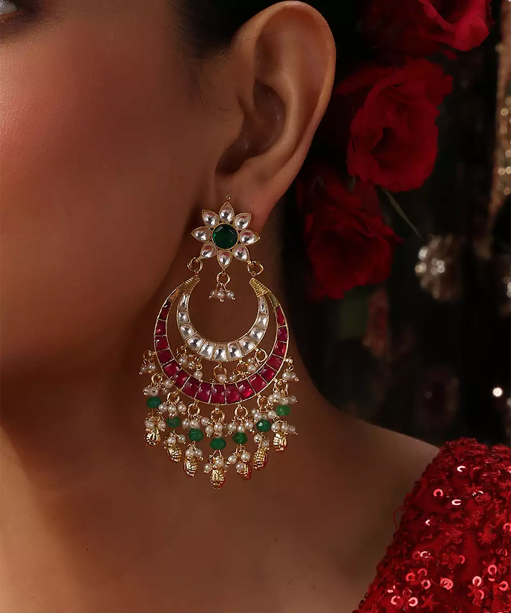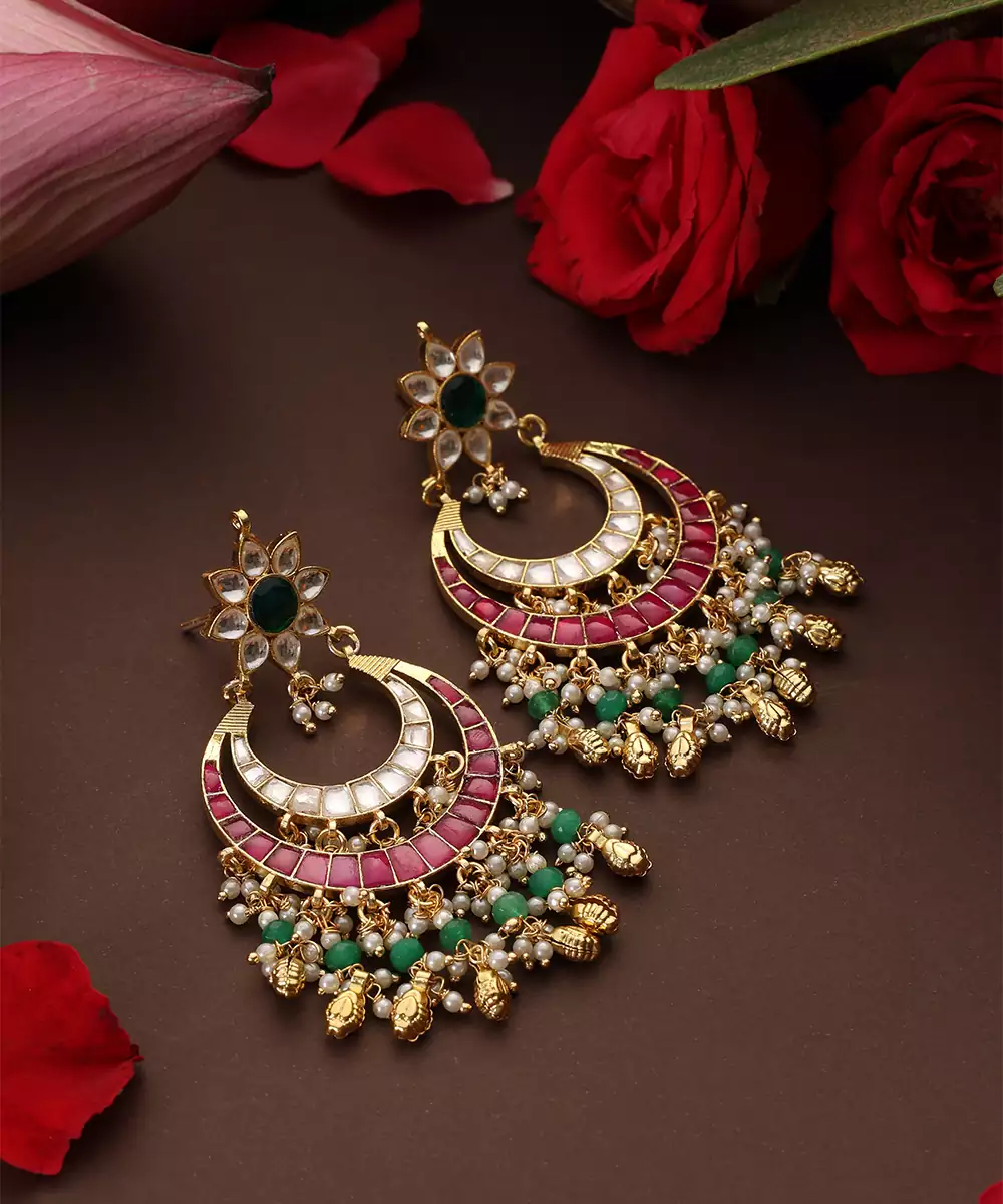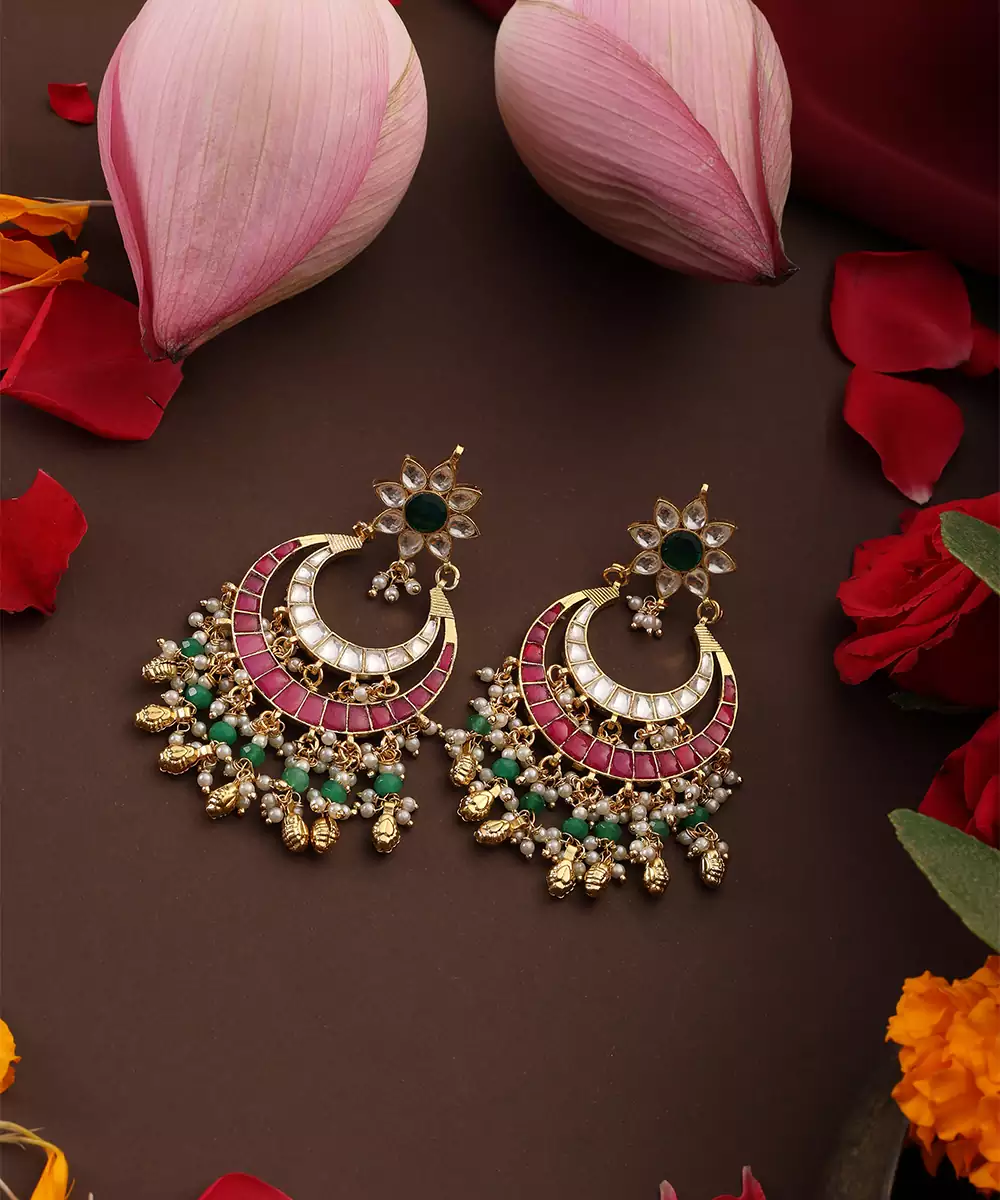 These Gold Plated Kundan Chandbali Earrings Are Adorned With Vibrant Multicolor Stones, Showcasing Exquisite Craftsmanship And Timeless Elegance. Perfectly Designed To Complement Traditional Attire, They Add A Festive And Regal Touch. Ideal For Weddings And Special Occasions, They Elevate Ethnic Ensembles With A Graceful, Statement Appeal.
