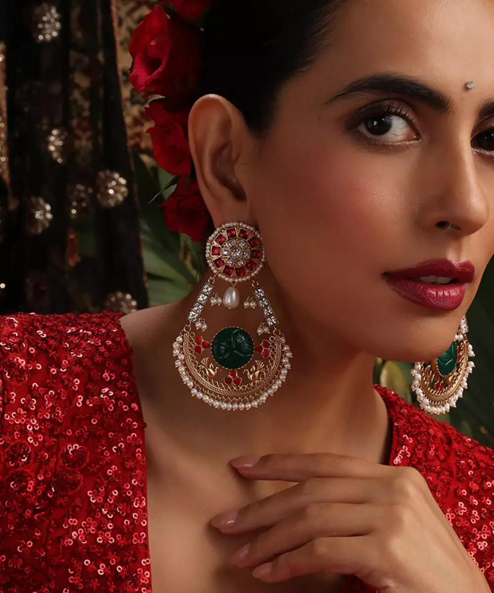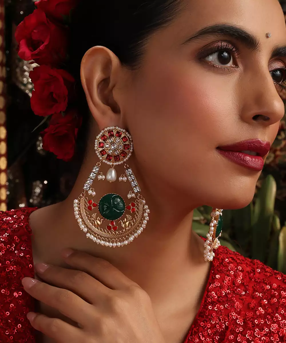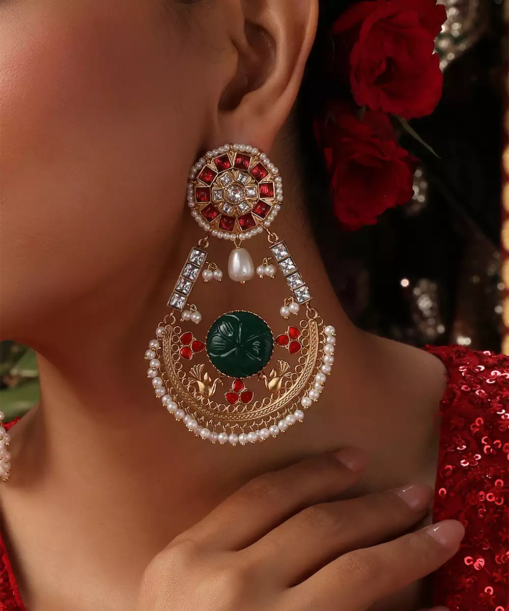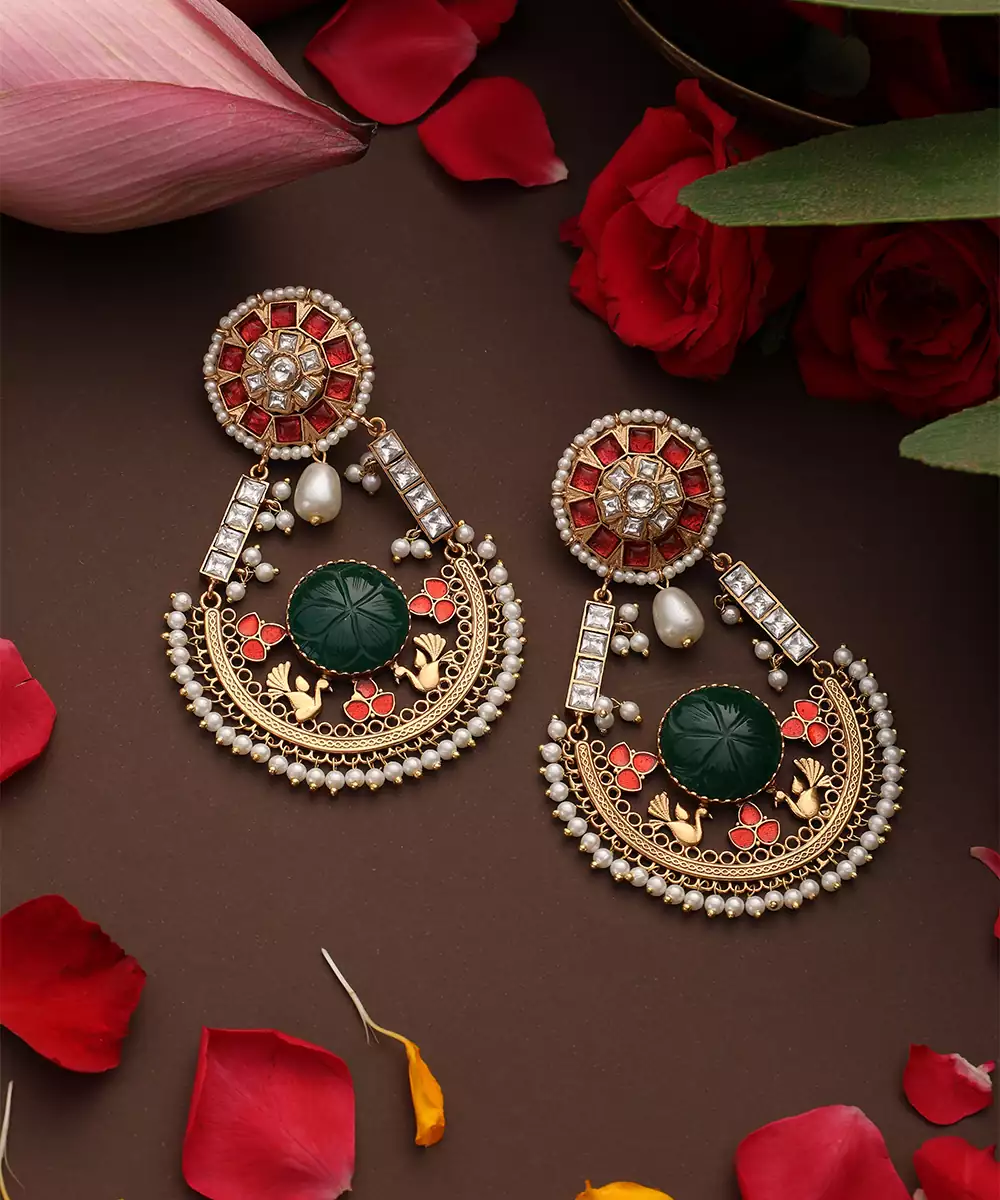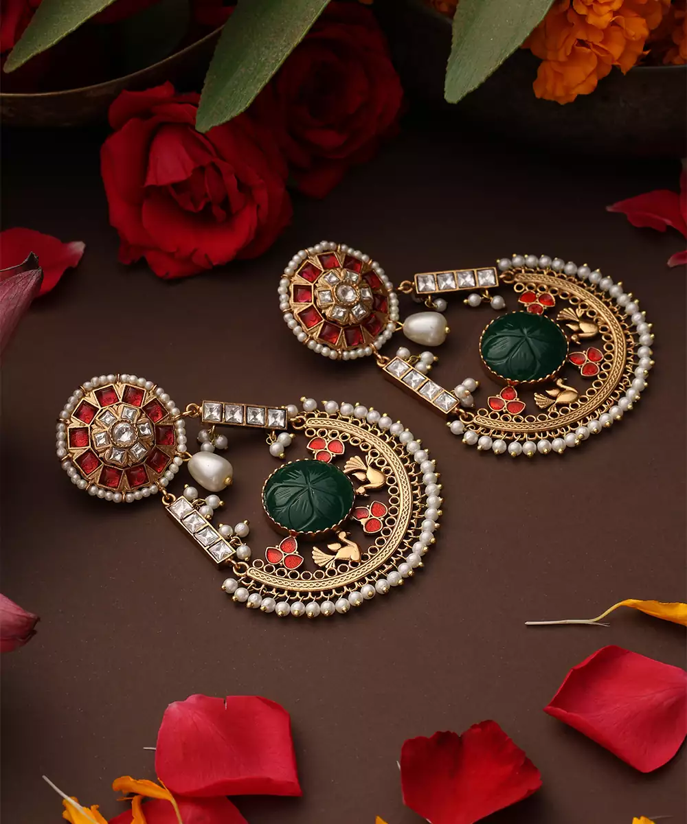 These Gold Plated Kundan Chandbali Earrings Are Adorned With Vibrant Multicolor Stones, Exuding Timeless Elegance And Festive Charm. Crafted With Intricate Kundan Detailing, They Beautifully Enhance Traditional And Bridal Looks. Perfect For Weddings And Special Occasions, They Add A Graceful, Statement Touch To Ethnic Ensembles.
