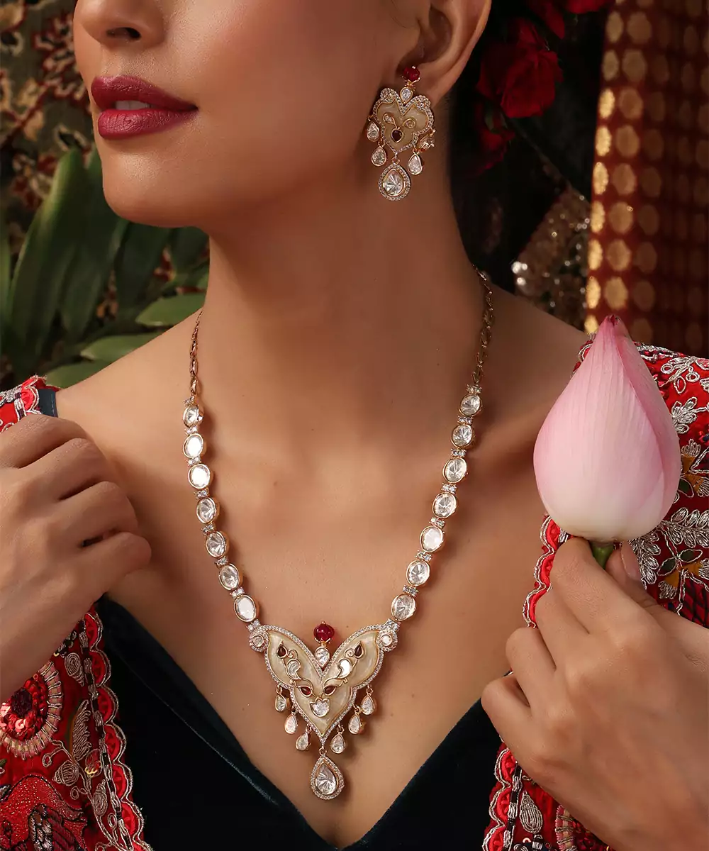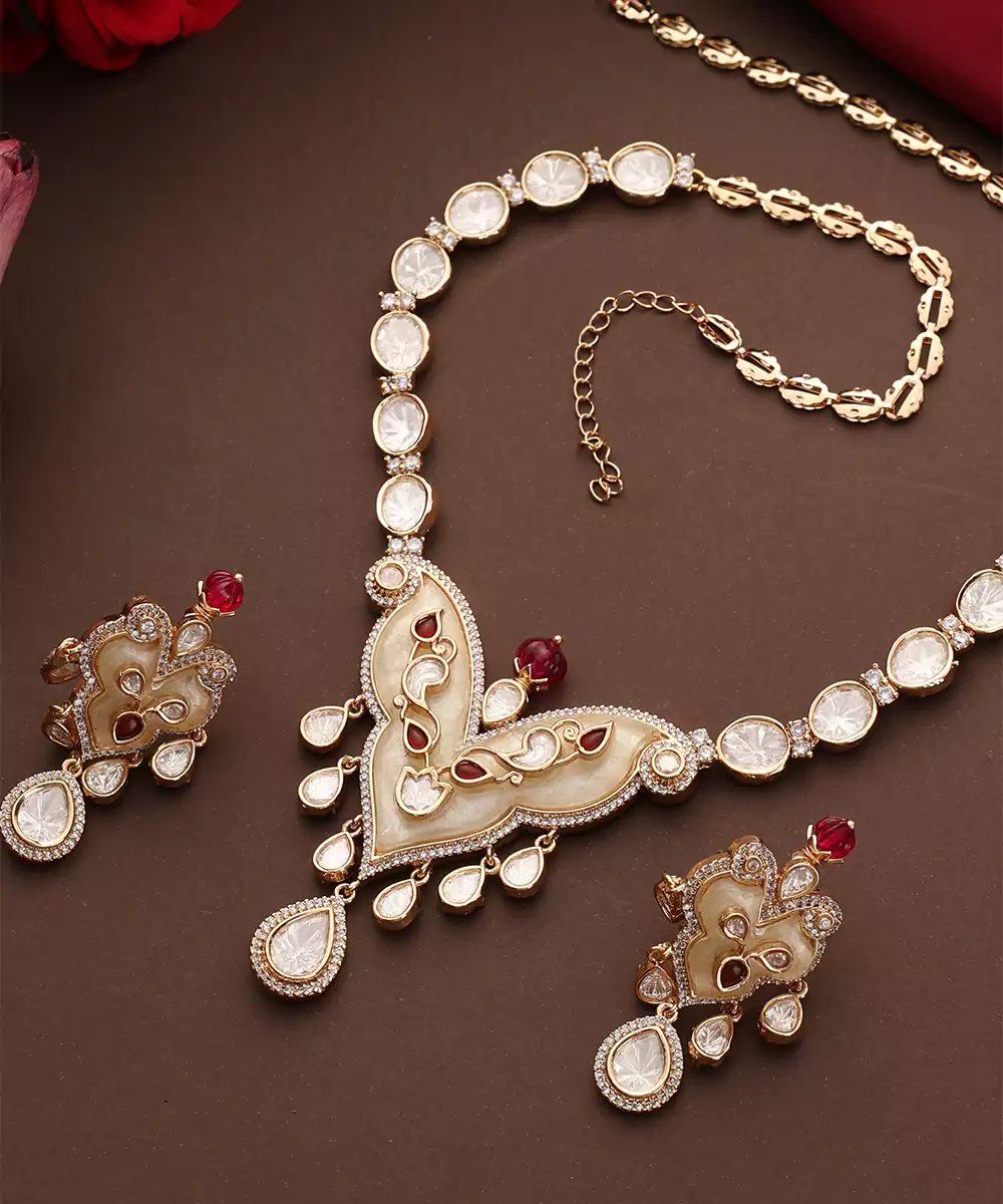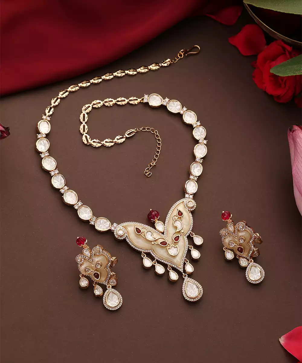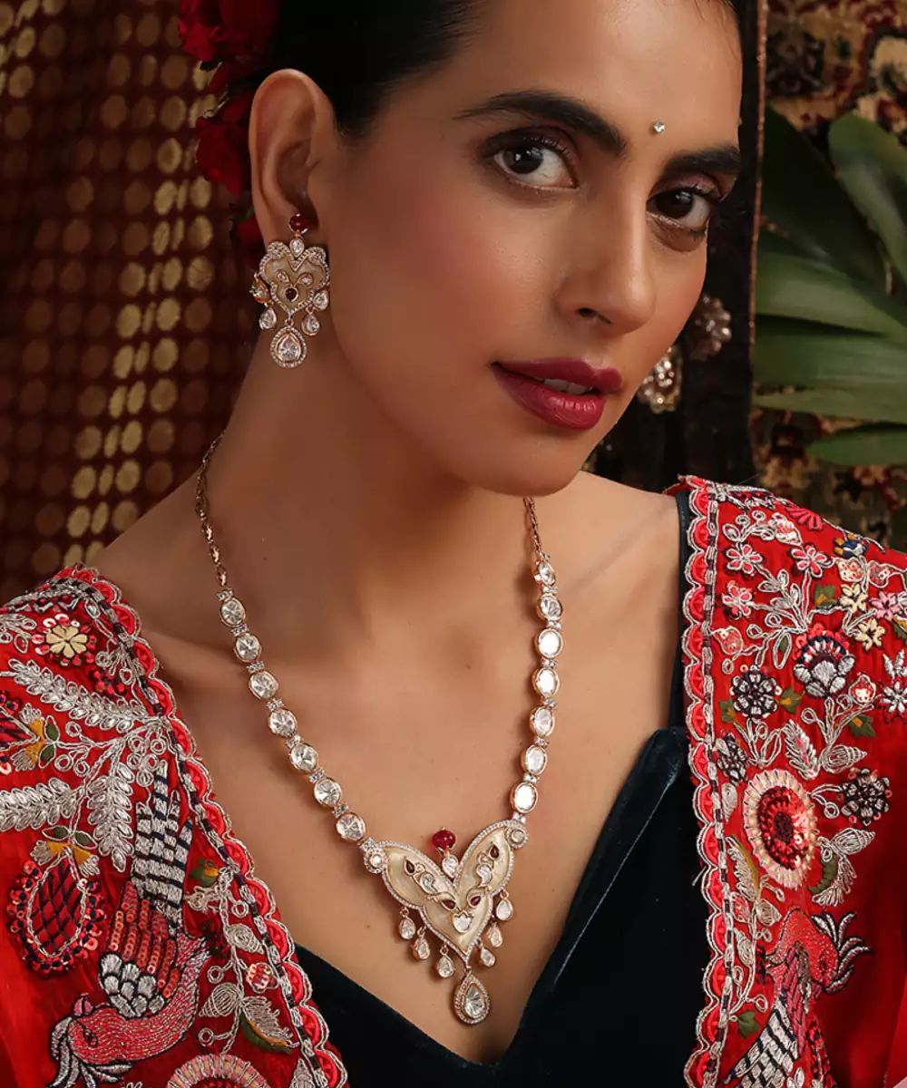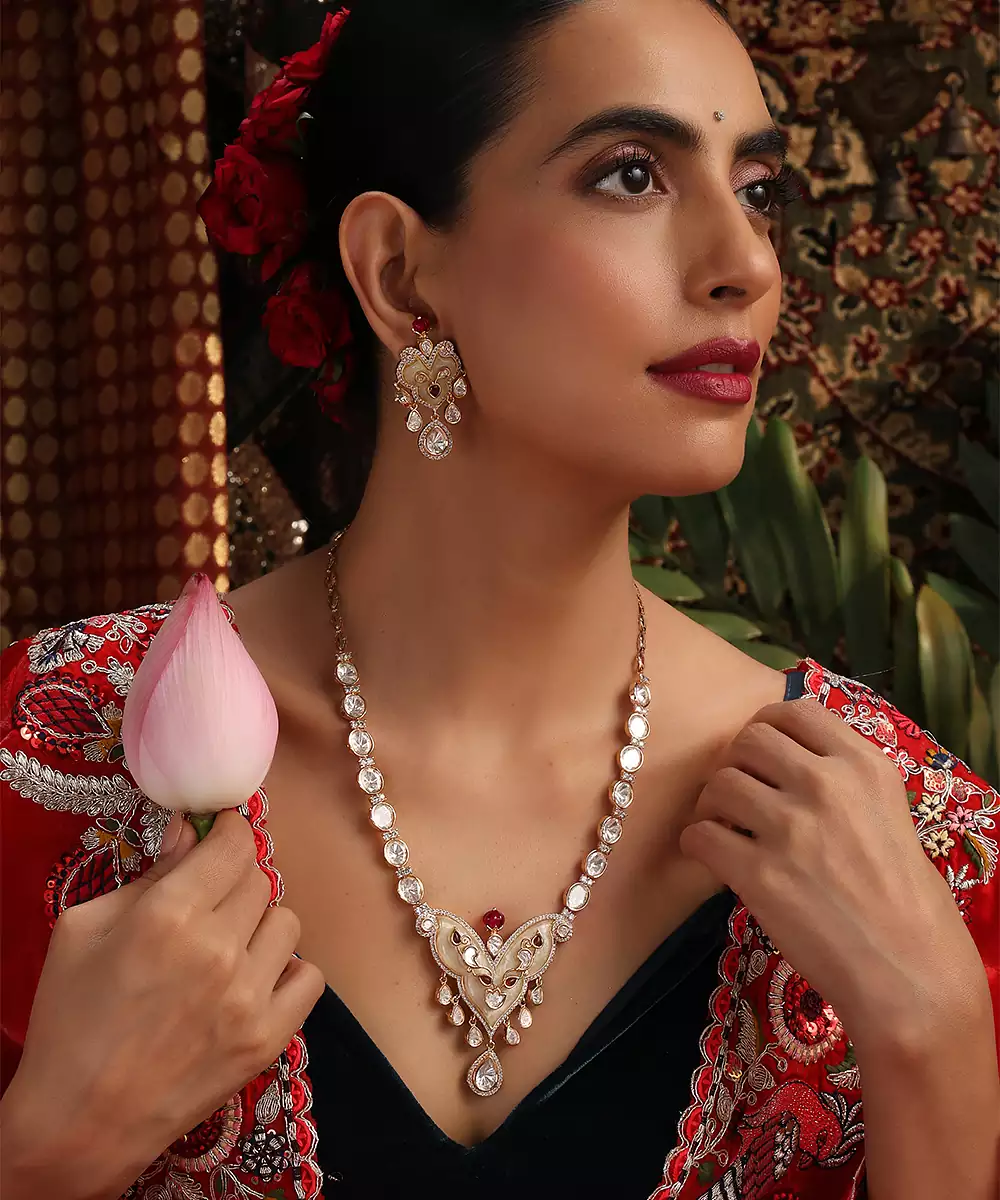 This Rose Gold Plated Pendant Necklace Set Is Adorned With Vibrant Multicolor Stones, Exuding Timeless Elegance And Festive Charm. Crafted With Intricate Detailing, It Beautifully Enhances Traditional And Bridal Attire. Perfect For Weddings And Special Occasions, It Adds A Graceful, Statement Touch To Ethnic Ensembles.