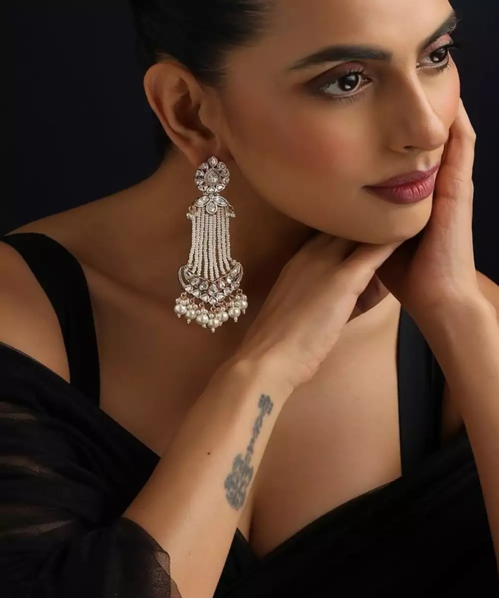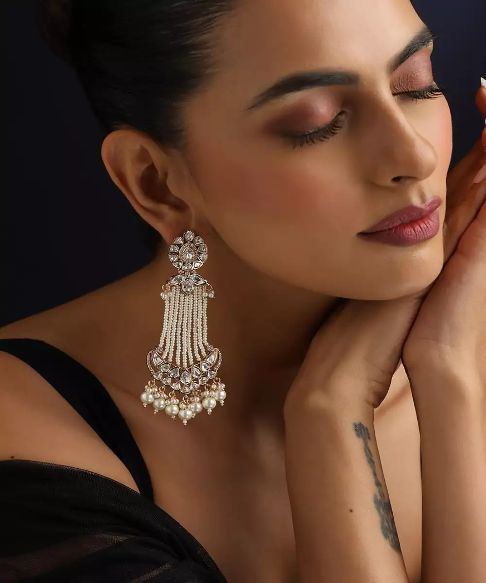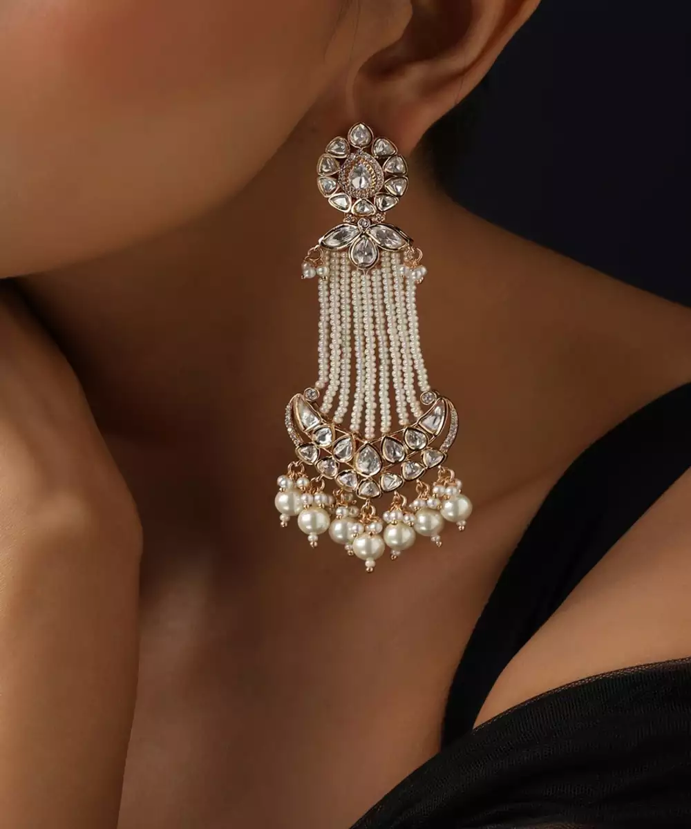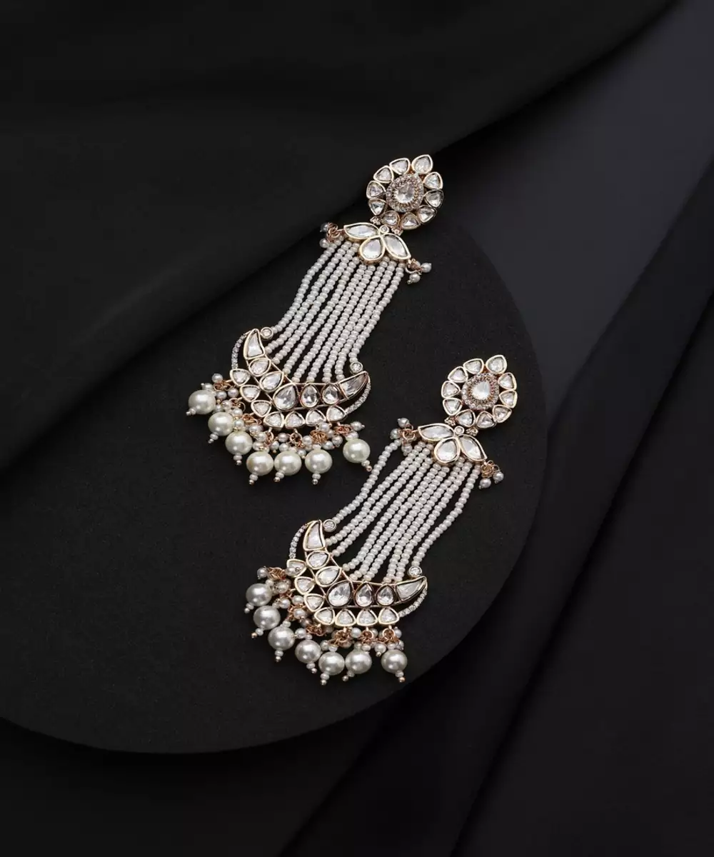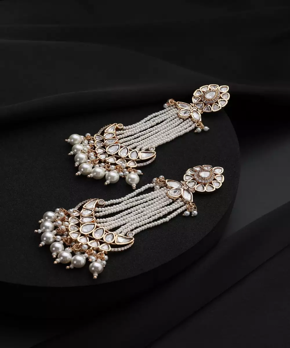 Experience The Epitome Of Elegance With These Stunning Gold Plated Polki Dangler Earrings. Cascading With Intricate Polki Work And A Radiant Gold Finish, These Earrings Sway With Every Step, Catching The Light Beautifully. Their Elaborate Design And Luxurious Feel Make Them The Perfect Statement Piece For Weddings And Grand Celebrations