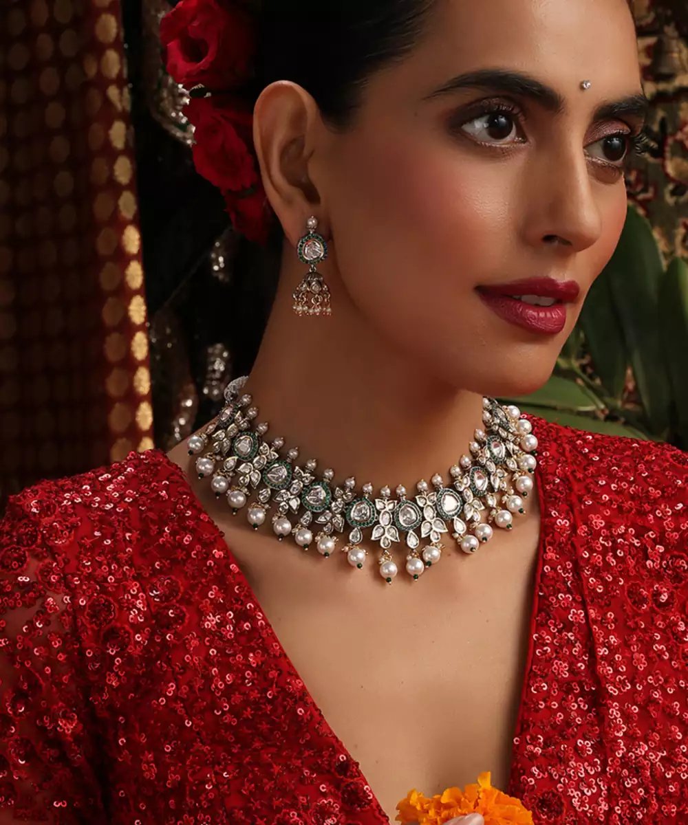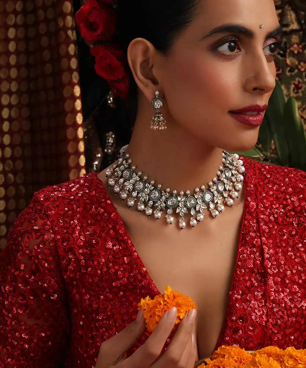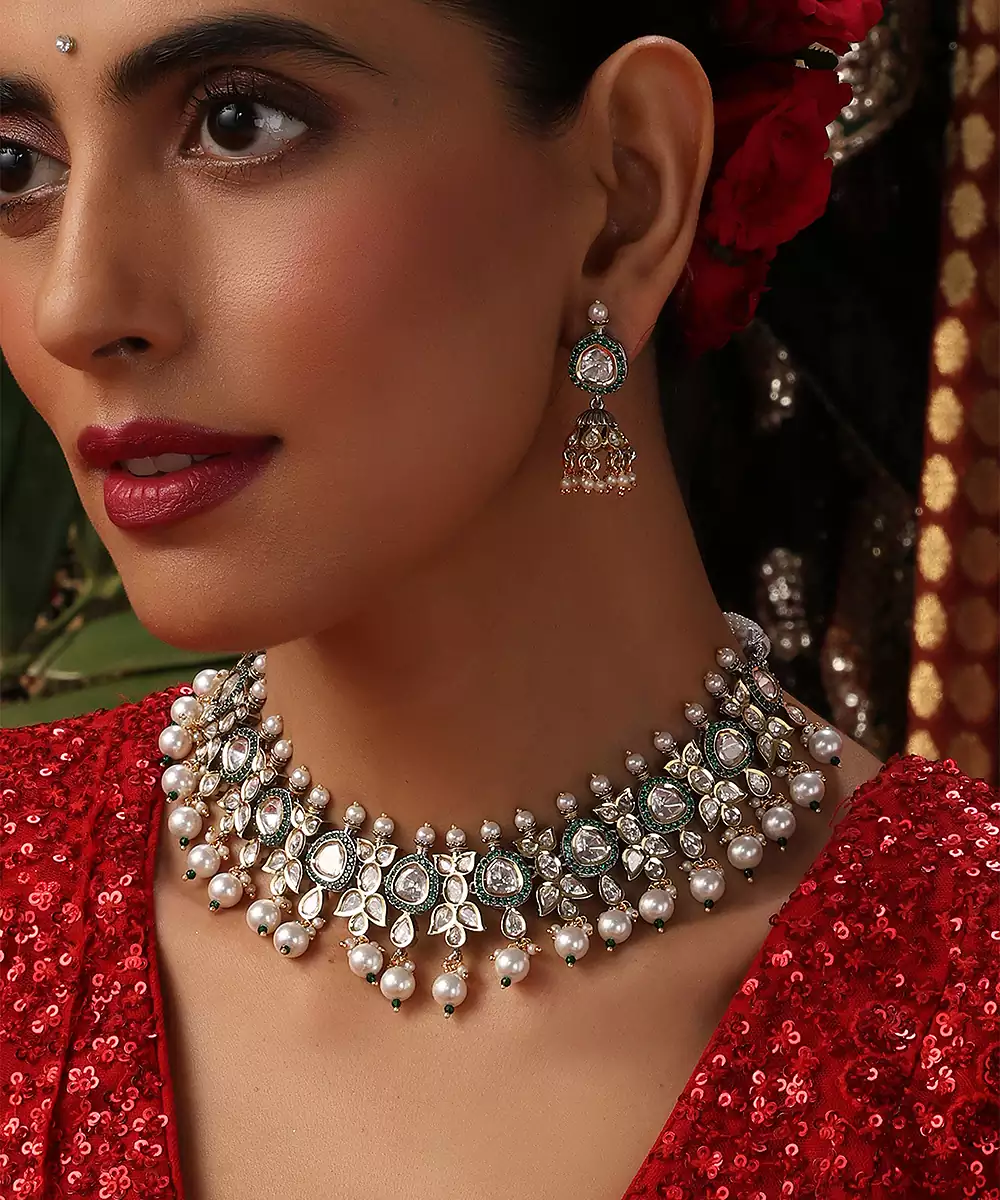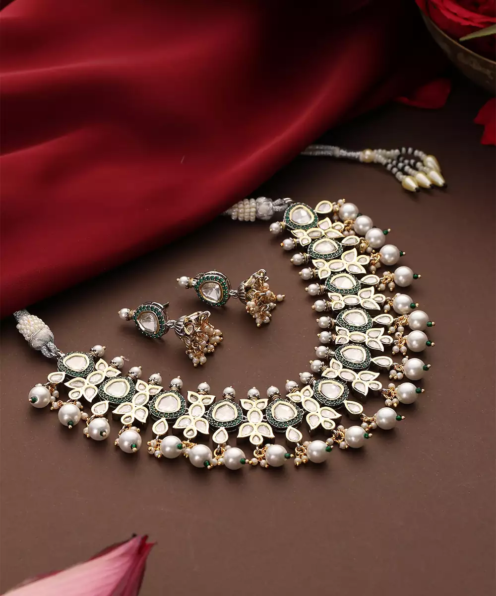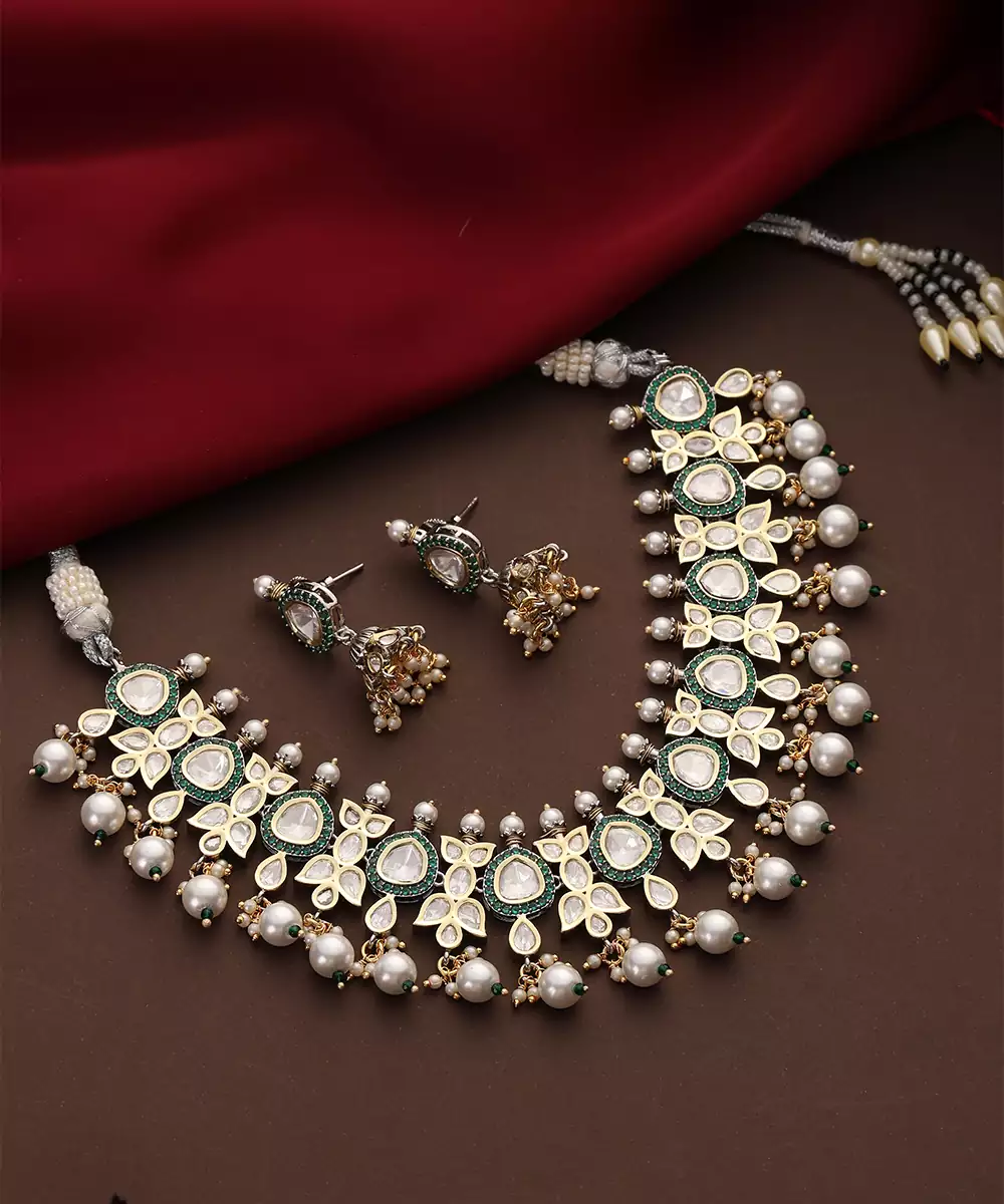 This Gold Plated Kundan Necklace Set Is Adorned With Vibrant Green Stones, Exuding Timeless Elegance And Traditional Charm. Crafted With Intricate Kundan Detailing, It Beautifully Enhances Festive And Bridal Attire. Perfect For Weddings And Special Occasions, It Adds A Graceful, Statement Touch To Ethnic Ensembles.