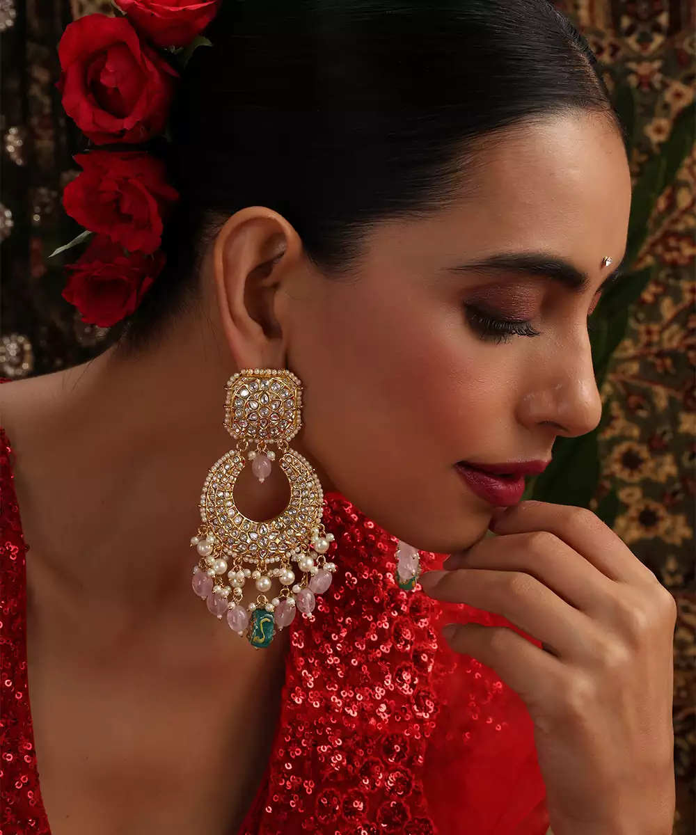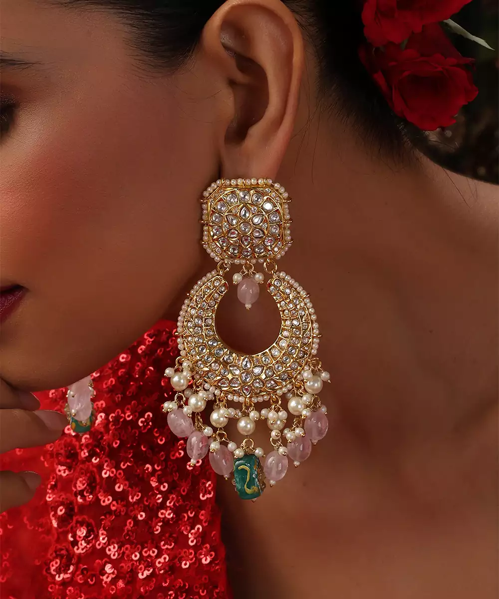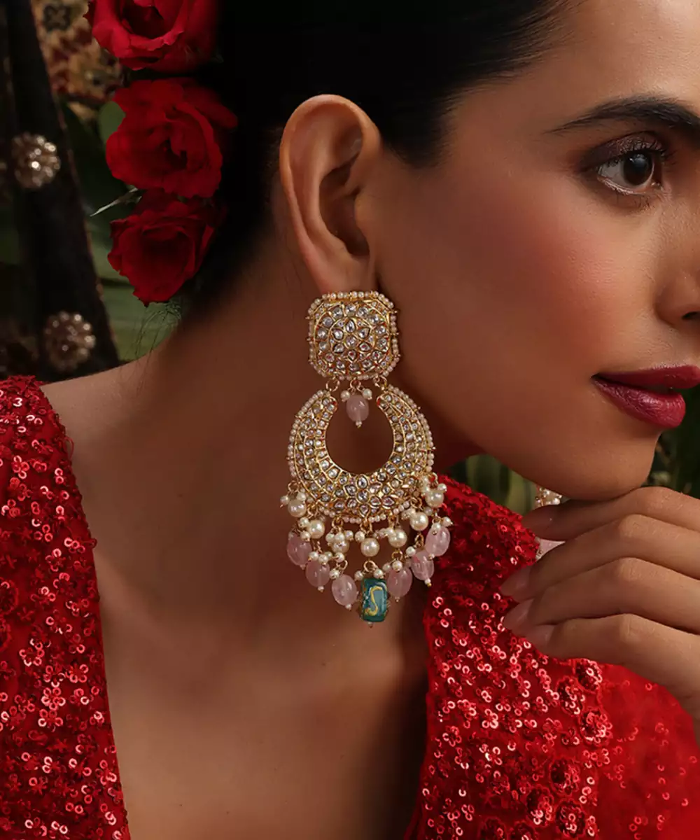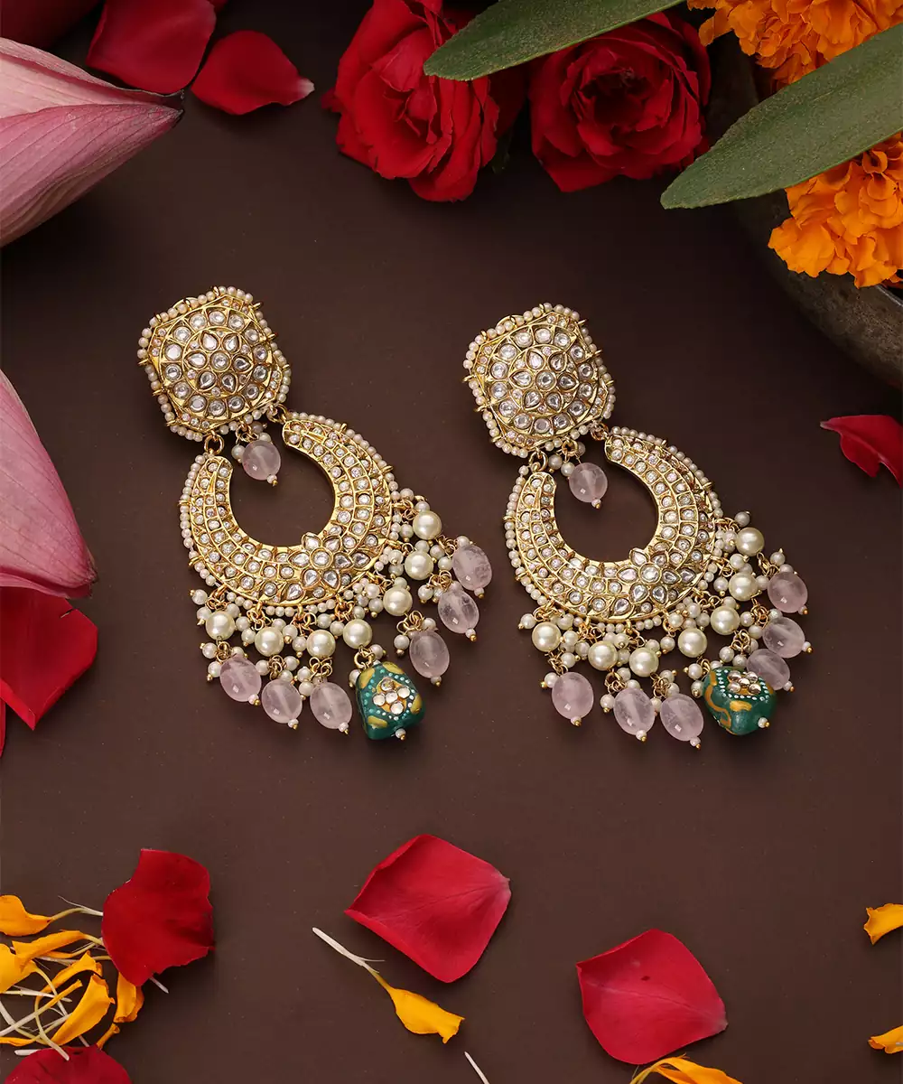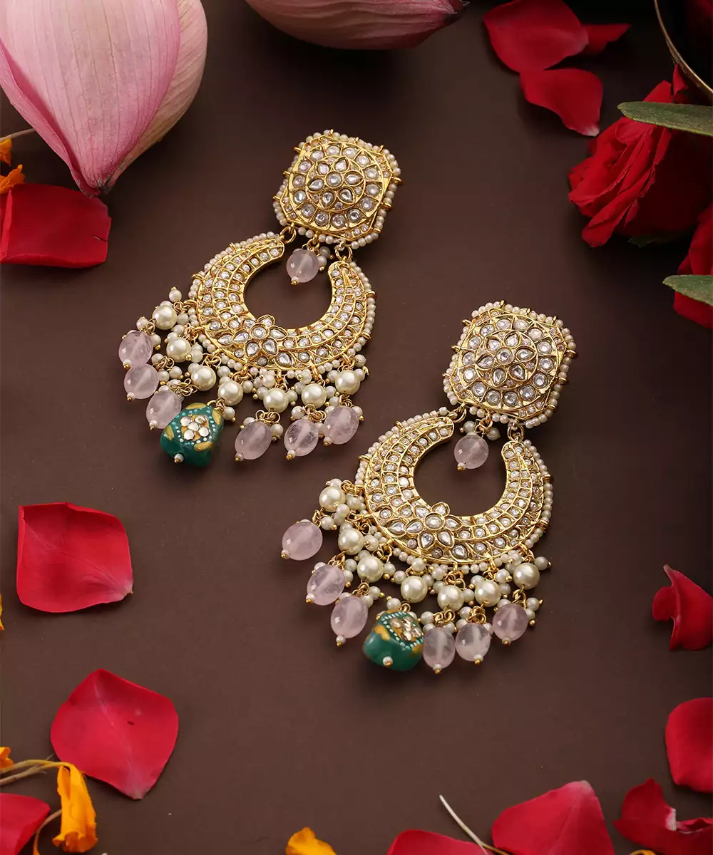 These Gold Plated Kundan Chandbali Earrings Are Adorned With Delicate Pink Stones, Exuding Timeless Elegance And Feminine Charm. Featuring Intricate Craftsmanship, They Beautifully Complement Festive And Traditional Attire. Perfect For Weddings And Celebrations, They Add A Graceful Statement With Refined Sophistication.