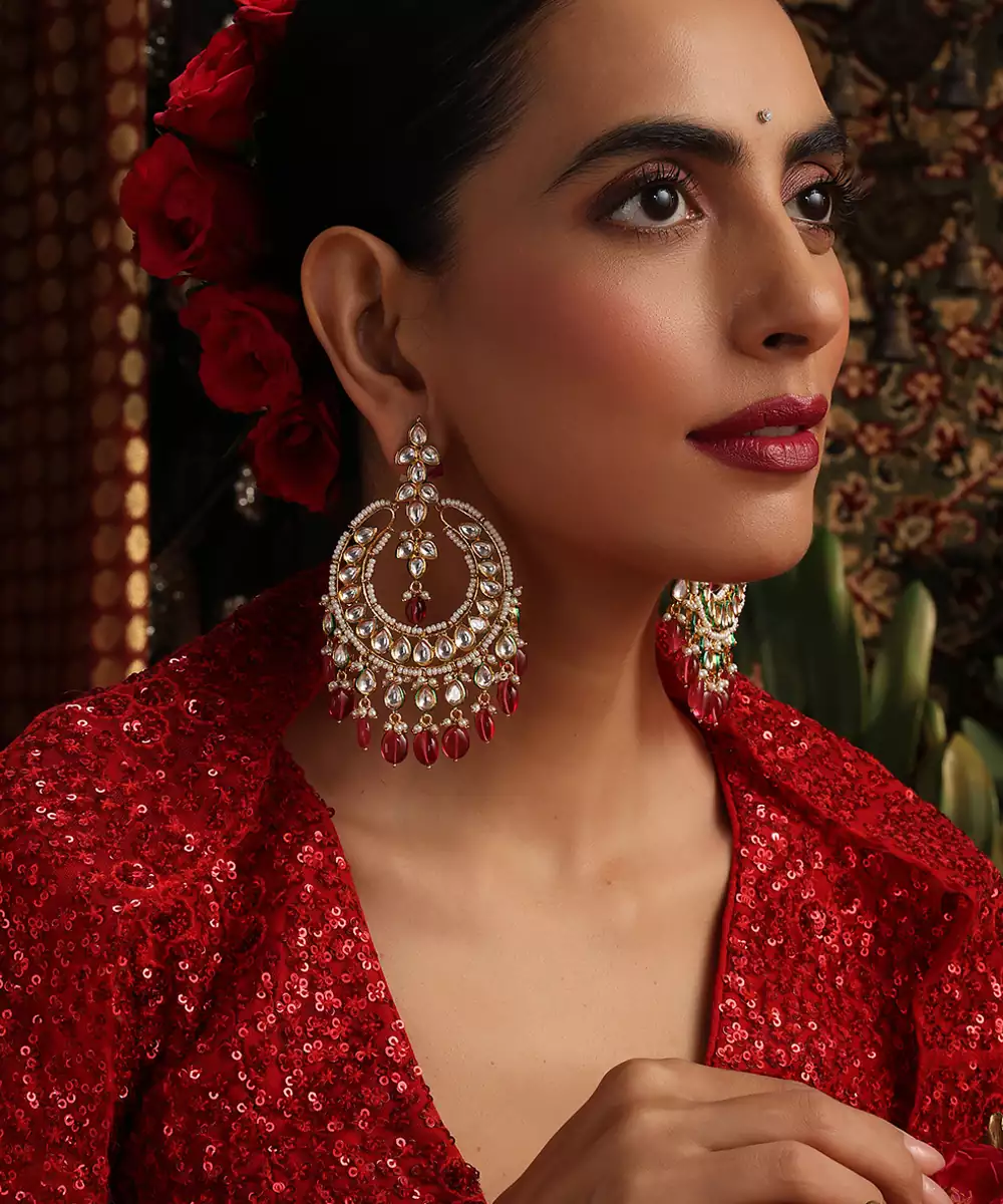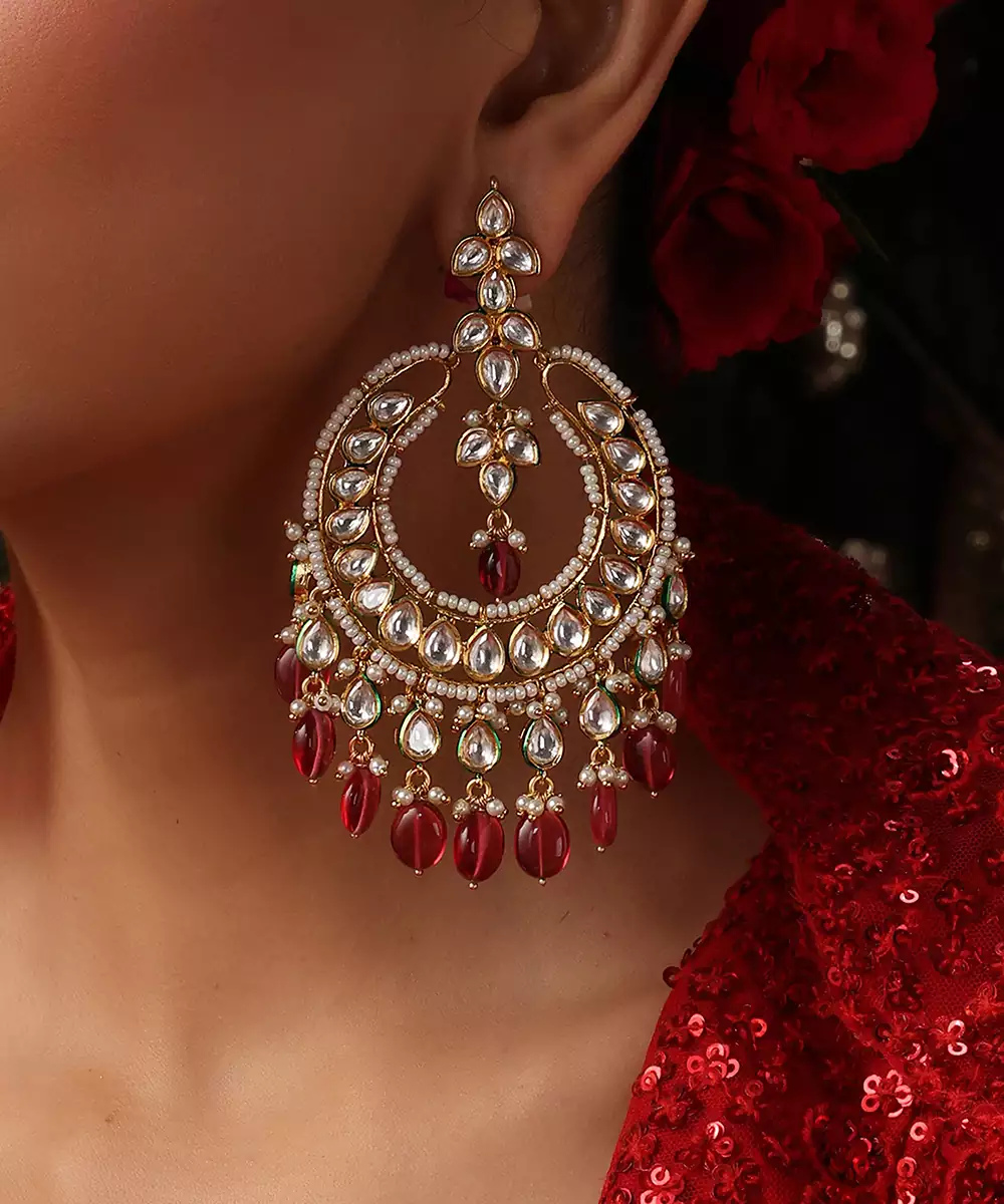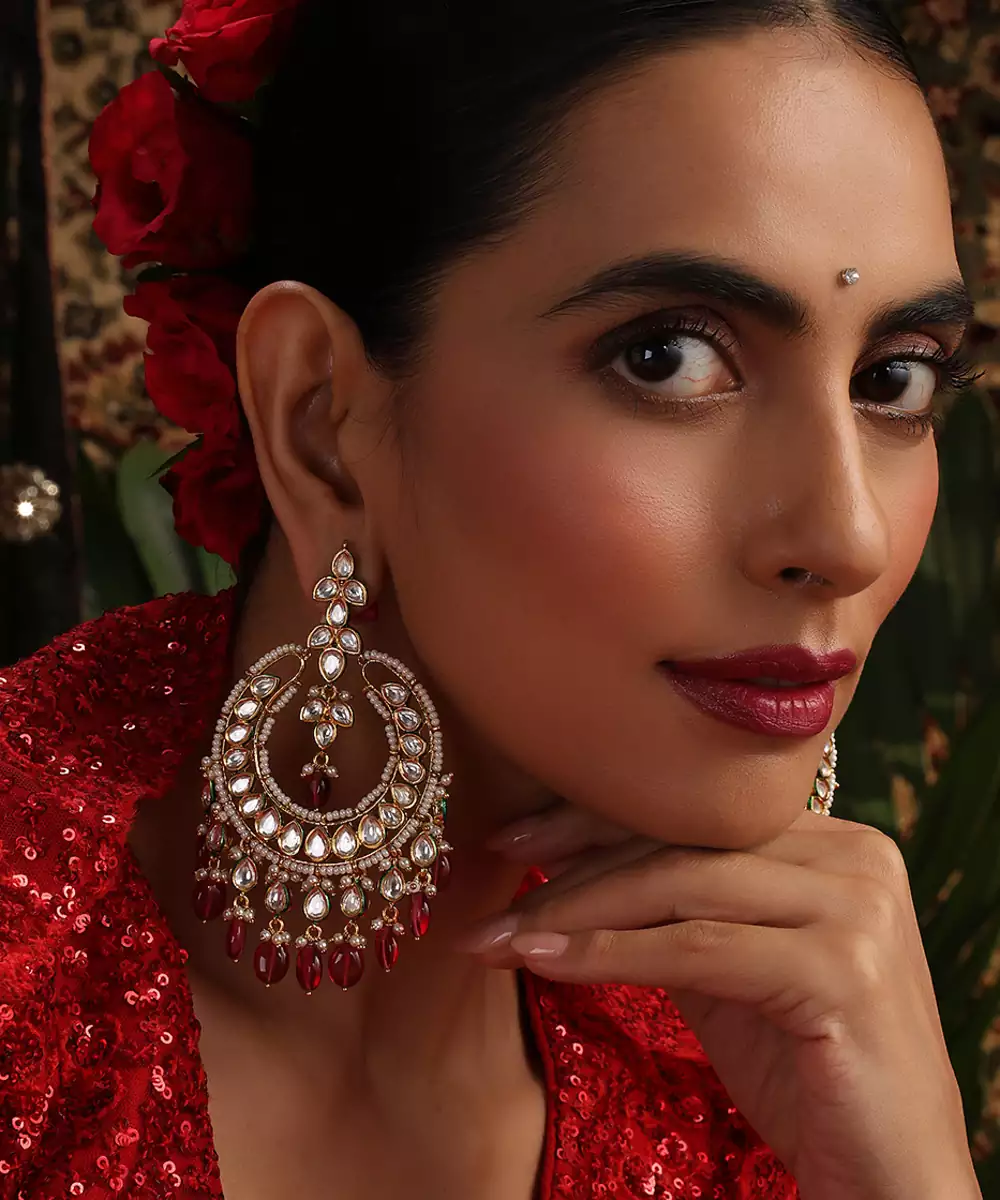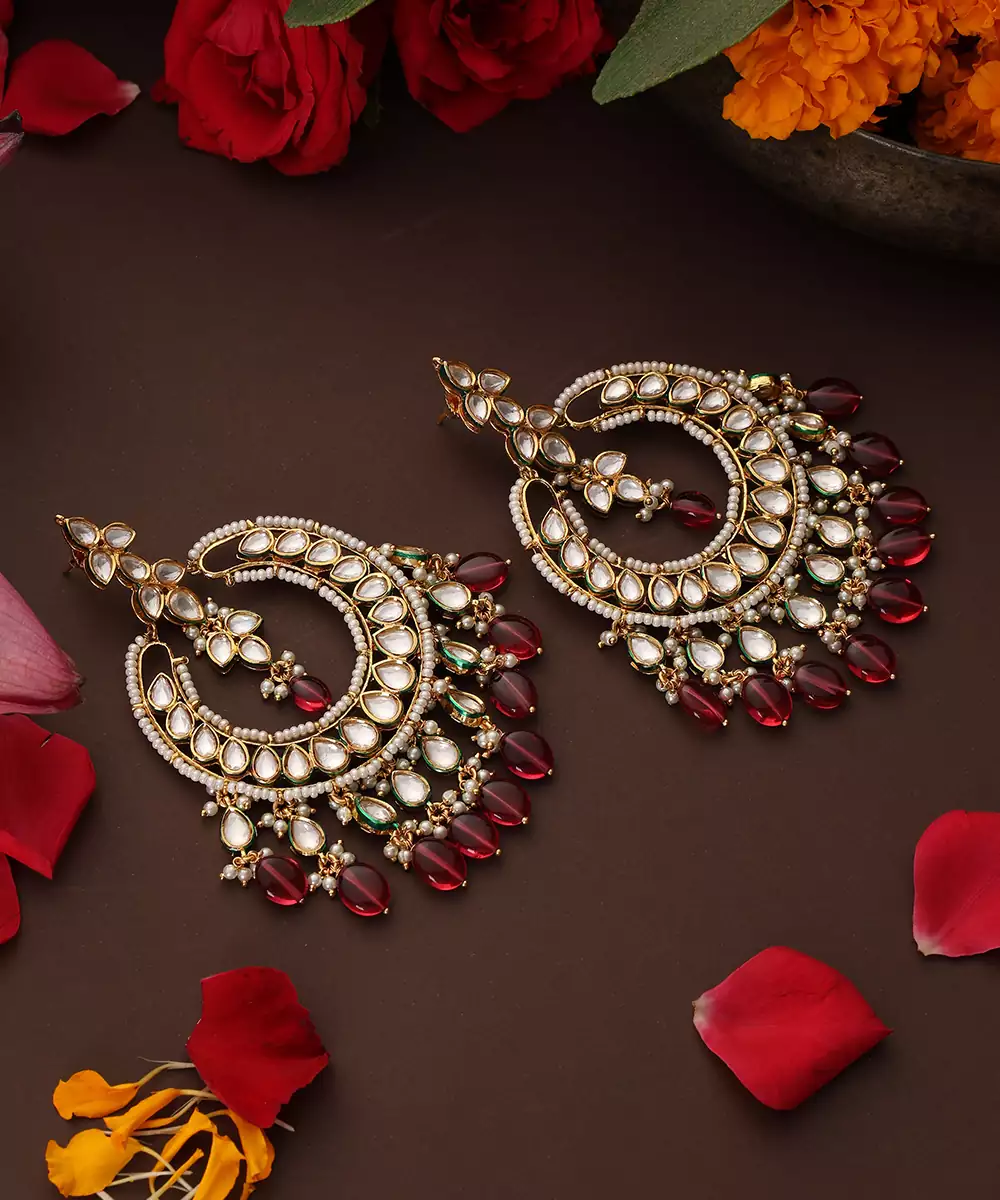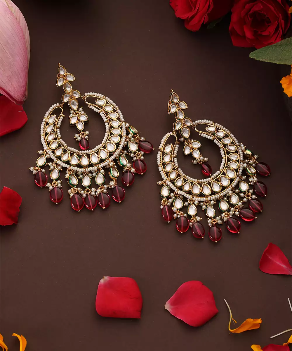 These Gold Plated Kundan Chandbali Earrings Are Adorned With Vibrant Red Stones, Exuding Timeless Elegance And Traditional Charm. Featuring Intricate Craftsmanship, They Beautifully Frame The Face And Enhance Festive And Bridal Looks. Perfect For Weddings And Special Occasions, They Add A Graceful, Statement Touch To Ethnic Ensembles.