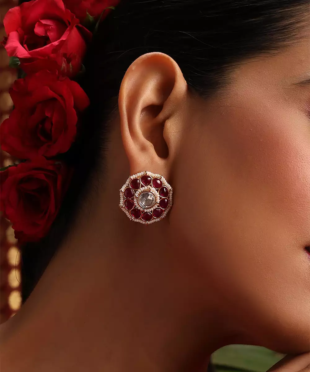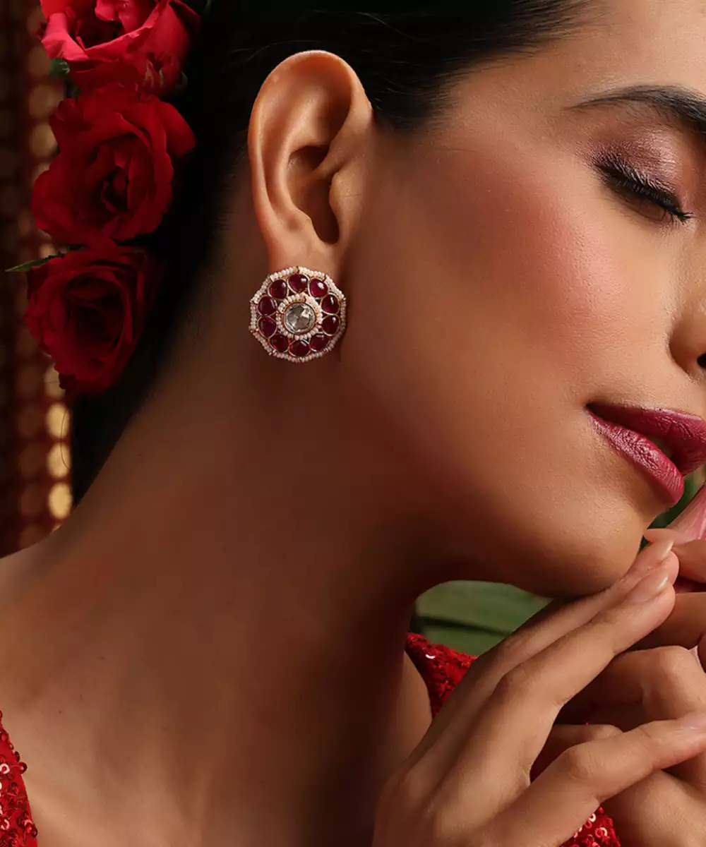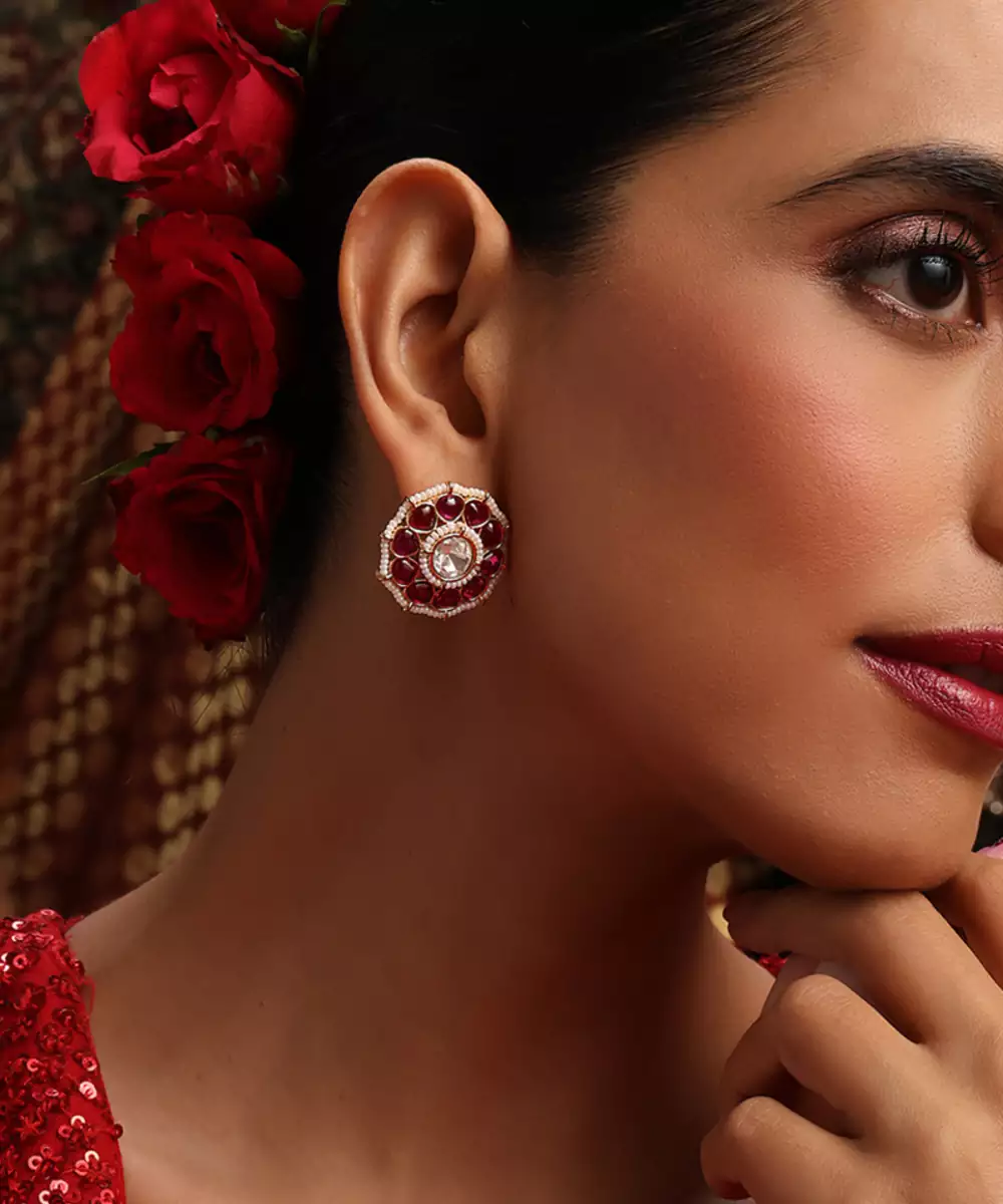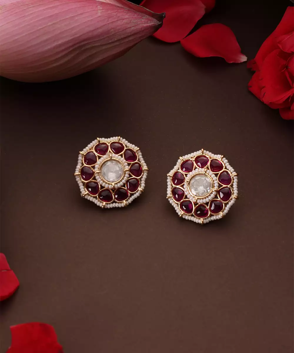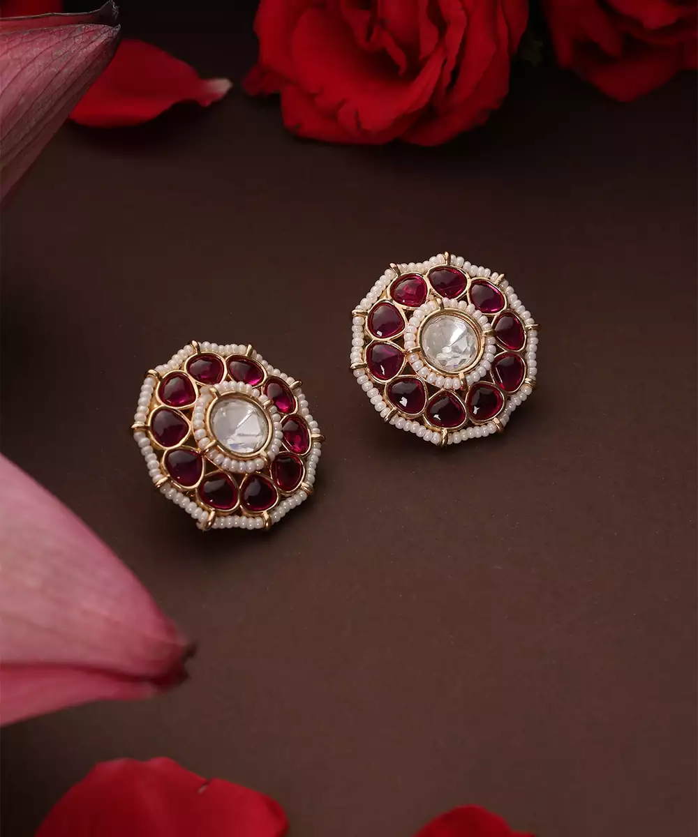 These Gold Plated Kundan Stud Earrings Are Adorned With Striking Red Stones, Radiating Timeless Elegance And Traditional Charm. Crafted With Intricate Detailing, They Add A Subtle Yet Graceful Touch To Festive And Bridal Looks. Perfect For Weddings And Special Occasions, They Enhance Ethnic Ensembles With Refined Sophistication.