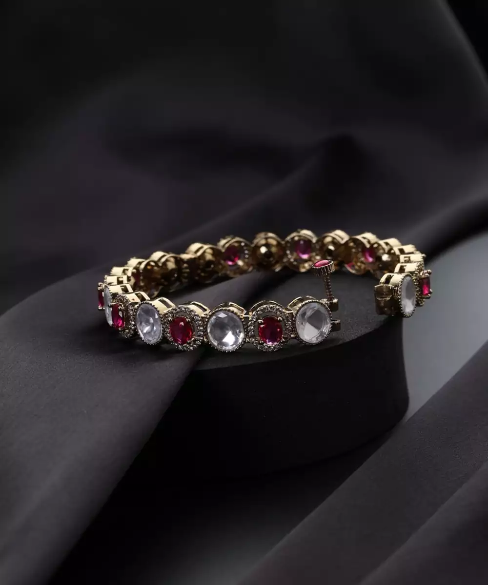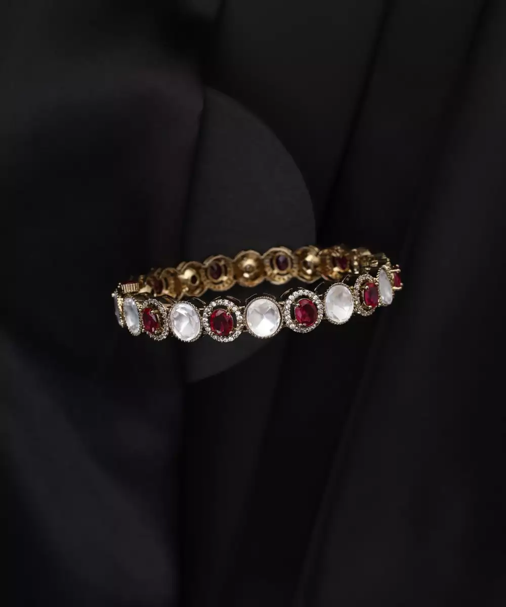 A Striking Blend Of Tradition And Vibrancy, This Gold Plated Polki Bangle Features A Captivating Red Stone At Its Center. The Intricate Polki Work And Antique Gold Finish Create A Luxurious Setting For The Bold, Ruby Like Hue. This Magnificent Piece Is A True Statement Accessory, Perfect For Adding A Touch Of Drama And Elegance To Your Festive Attire