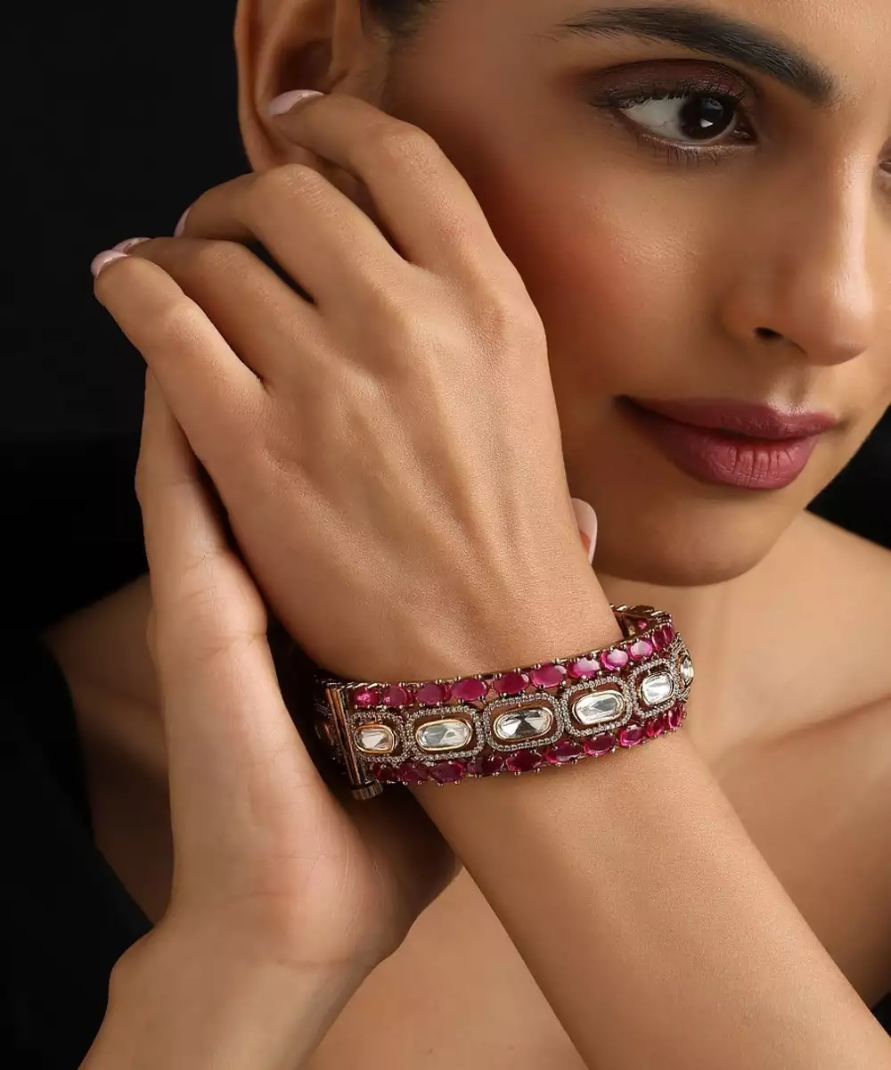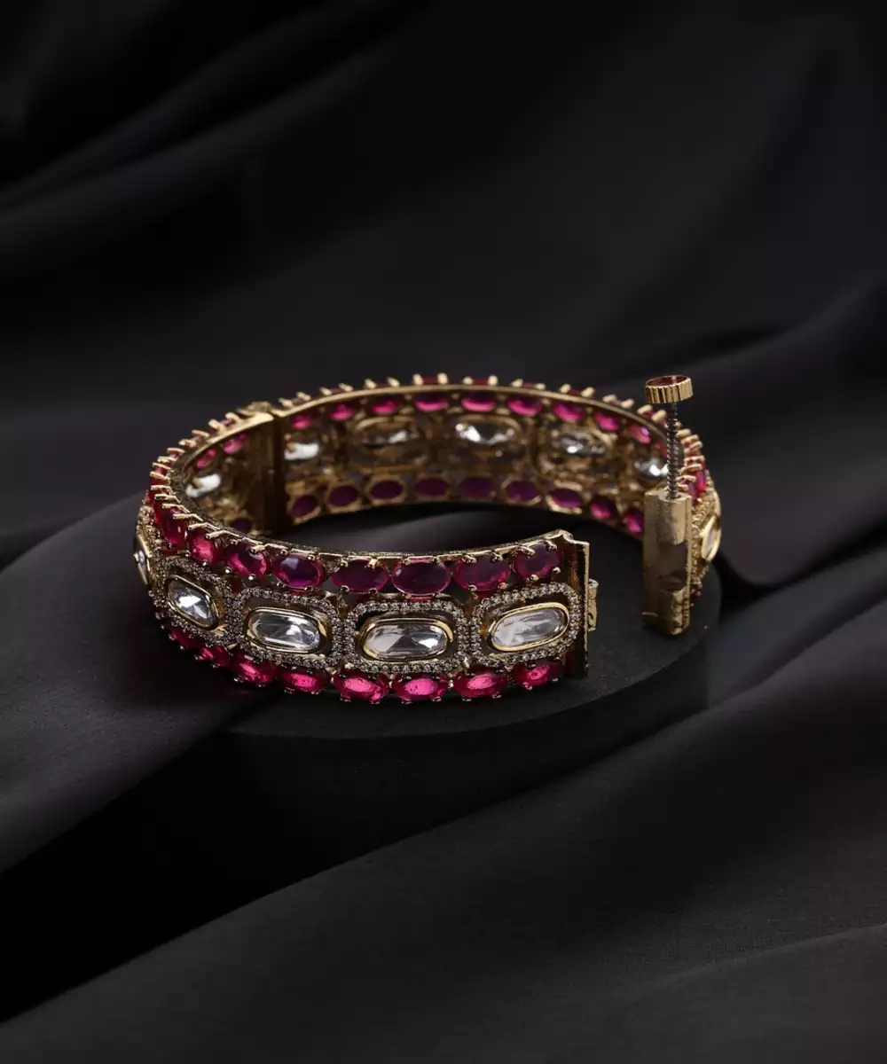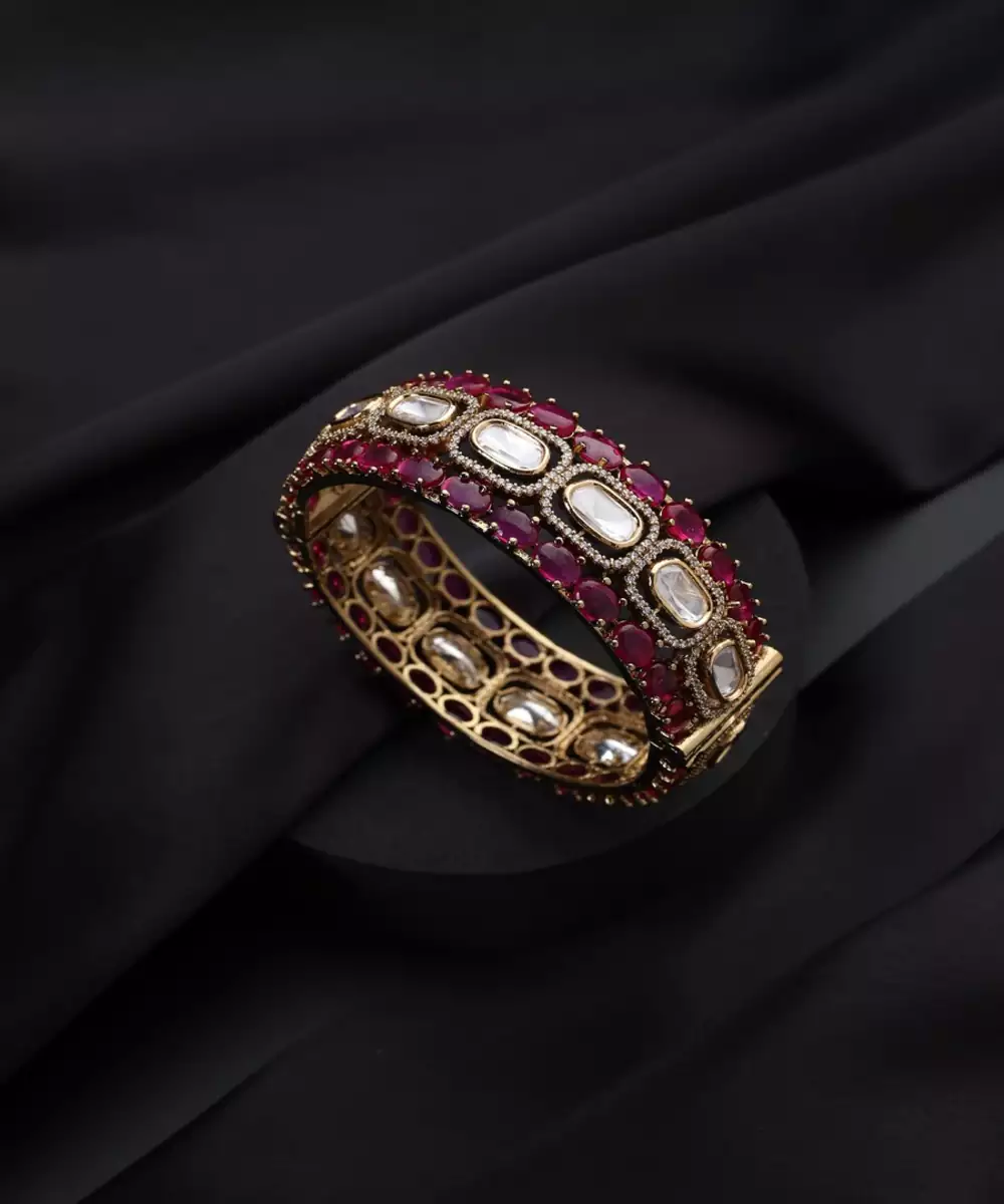 A Striking Blend Of Tradition And Vibrancy, This Gold Plated Polki Bangle Features A Captivating Red Stone At Its Center. The Intricate Polki Work And Antique Gold Finish Create A Luxurious Setting For The Bold, Ruby Like Hue. This Magnificent Piece Is A True Statement Accessory, Perfect For Adding A Touch Of Drama And Elegance To Your Festive Attire.