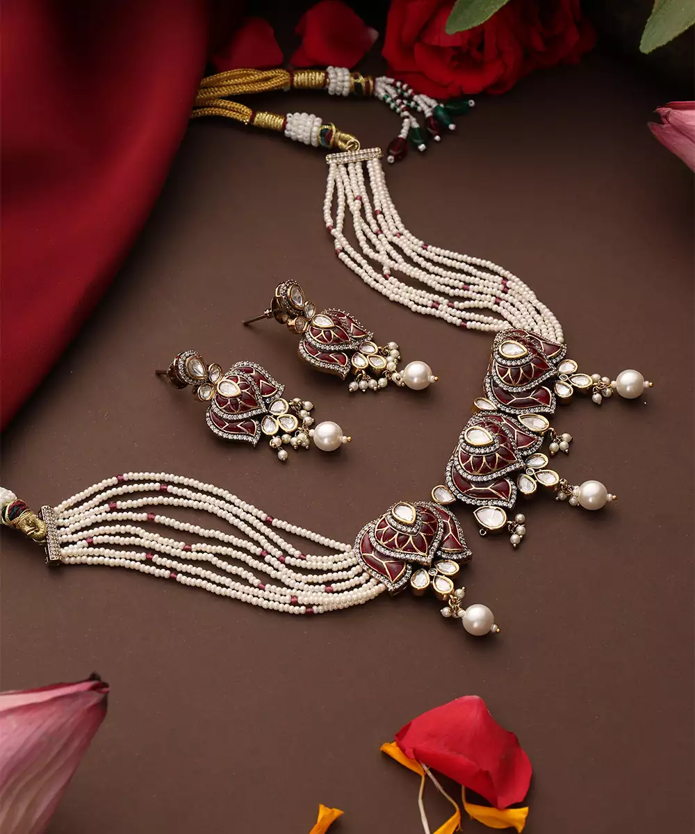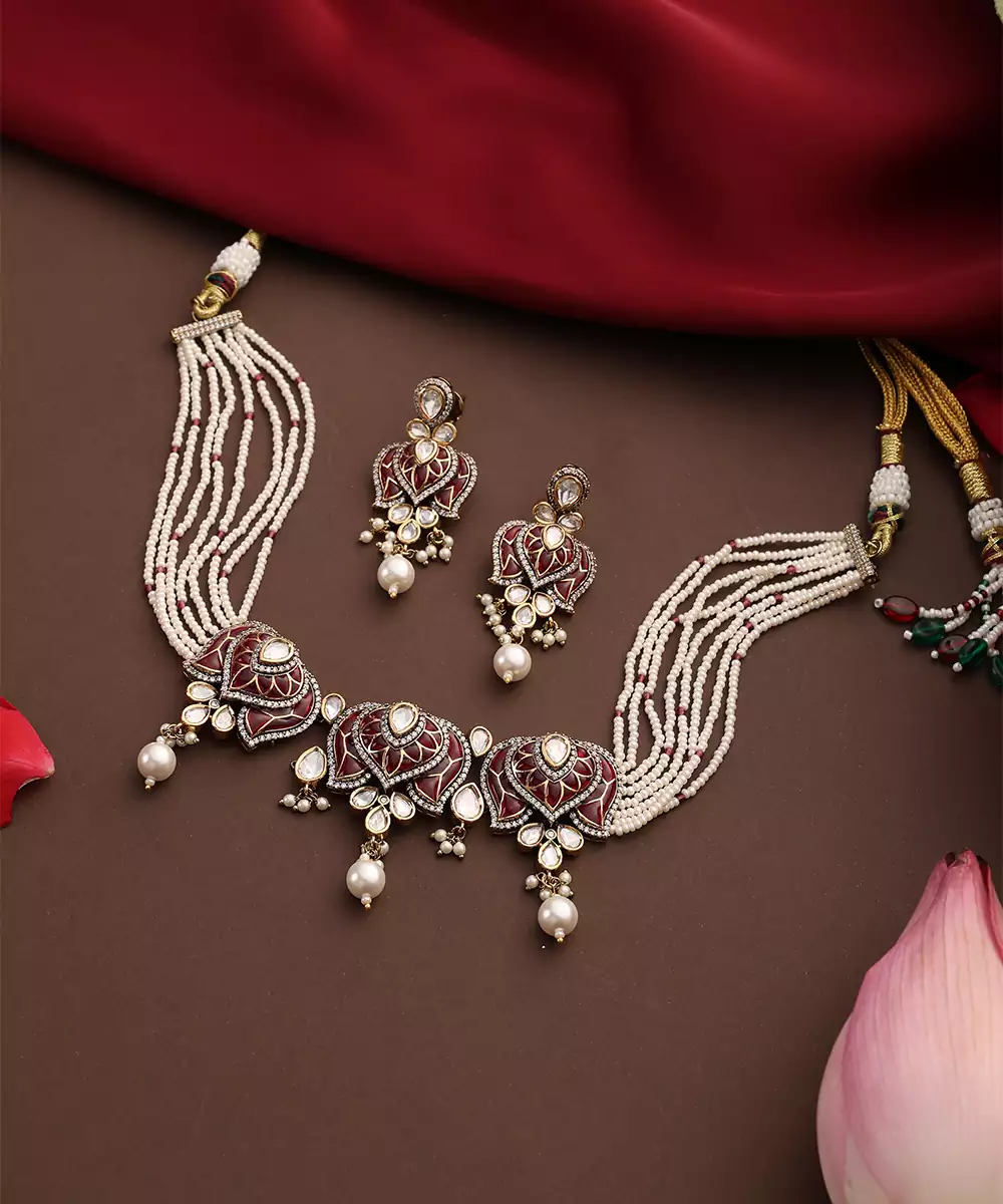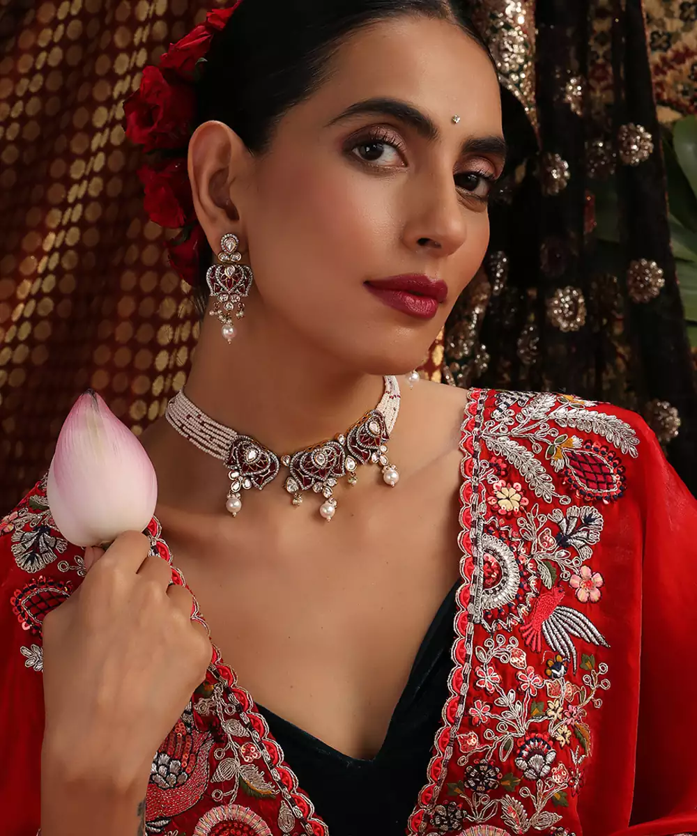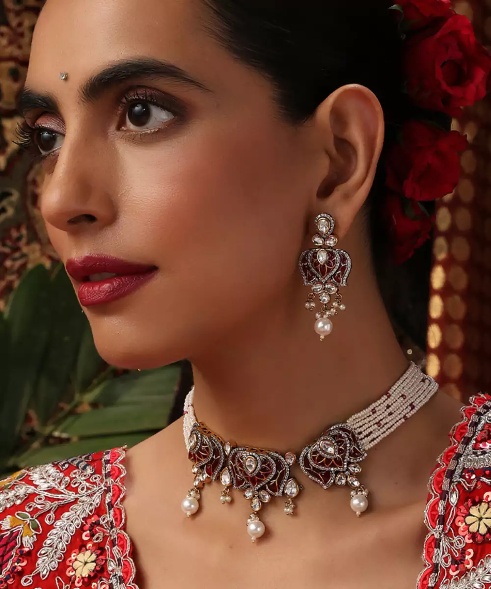 This Gold Plated Kundan Choker Necklace Set Is Adorned With Striking Red Stones, Exuding Timeless Elegance And Regal Charm. Featuring Intricate Kundan Craftsmanship, It Beautifully Enhances Traditional And Festive Attire. Perfect For Weddings And Special Occasions, It Adds A Graceful, Statement Touch To Ethnic Ensembles.
