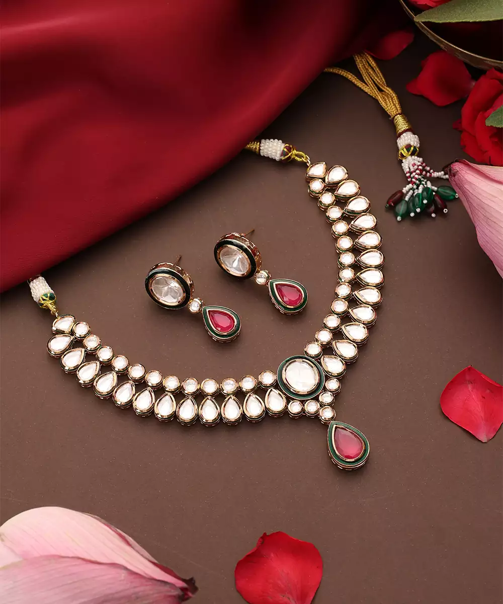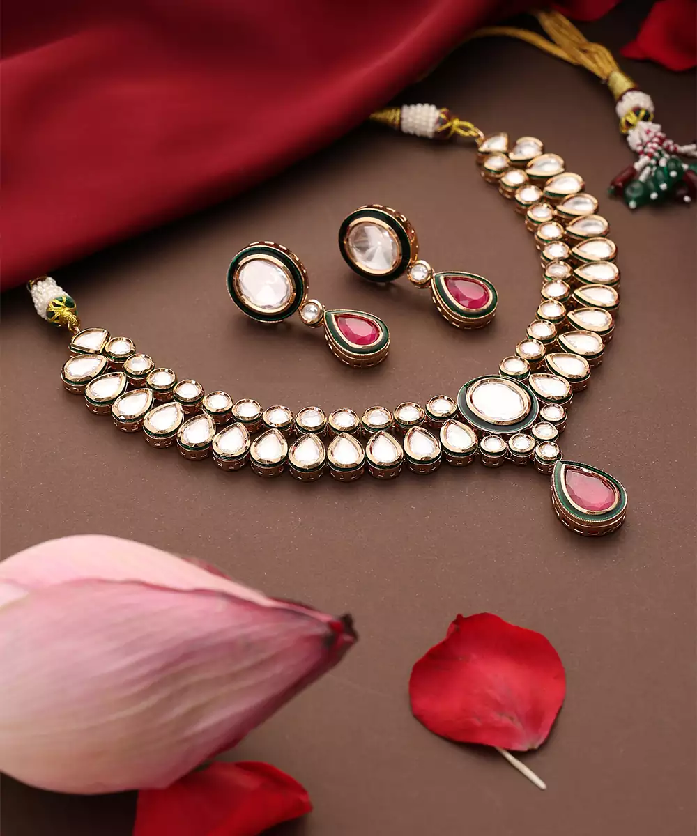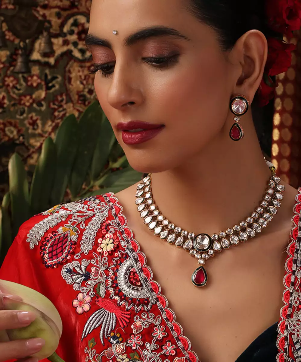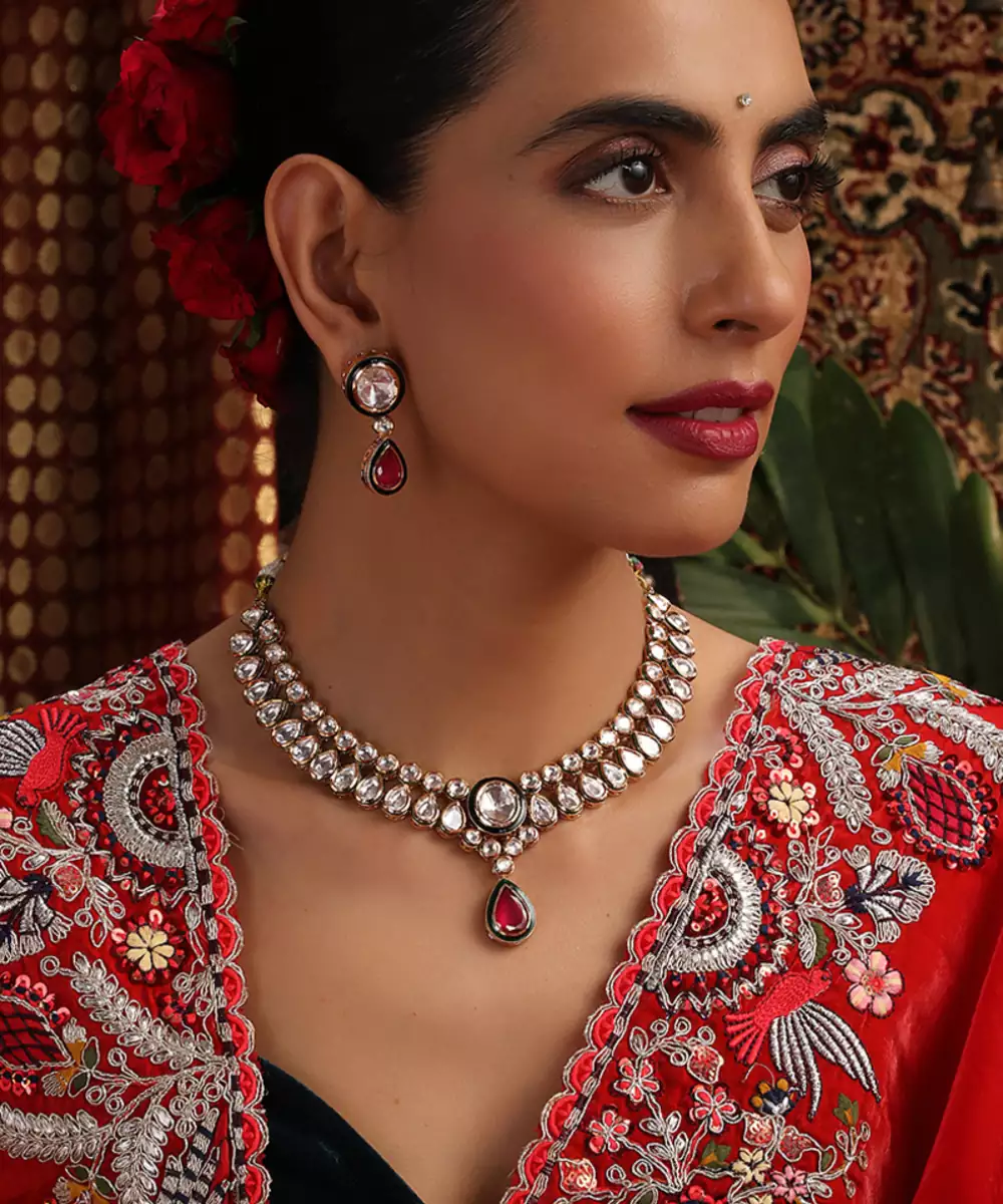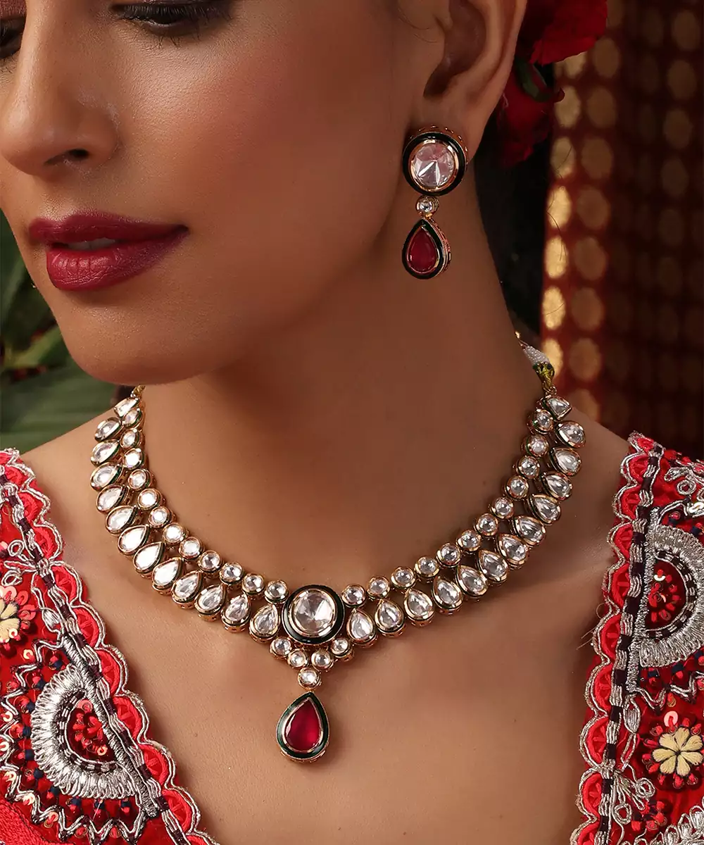 This Rose Gold Plated Kundan Necklace Set Is Adorned With Striking Red Stones, Exuding Timeless Elegance And Festive Charm. Crafted With Intricate Kundan Detailing, It Beautifully Enhances Traditional And Bridal Attire. Perfect For Weddings And Special Occasions, It Adds A Graceful, Statement Touch To Ethnic Ensembles.