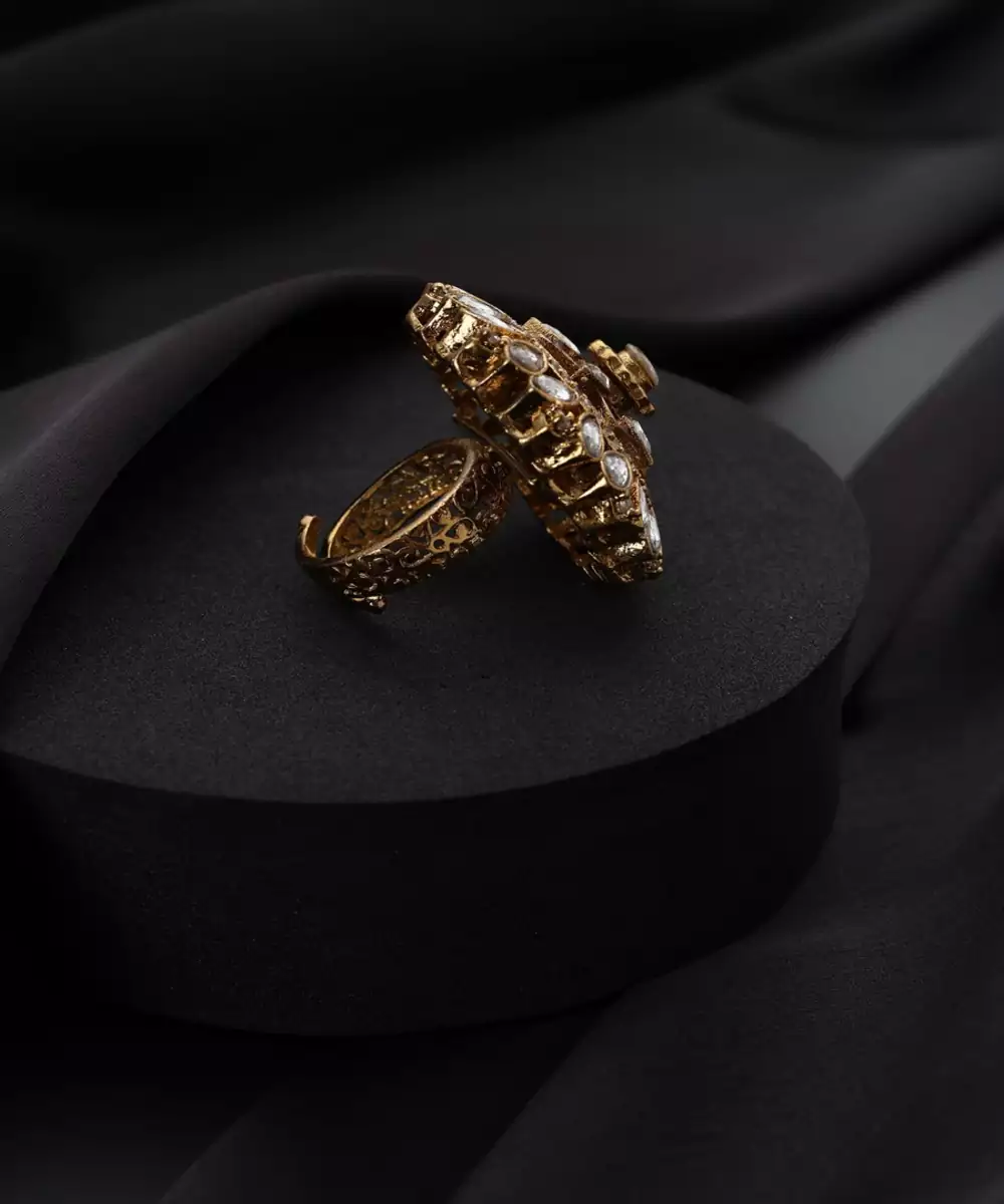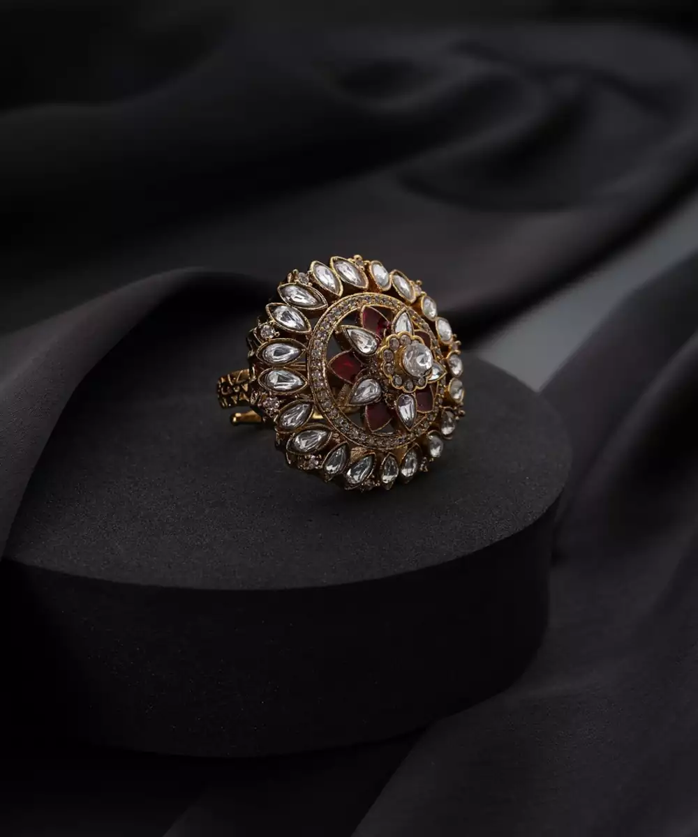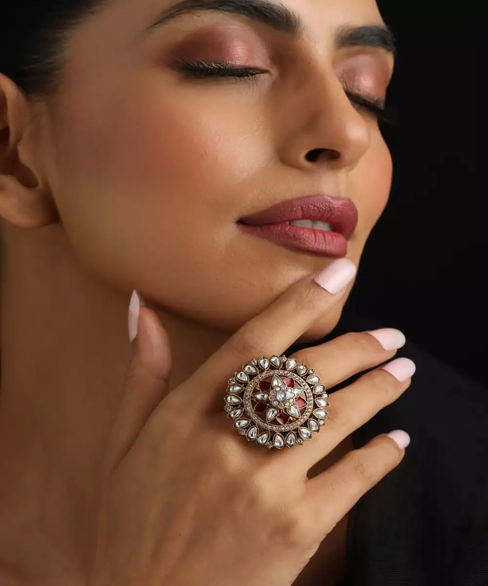 A Timeless Masterpiece, This Gold Plated Polki Ring Showcases A Radiant Red Stone At Its Heart. Intricate, Traditional Polki Work Surrounds The Central Gem, Creating A Dazzling Halo Of Light. Its Antique Finish And Rich Detailing Evoke A Sense Of Heritage And Luxury, Making It A Perfect Statement Piece For Any Special Occasion.
