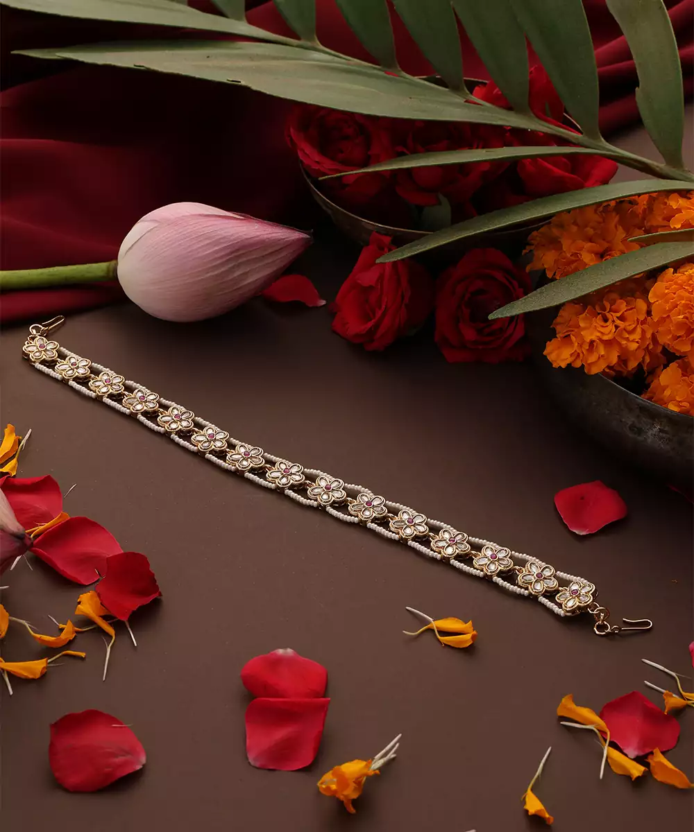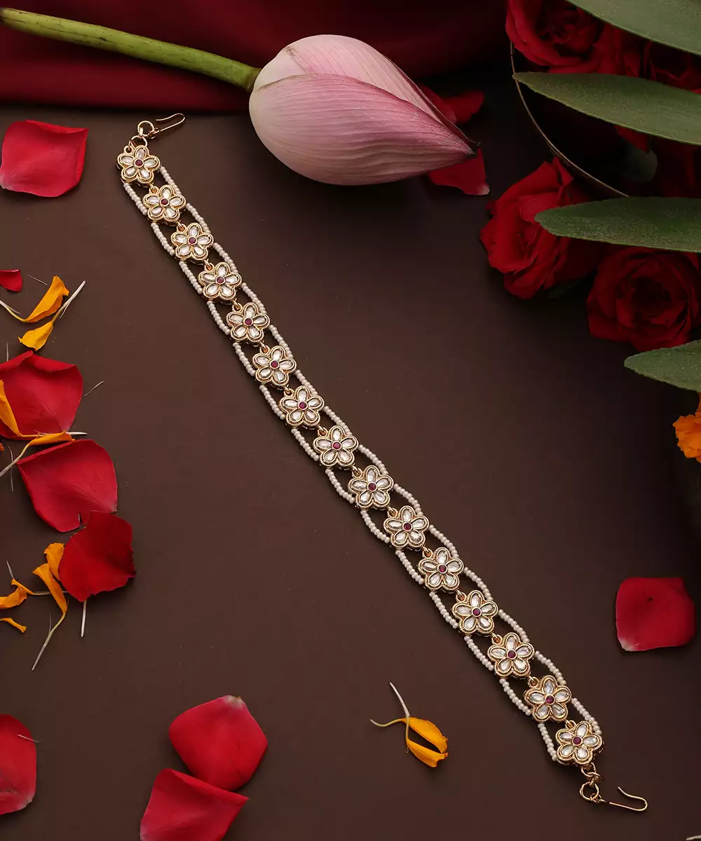 This Gold Plated Kundan Sheesh Phool Is Adorned With Intricate Kundan Work, Exuding Timeless Elegance And Traditional Charm. Perfect For Weddings And Festive Occasions, It Adds A Graceful And Regal Touch To Hairstyles, Enhancing Ethnic Ensembles With Sophisticated Appeal.