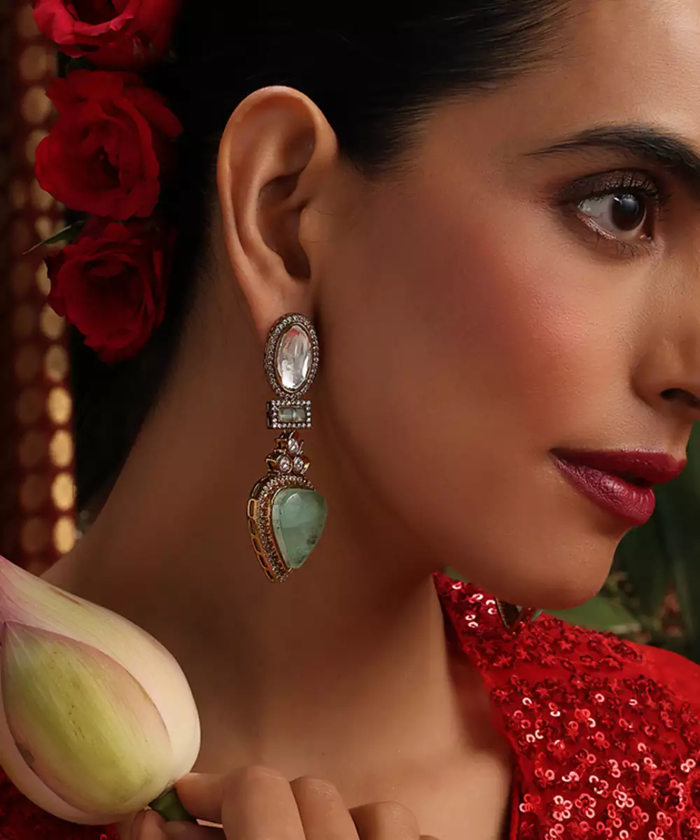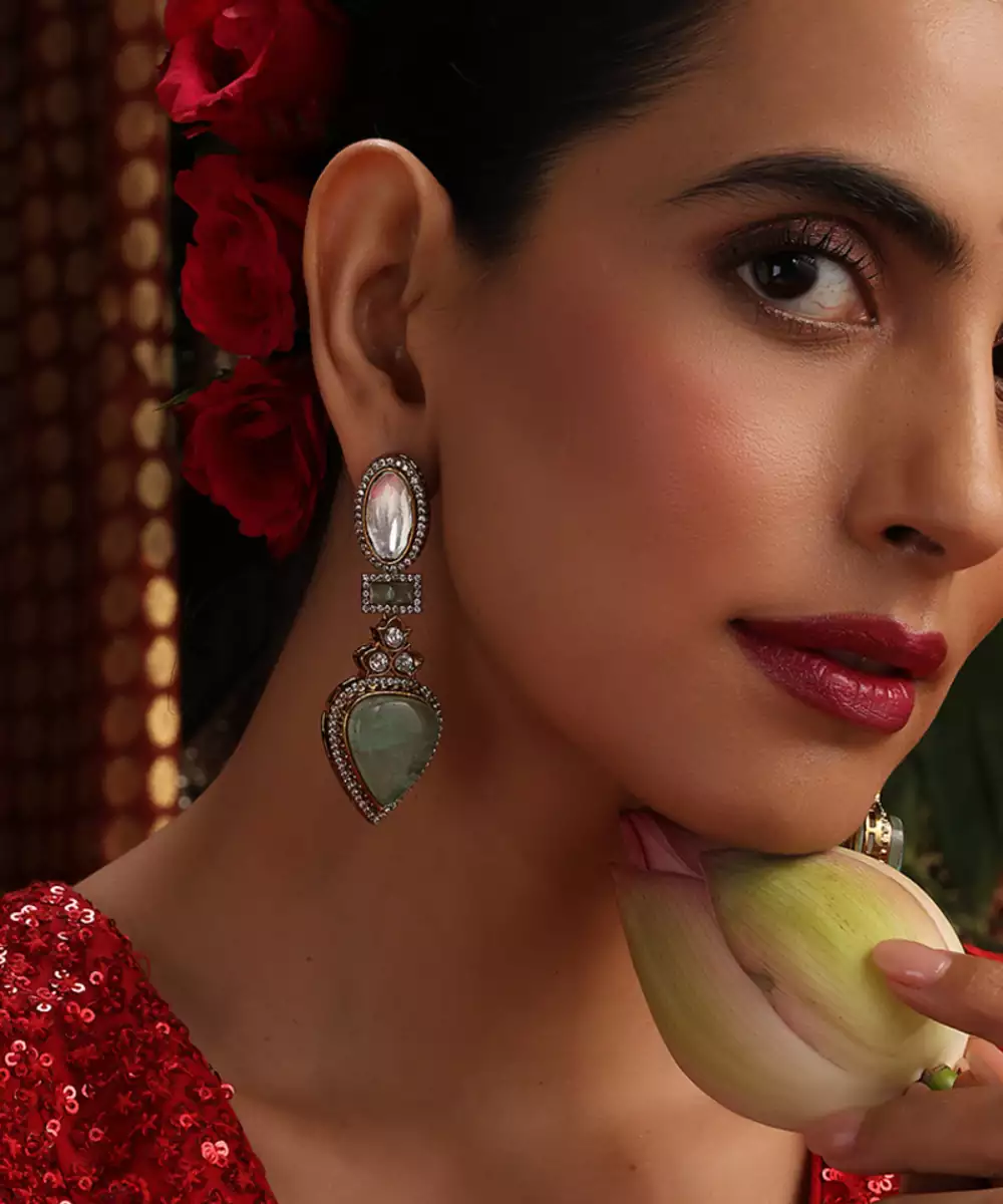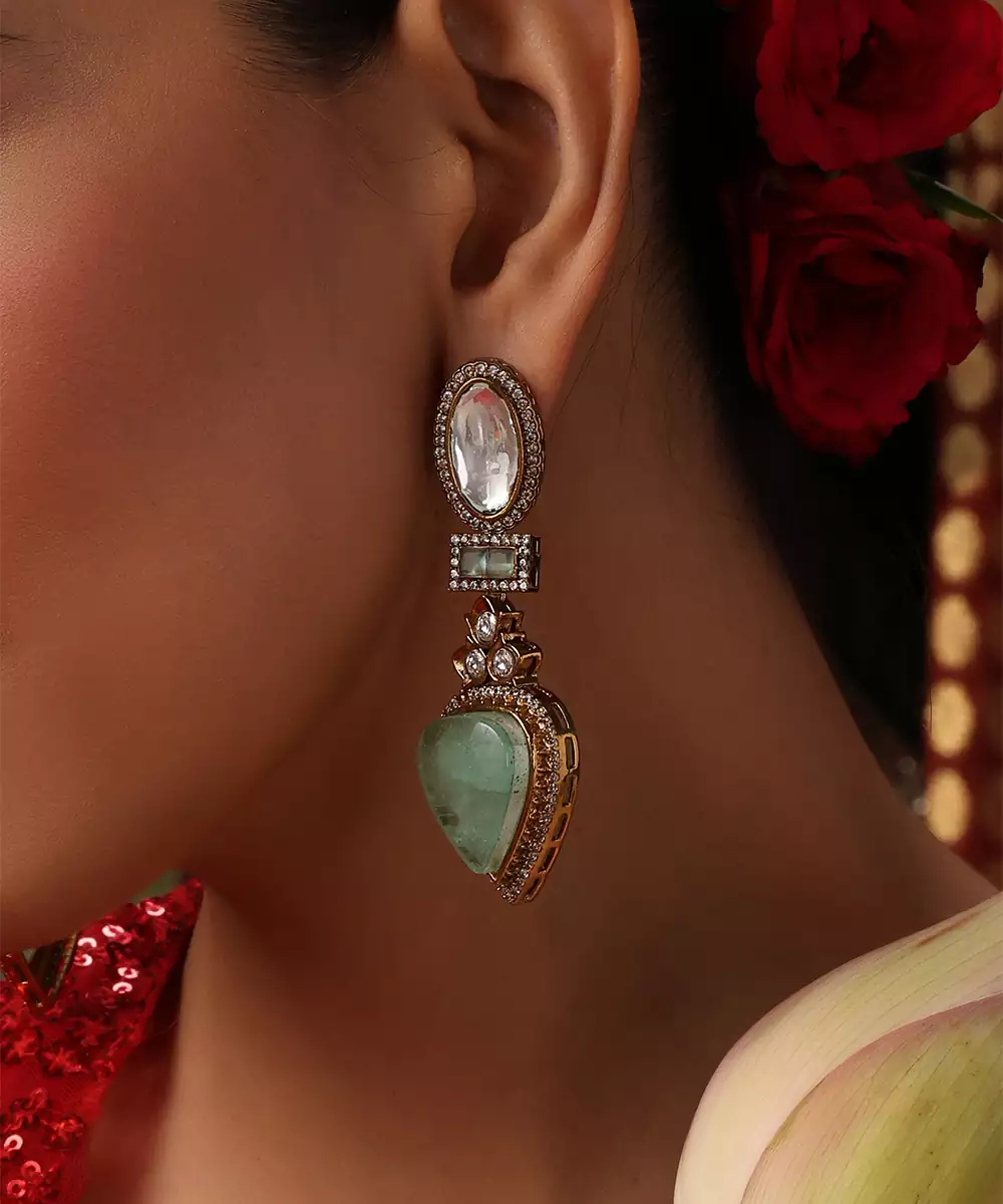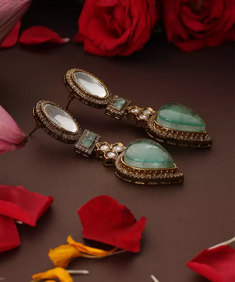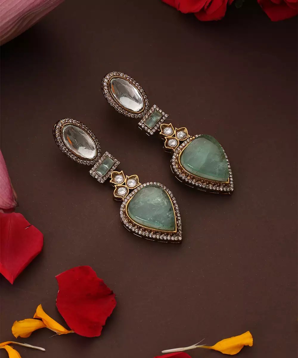 These Gold Plated Kundan Dangler Earrings Are Adorned With Vibrant Green Stones, Exuding Timeless Elegance And Traditional Charm. Featuring Intricate Craftsmanship, They Sway Gracefully To Enhance Festive And Bridal Looks. Perfect For Weddings And Special Occasions, They Add A Sophisticated, Statement Touch To Ethnic Ensembles.