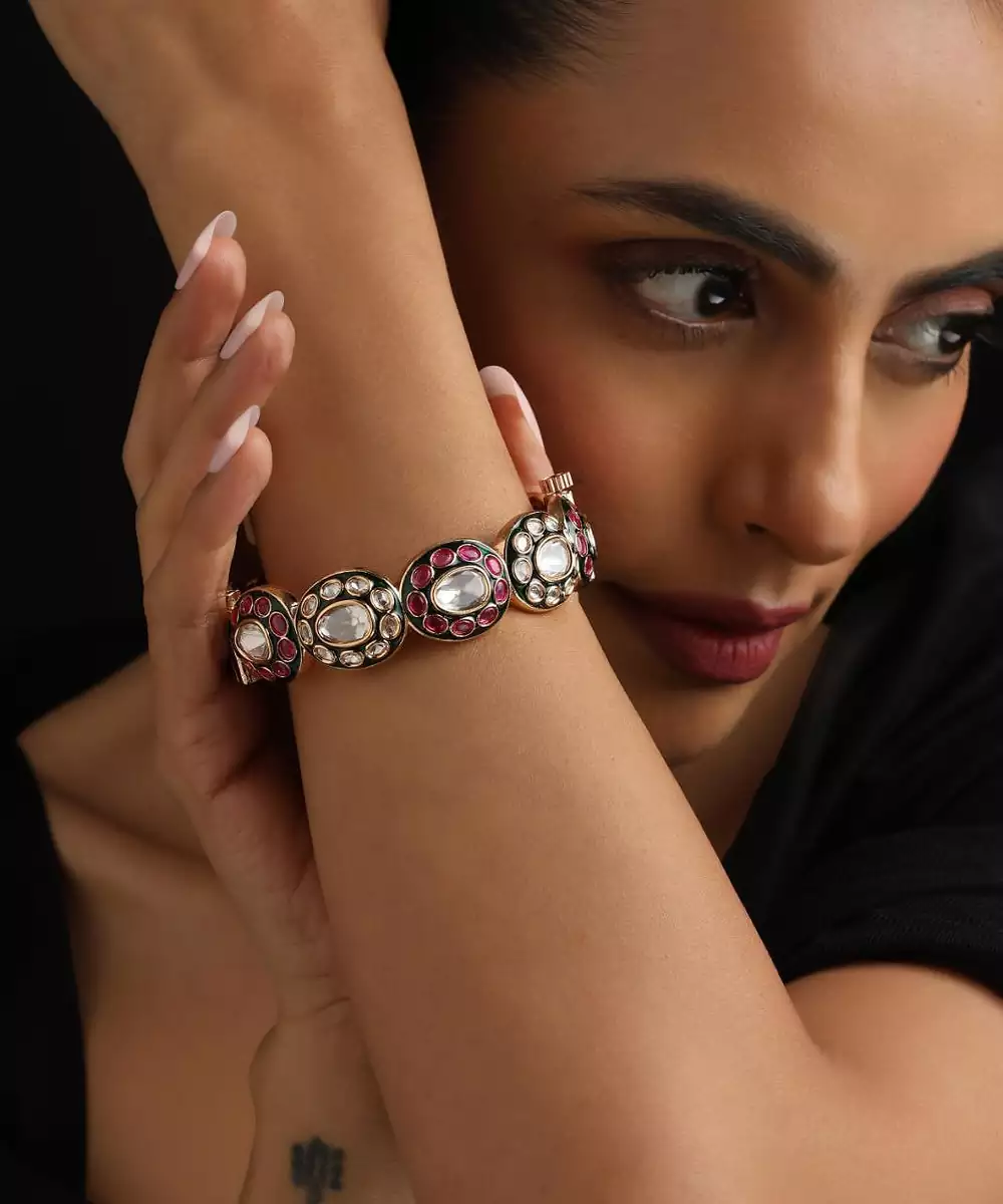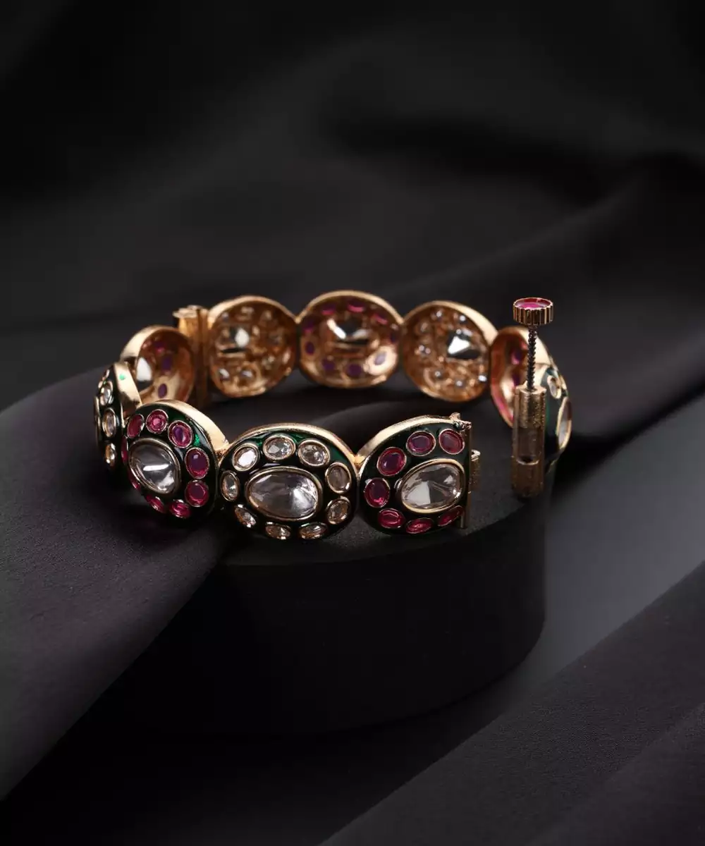 This Gold Plated Multicolor Polki Ring Is A Stunning Fusion Of Elegance And Vibrance. Adorned With Intricate Polki Work And An Array Of Colorful Stones, It Offers A Regal Yet Festive Appeal. The Luxurious Gold Plating Enhances Its Charm, Making It Perfect For Weddings, Celebrations, And Special Occasions, Pairing Beautifully With Ethnic Or Fusion Attire.